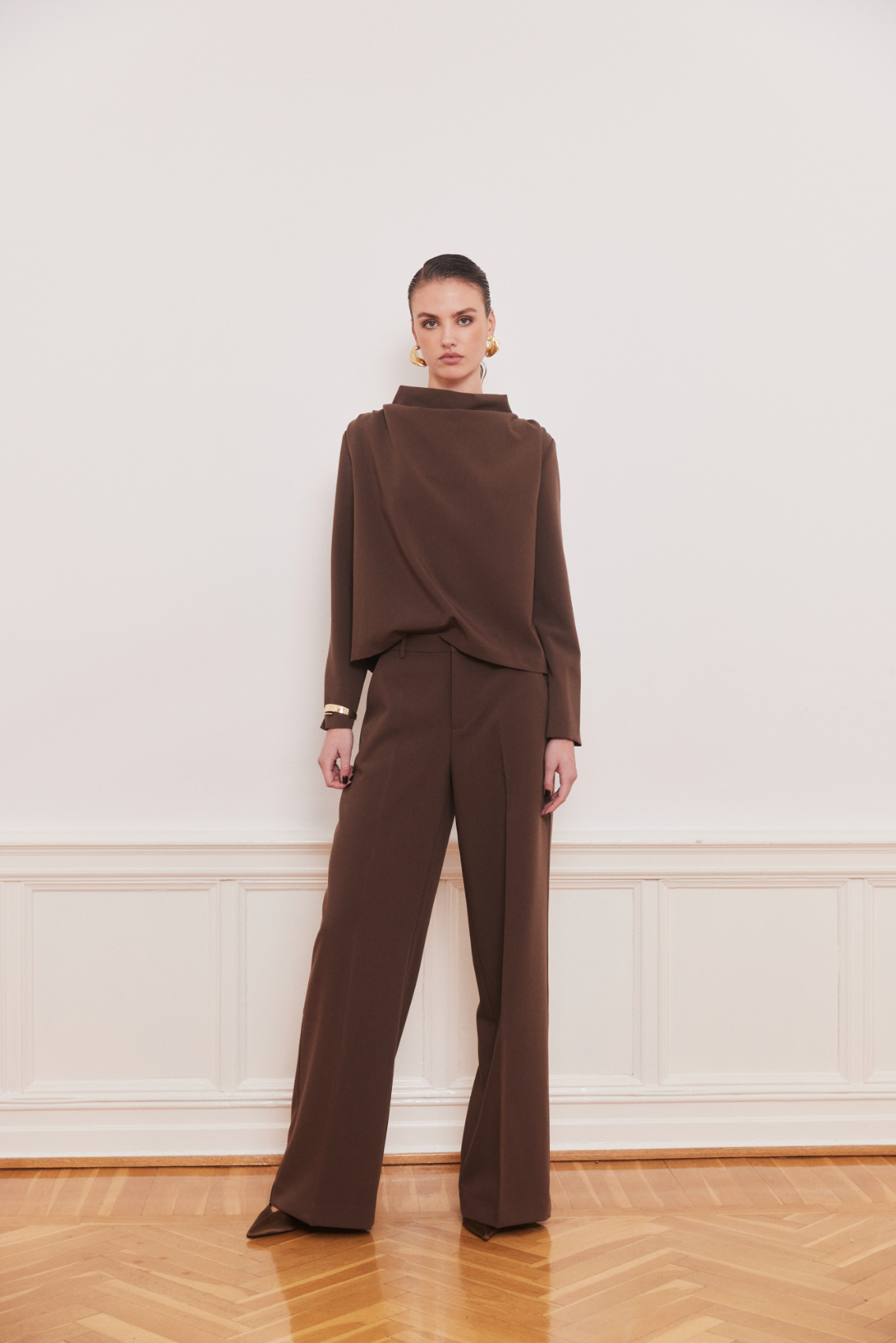 Beverly Top Brown fra Iben. Beverly topp medfødt følelse av casual chic og luksus på samme tid. Laget av en førsteklasses viskoseblanding, har den en rislende, drapert utringning. Samling ved skuldrene for å gi den ekstra dristige uttalelsen. Style med Reign buksen eller med jeans.
