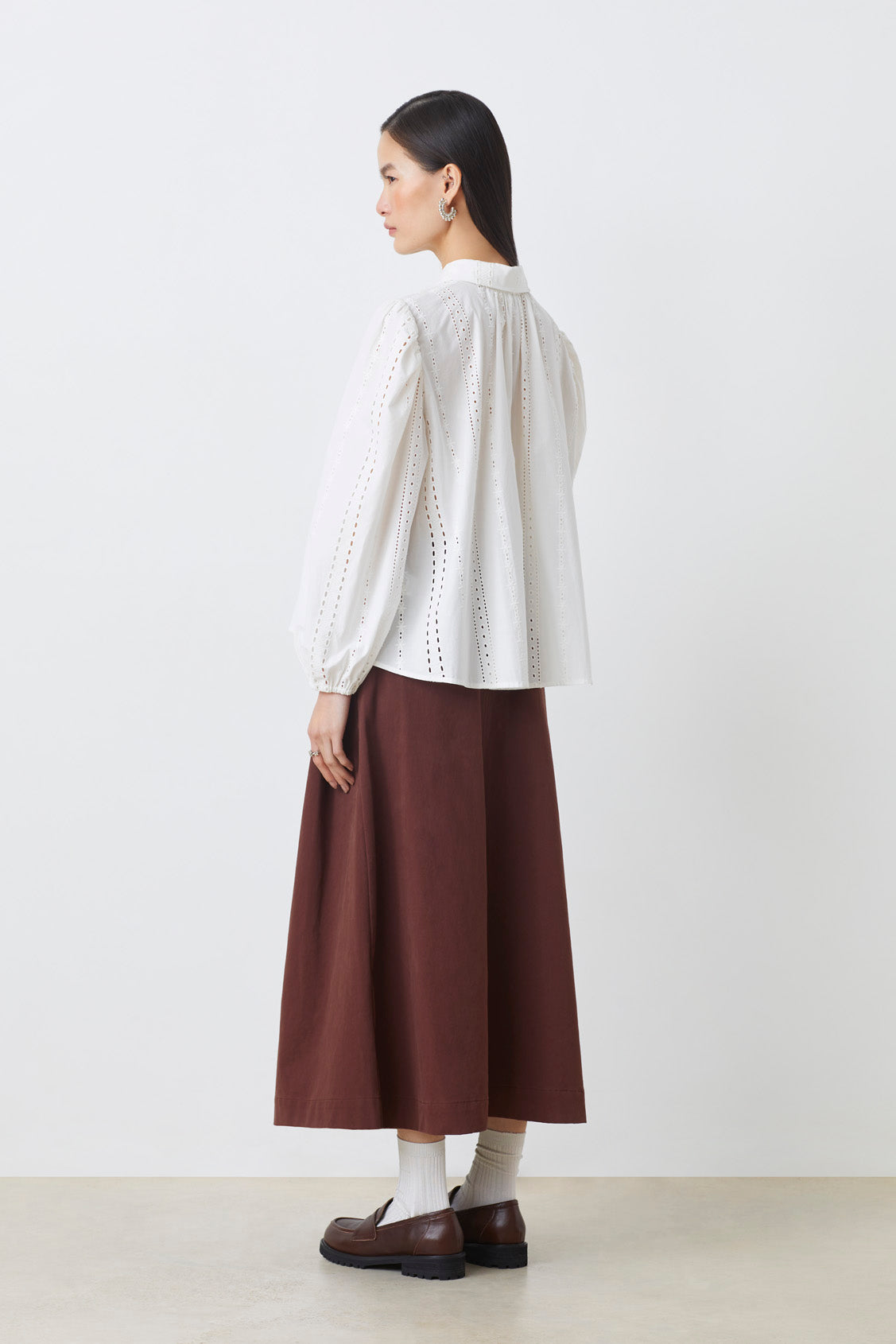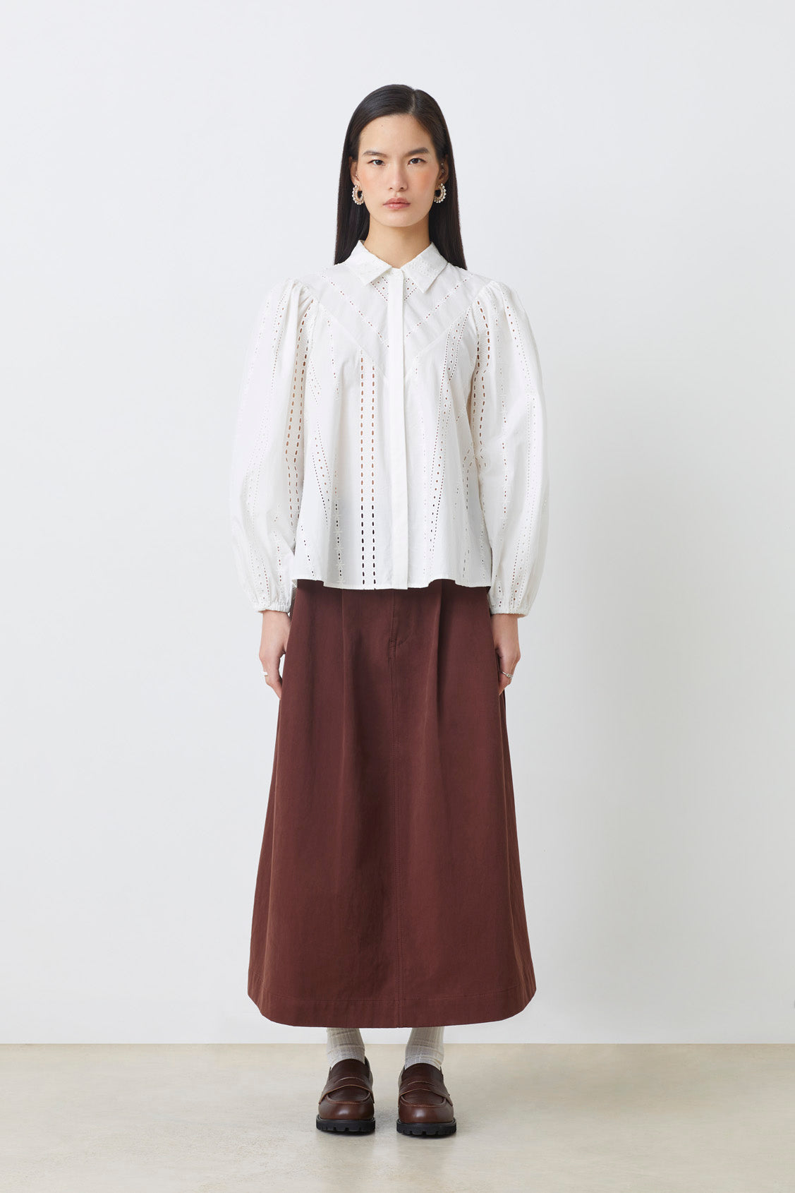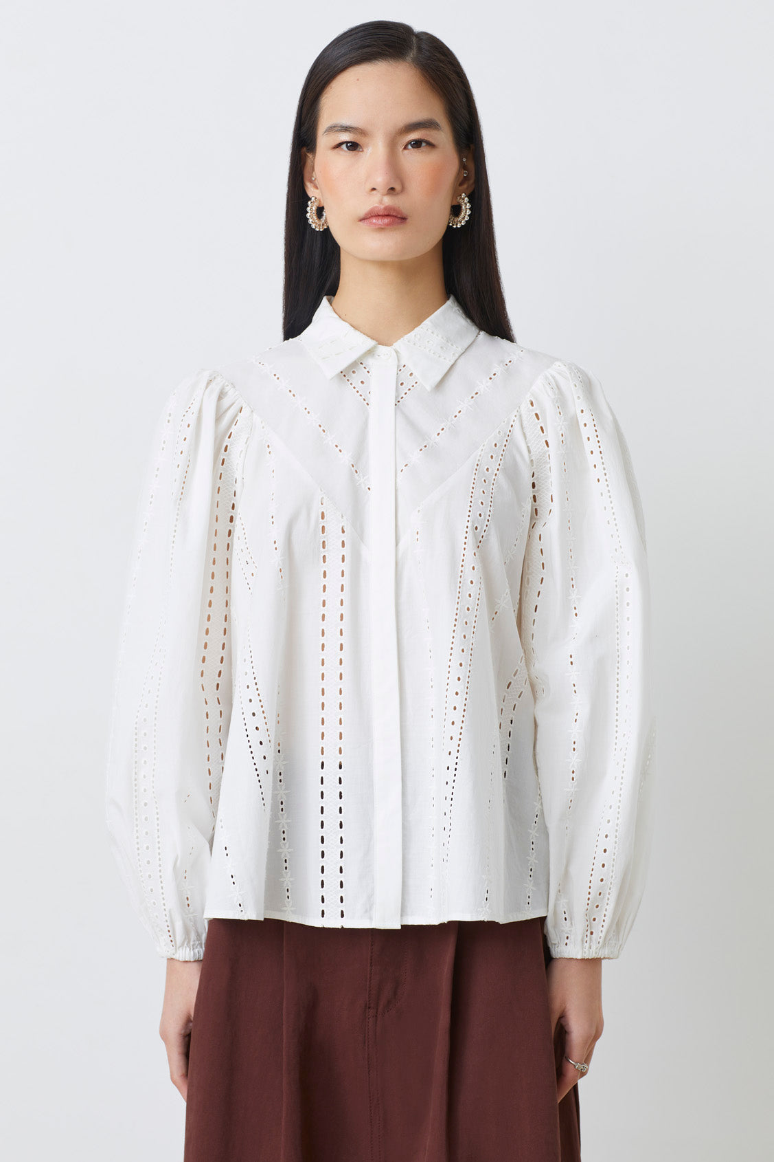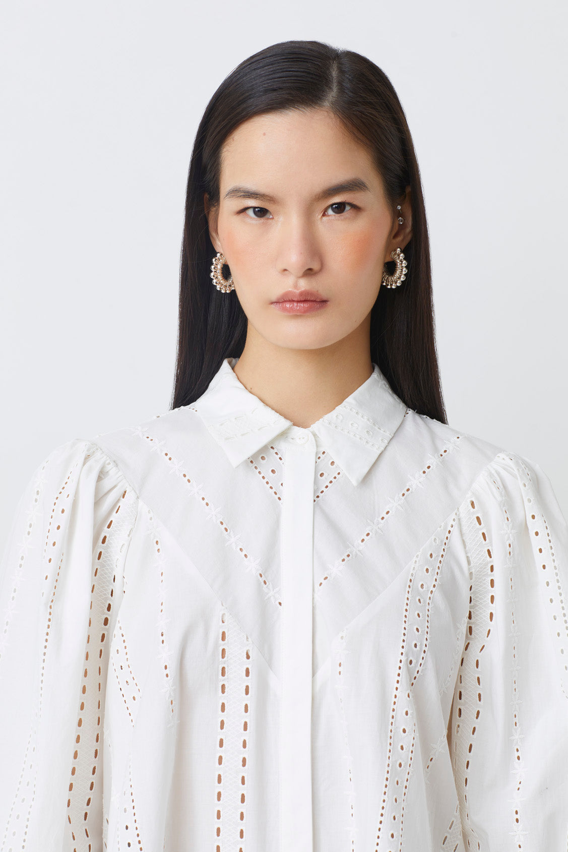 Louane Blouse fra Suncoo er en nydelig elfenbenshvit bluse med cutwork-broderier. Blusen har en rett passform, med lett puffede ermer som samles i strikk ved mansjettene. En raffinert og klassisk bluse som hever det klassiske "Jeans & white shirt"- antrekket, og som enkelt kan styles både opp og ned til anledningen.