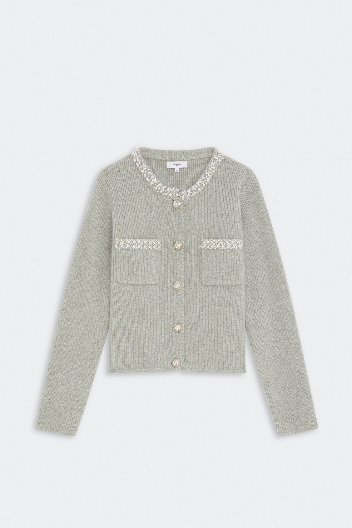 Garvi Jacket fra Suncoo er en klassisk og elegant cardigan - perfekt til kontoret og arbeidsplassen. Jakken har en grå base og rett passform, pyntet med lommer og rund krage med hvite detaljer, med matchende knapper. Jakken sklir rett inn i klesskapet, og passer perfekt inn med årets trendfarger for høsten.