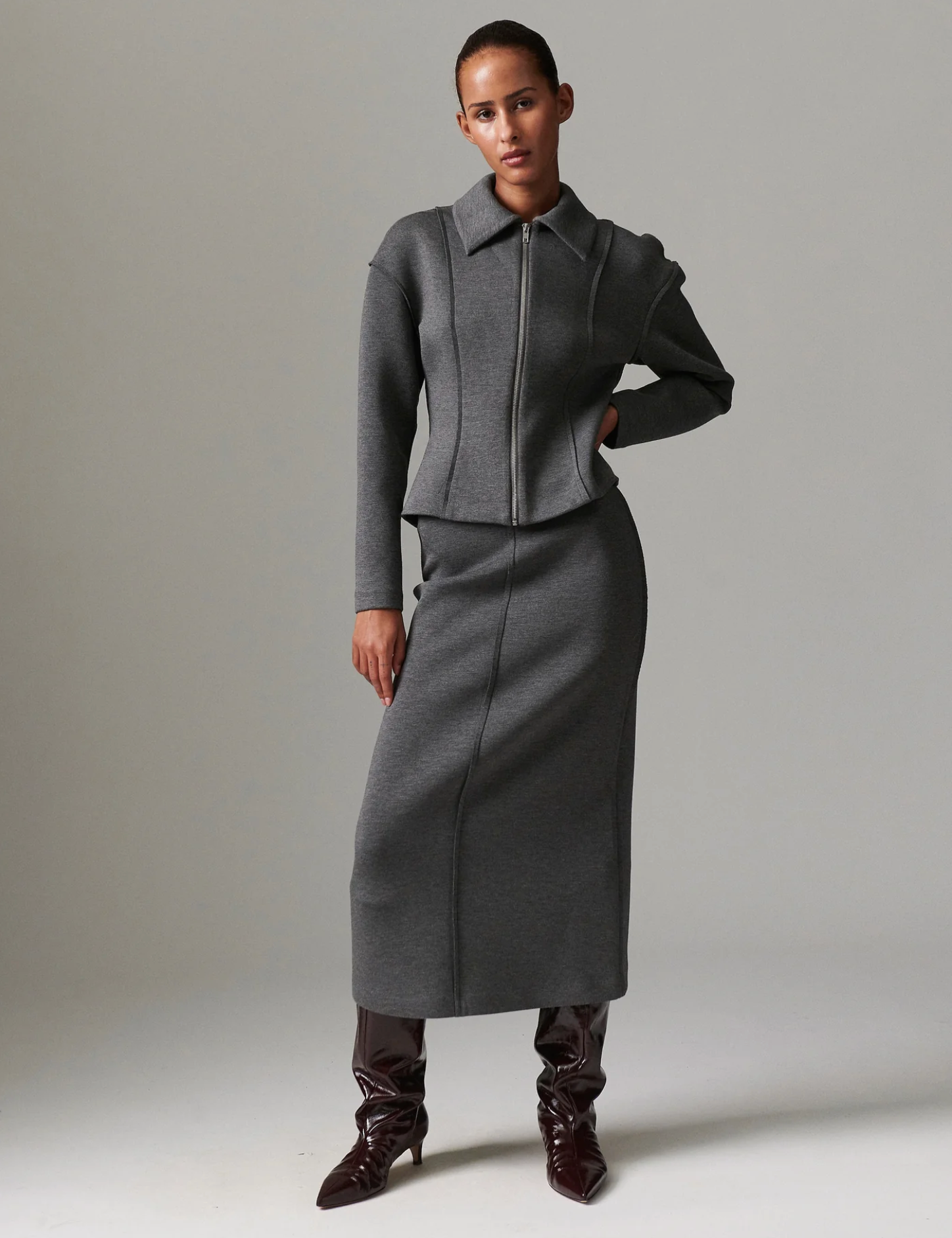 Suzie Scuba Skirt fra DAY er et stretchy A-line skjørt med trekvart lengde. Skjørtet har en elastisk midje og materiale, med sømlinjer langs skjørtets front og sider. Suzie har en ettersittende passform, flatterende til en oversized blazer eller delikat bluse.