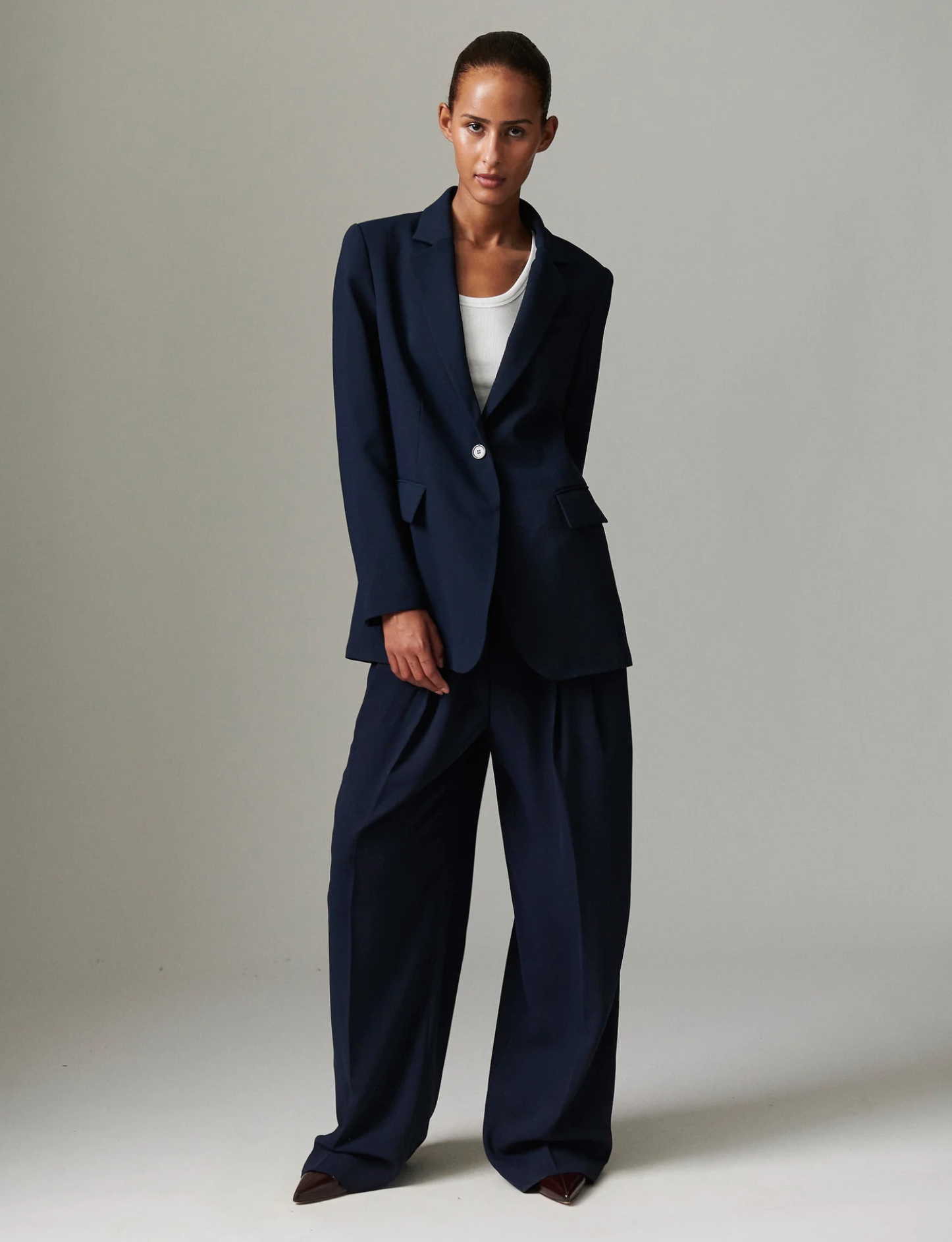 Buksen har et høyt liv, lukkes med hempe og glidelås. Det er rette vide ben med pressekant i front.