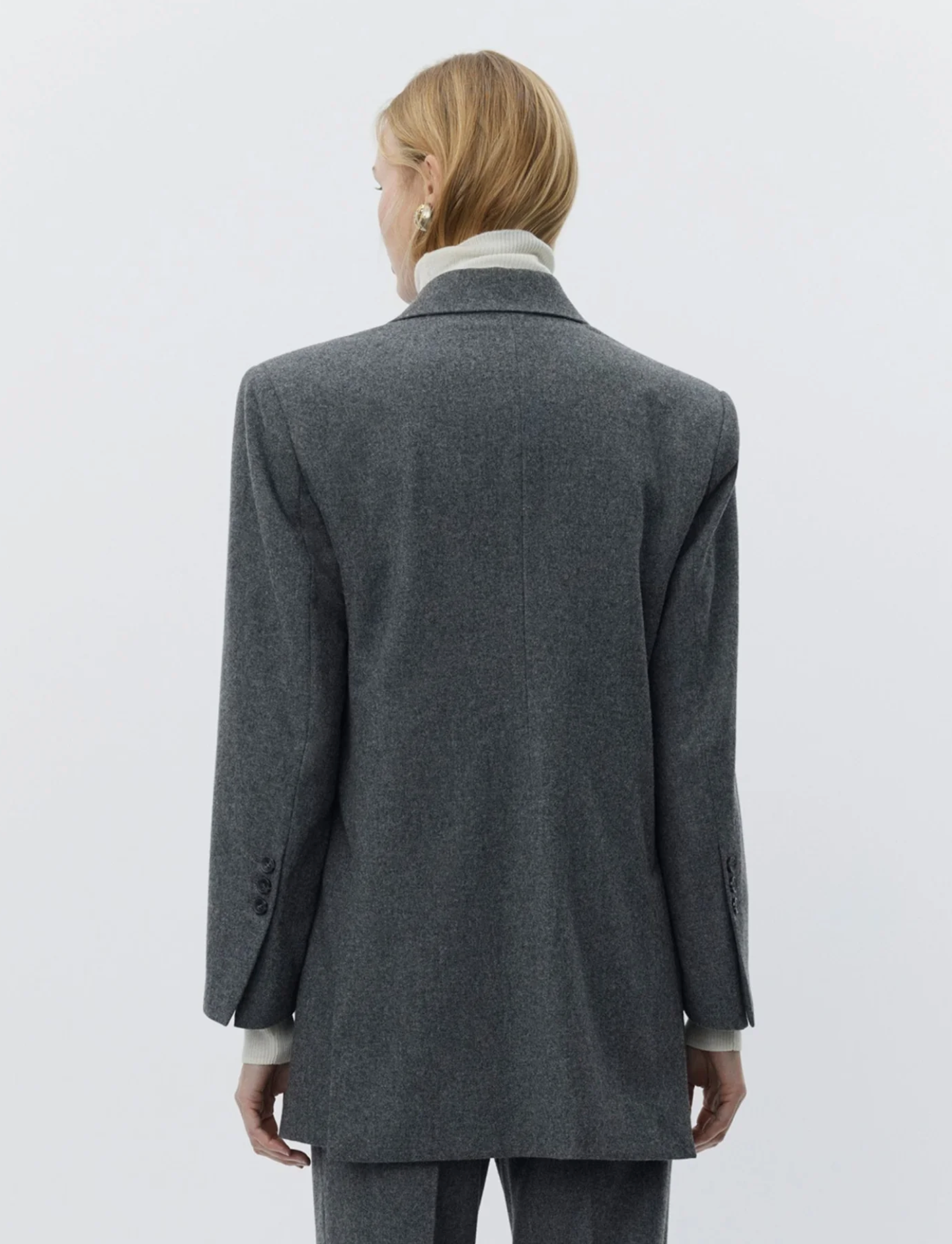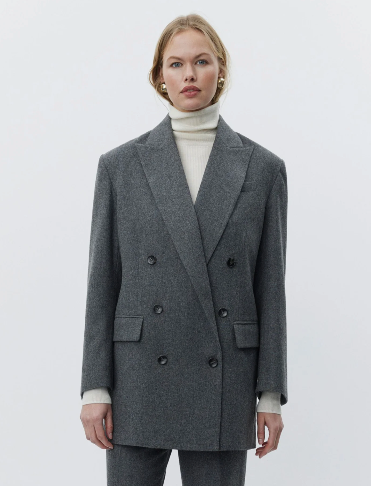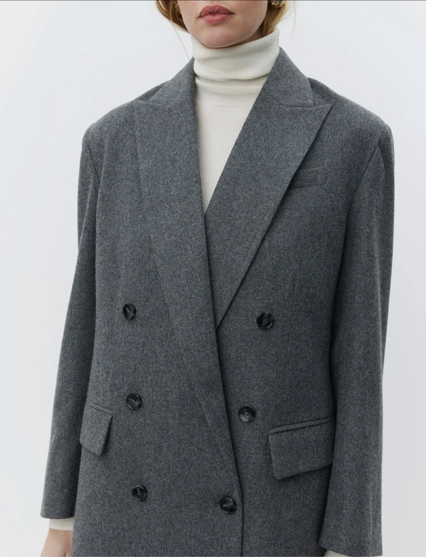 Amir Melange Wool blazer fra DAY er en elegant blazer med rett passform og dobbelt brystning. Blazeren er laget i en deilig ullblanding, med vatterte skuldre, full fôring, brystlomme, innvendig lomme, og to klaffer i front. Amir har en oversized fit, og vi anbefaler å gå ned i størrelse dersom du ønsker en mer fitted look. Style med tilhørende Thalia pants for en monokrom og sofistikert grå base!