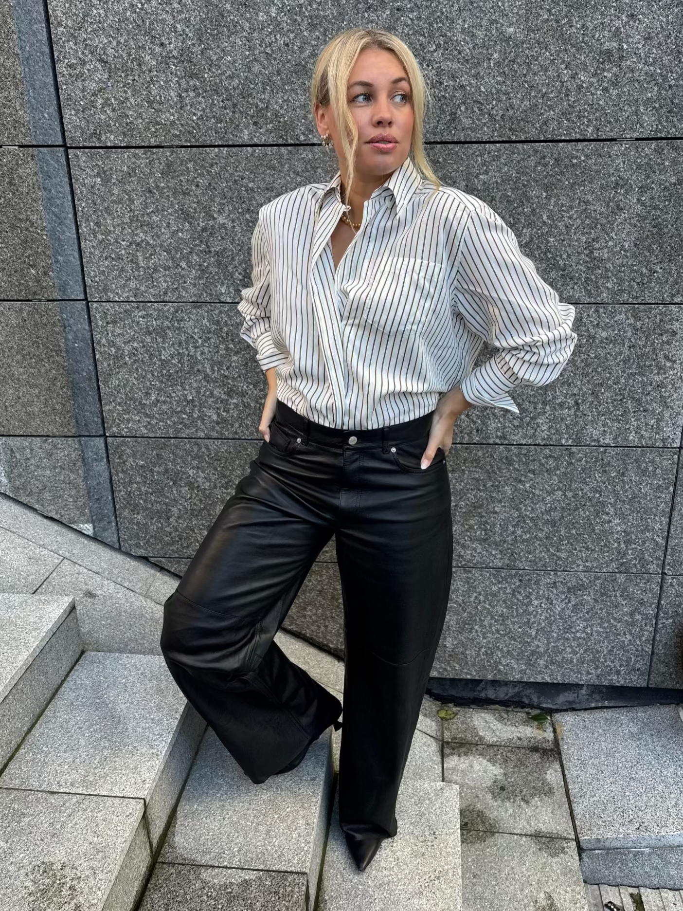 Baggy Leather pants fra Dagmar er en mid-rise lang bukse, laget av mykt lammeskinn som tilbyr en avslappet passform med vide ben, og en klassisk 5-pocket frame. De sorte buksene gir en god balanse av sofistikasjon og avslappet stil, som gjør de enkle å style til ulike anledninger.