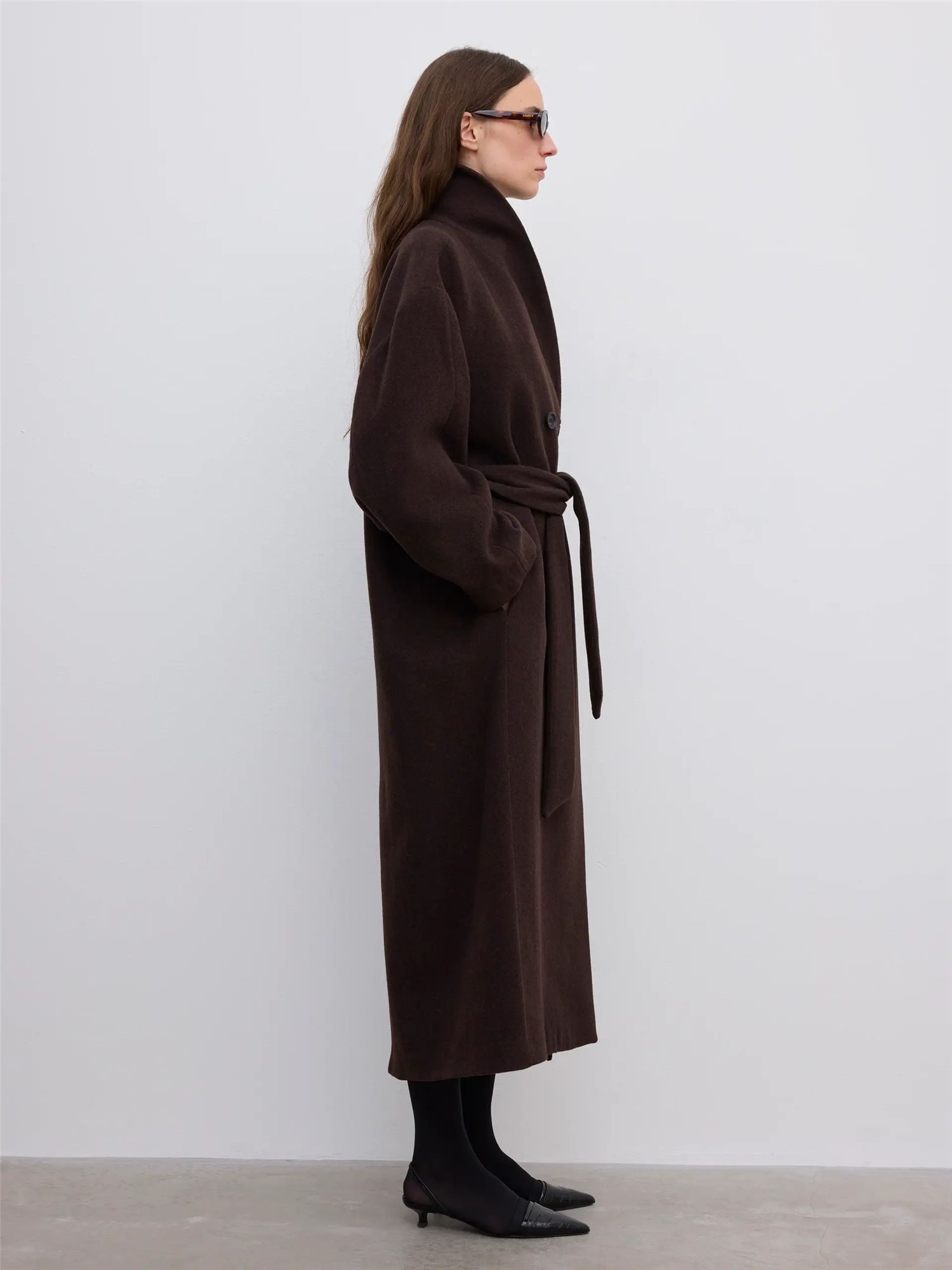 Relaxed Wool Coat Chocolate Brown fra DAGMAR. En dobbeltspent lang kåpe laget av varmende ull, med en myk kokongsilhuett, senkede skuldre, avrundede ermer og sjalkrage. Den har lommer, et avtakbart belte og håndsydde detaljer. Beltet kan festes slik du ønsker. Kåpen er helforet, og perfekt til kaldere dager.