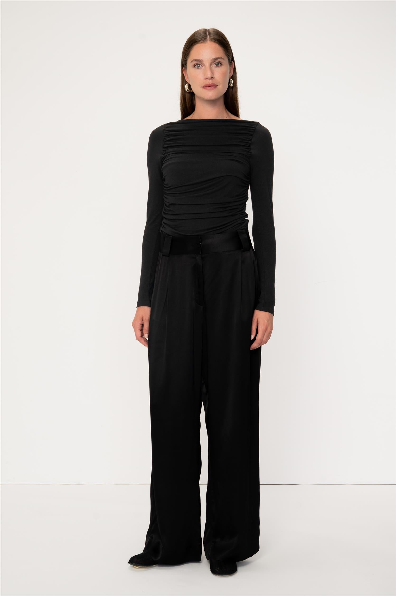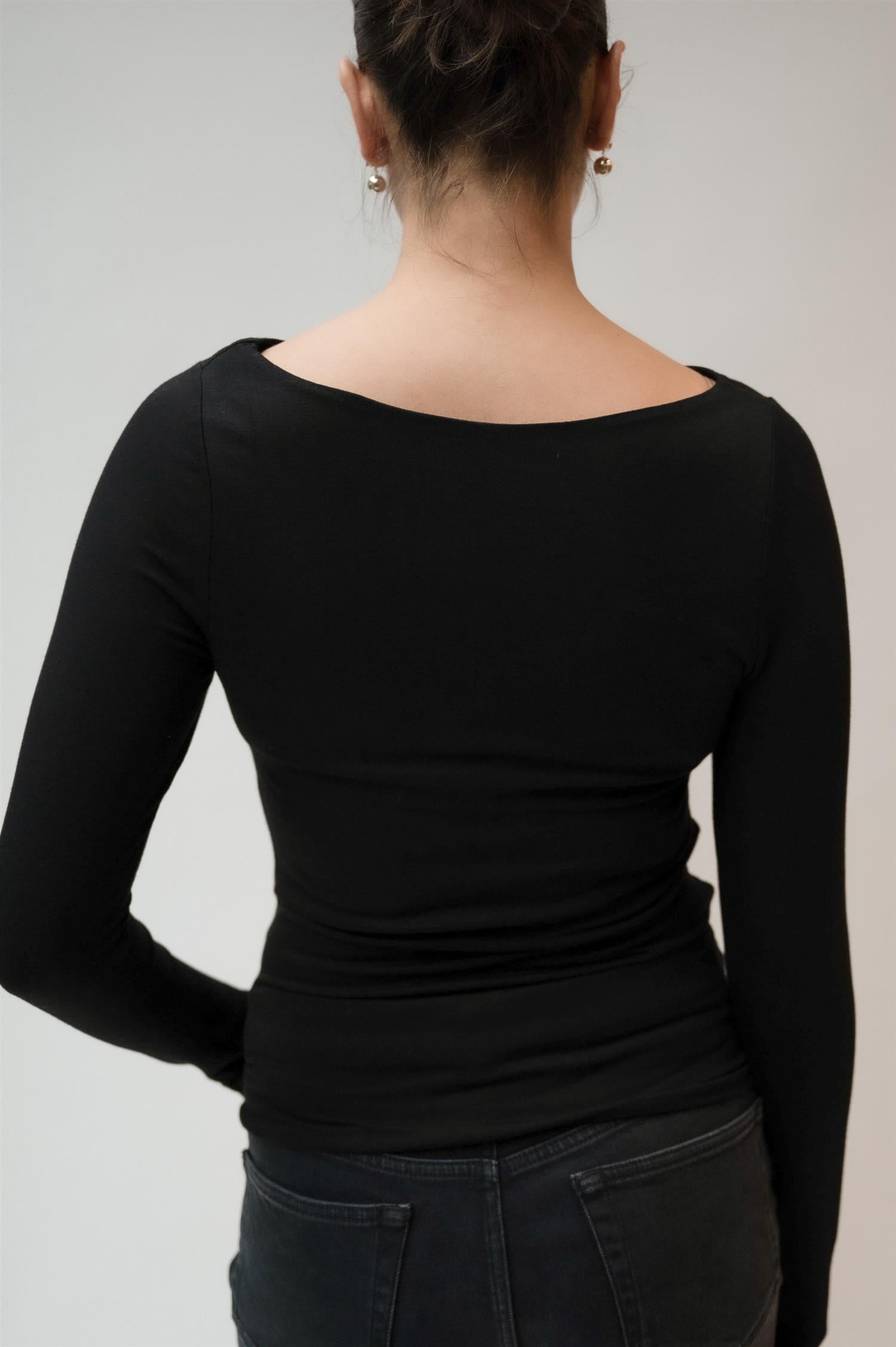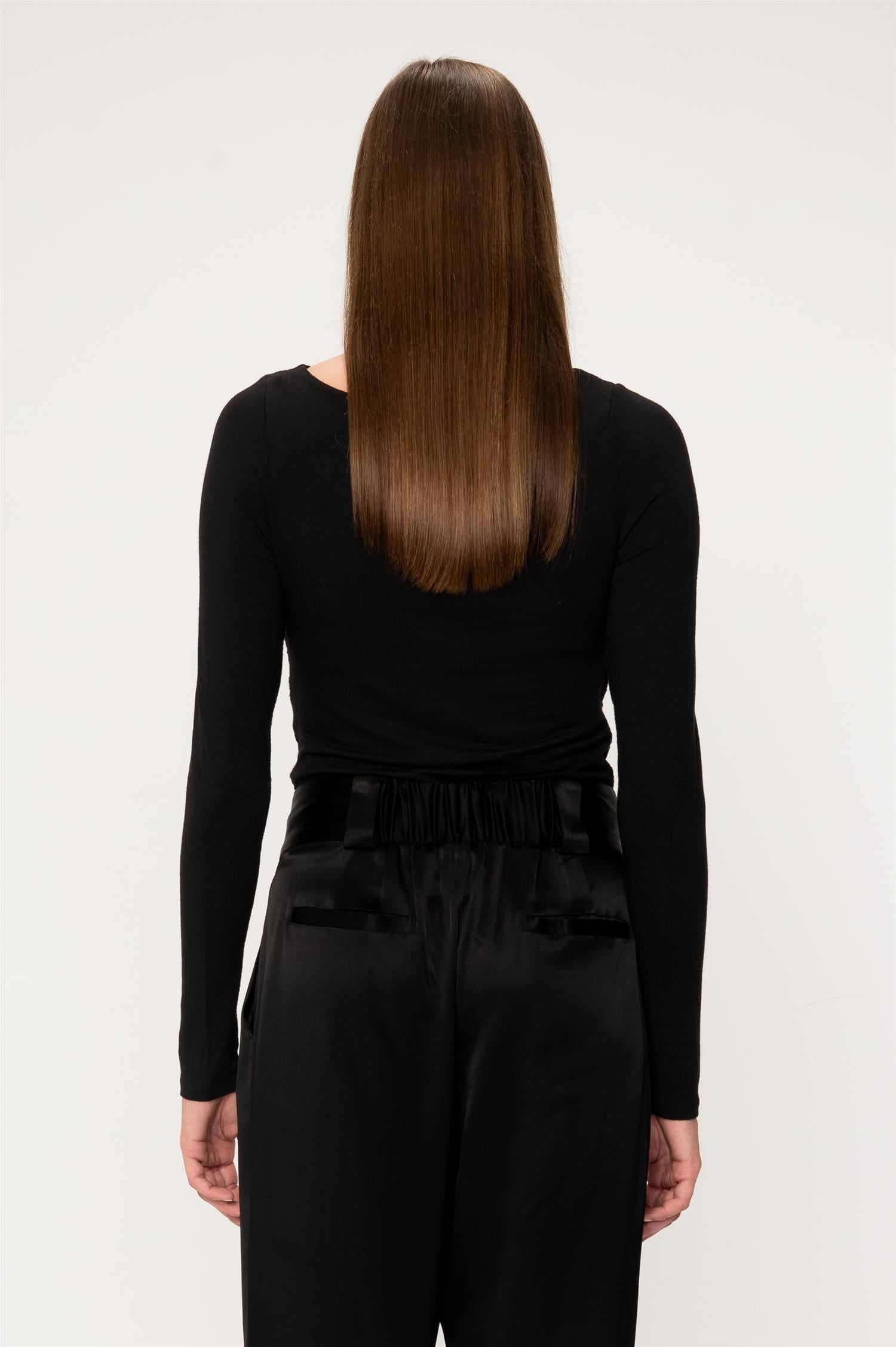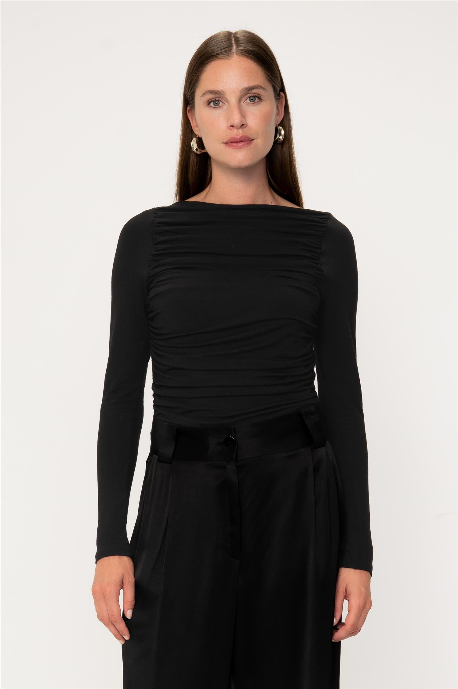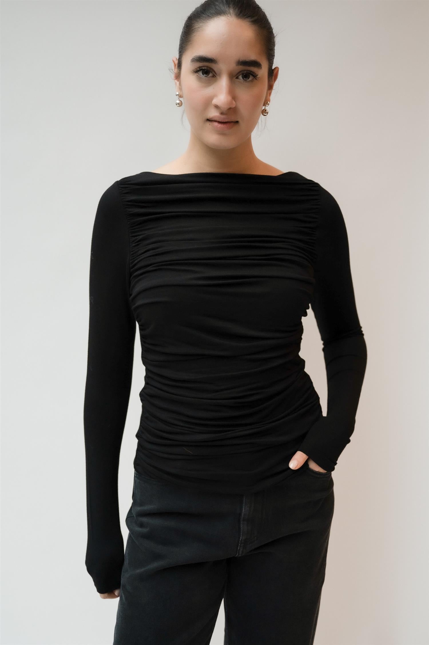 Sabik top black fra Viveh er en ettersittende topp med lange ermer og en dobbel fôret body. Toppen har samlede sømmer på sidene, som skaper vakre horisontale draperinger. Toppens bakside har en glatt form, og kan bæres som fremside for en enklere og mer allsidig genser.
