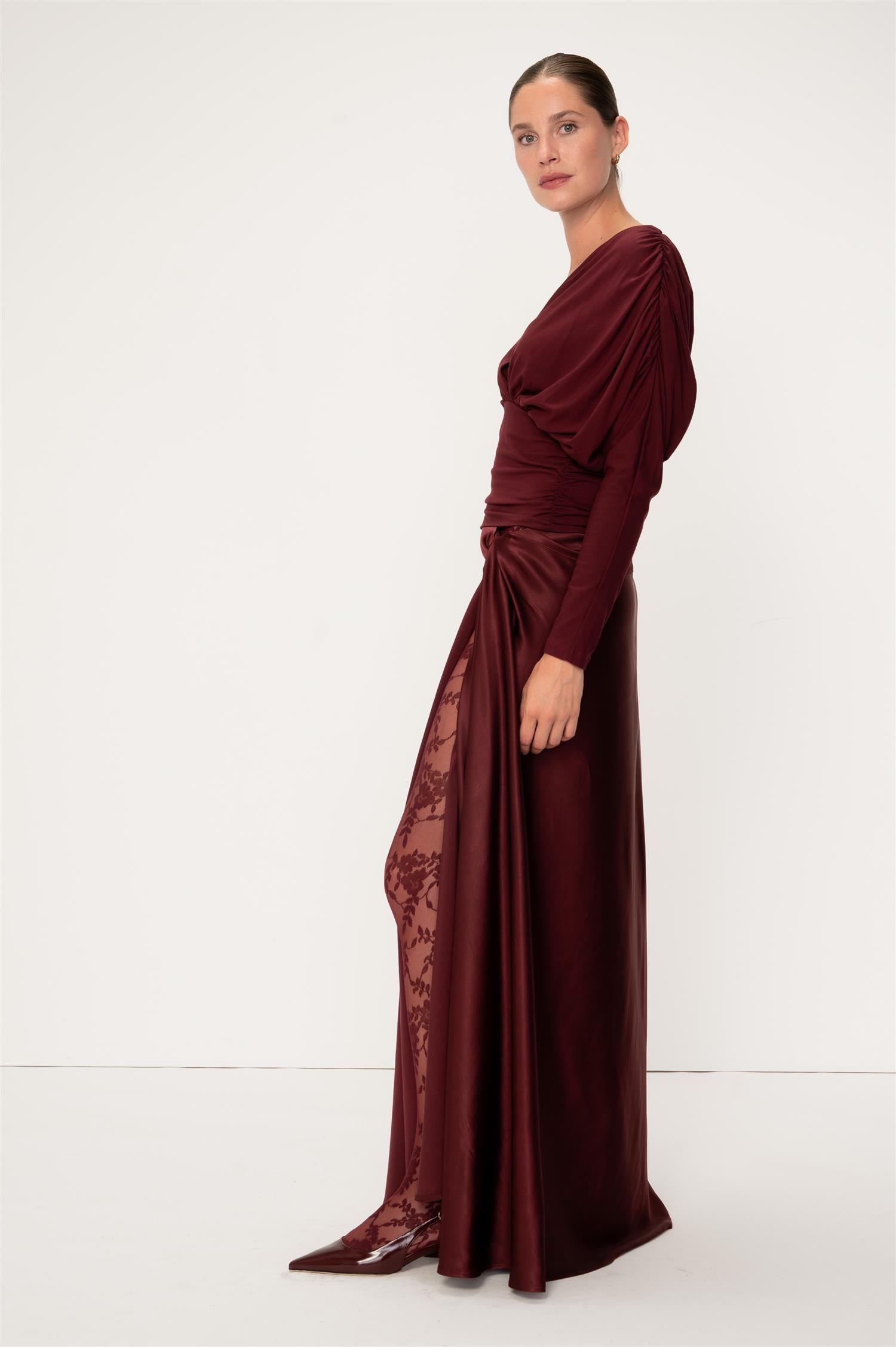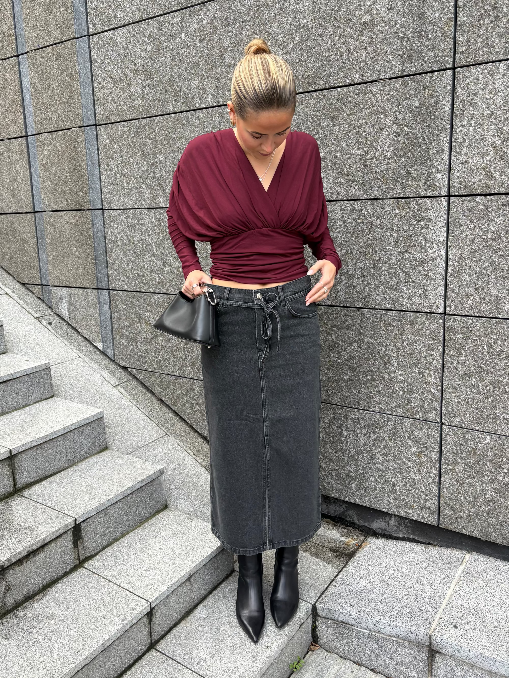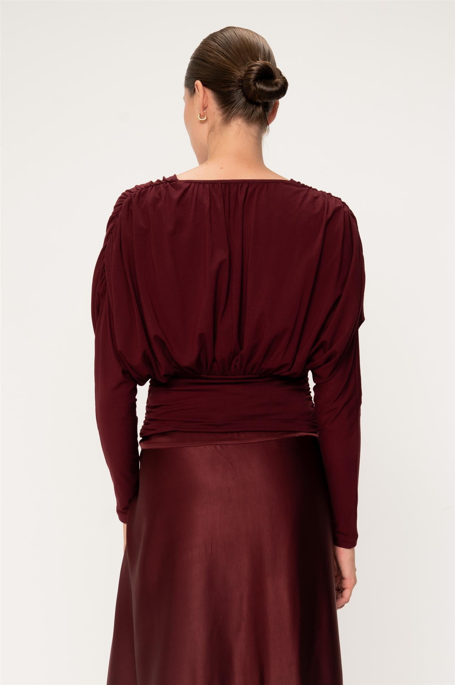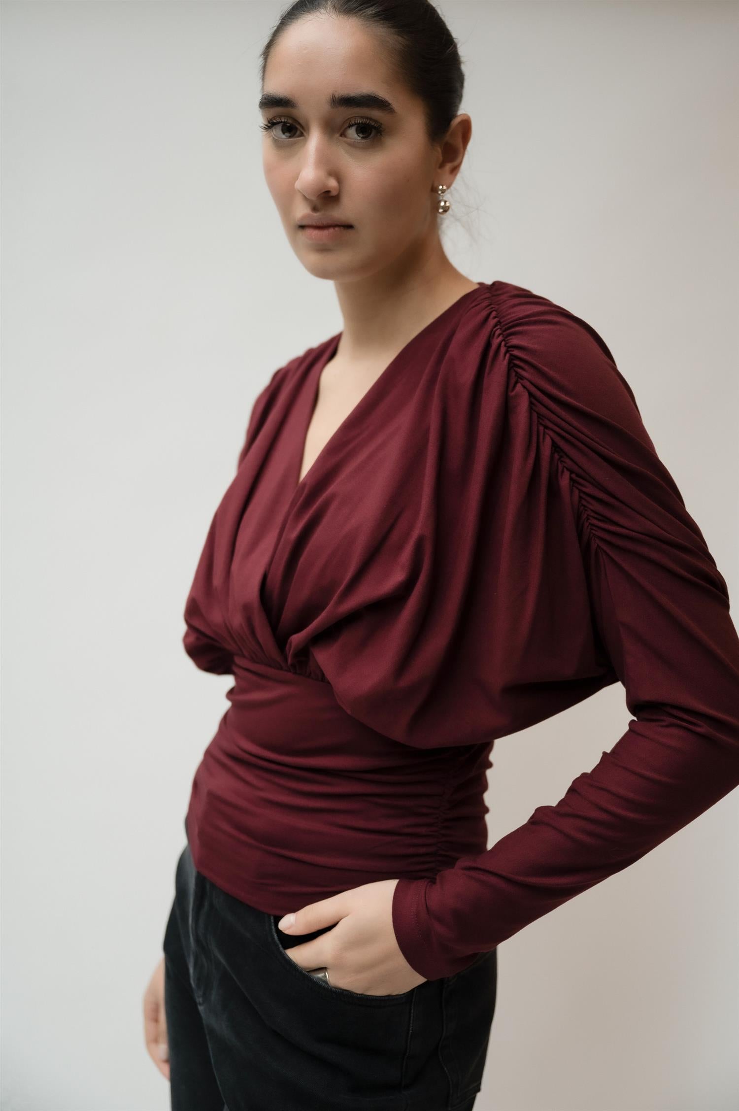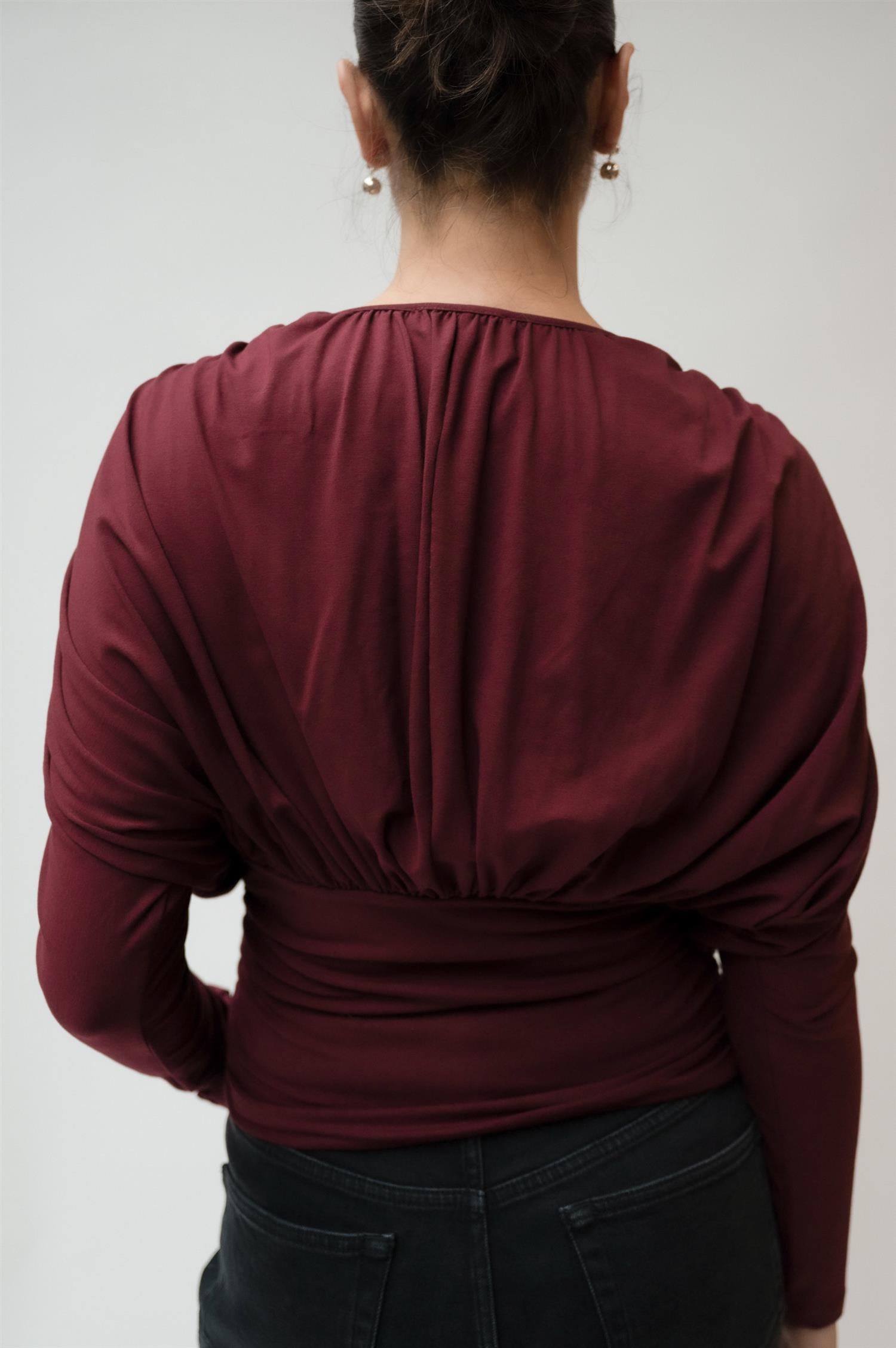 Salvia Top Burgundy fra Viveh. Salvia-toppen er laget med VIVEH-signaturstoffet, en ECOVERO™ viskosejersey som drapererer vakkert og sitter tett rundt kroppen. Smykket er langermet med løs passform på skuldrene og tettsittende midje. Salvia er allsidig ettersom den kan brukes på to måter, med en moderne, elegant høy utringning eller en V-hals for en mer klassisk, glamorøs look.
