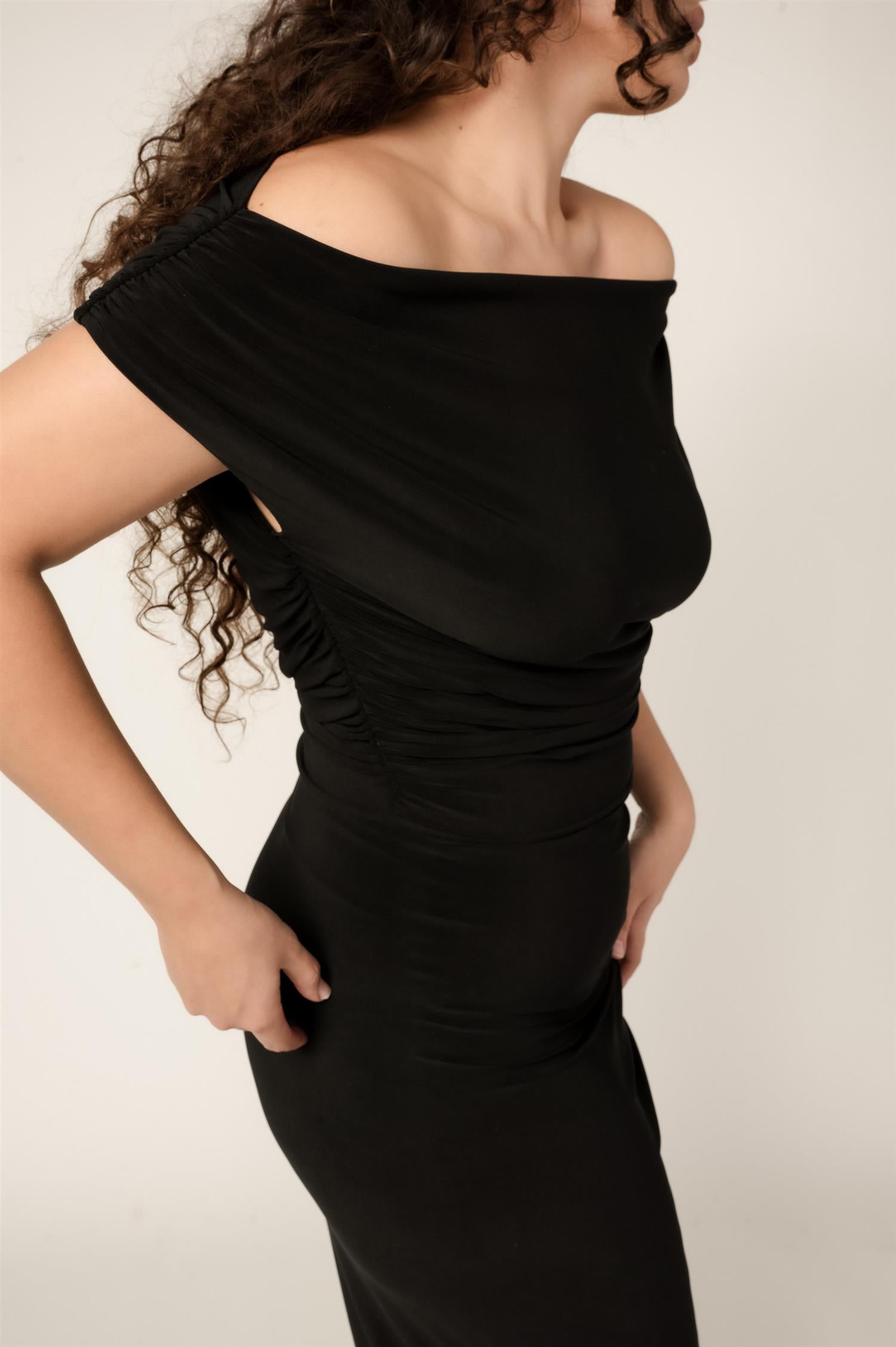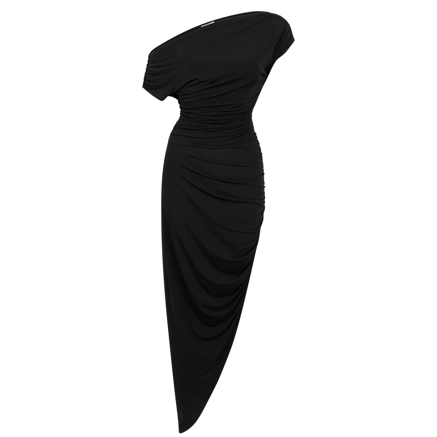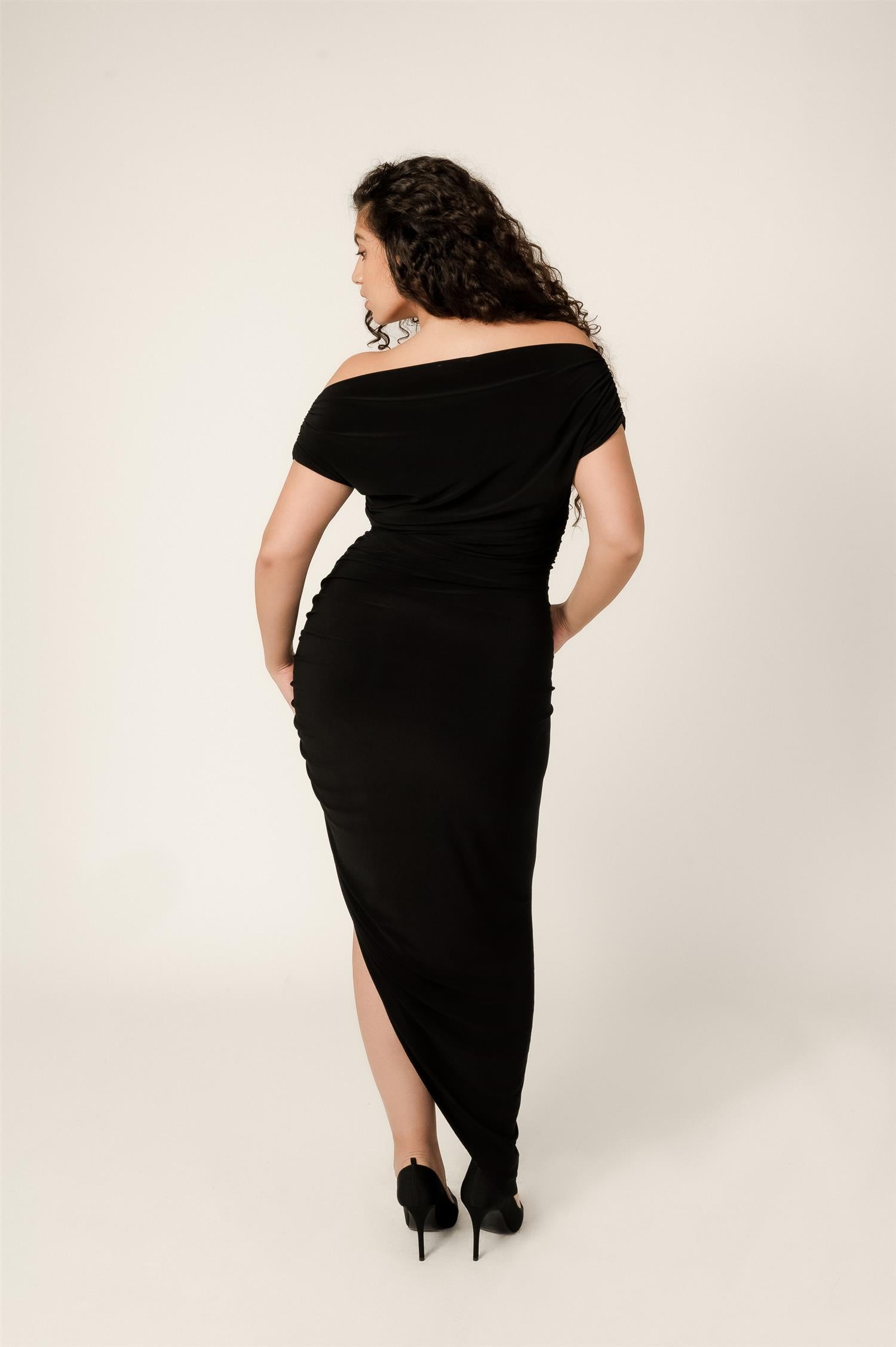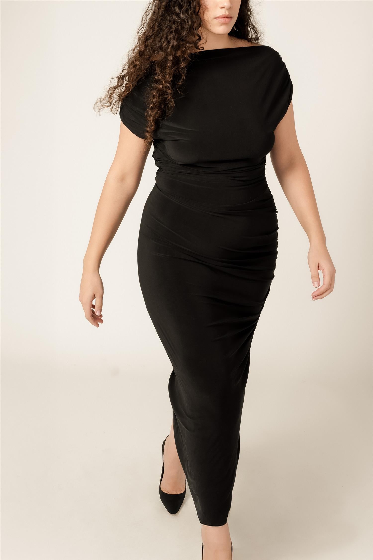 Columbine dress black fra Viveh er en asymmetrisk kjole med vakre draperinger på tvers av kroppen. Kjolen har en vid neckline, og et klassisk snitt med ankellengde. Den perfekte kjolen i kombinasjon med "Garment clip" for en elegant look.