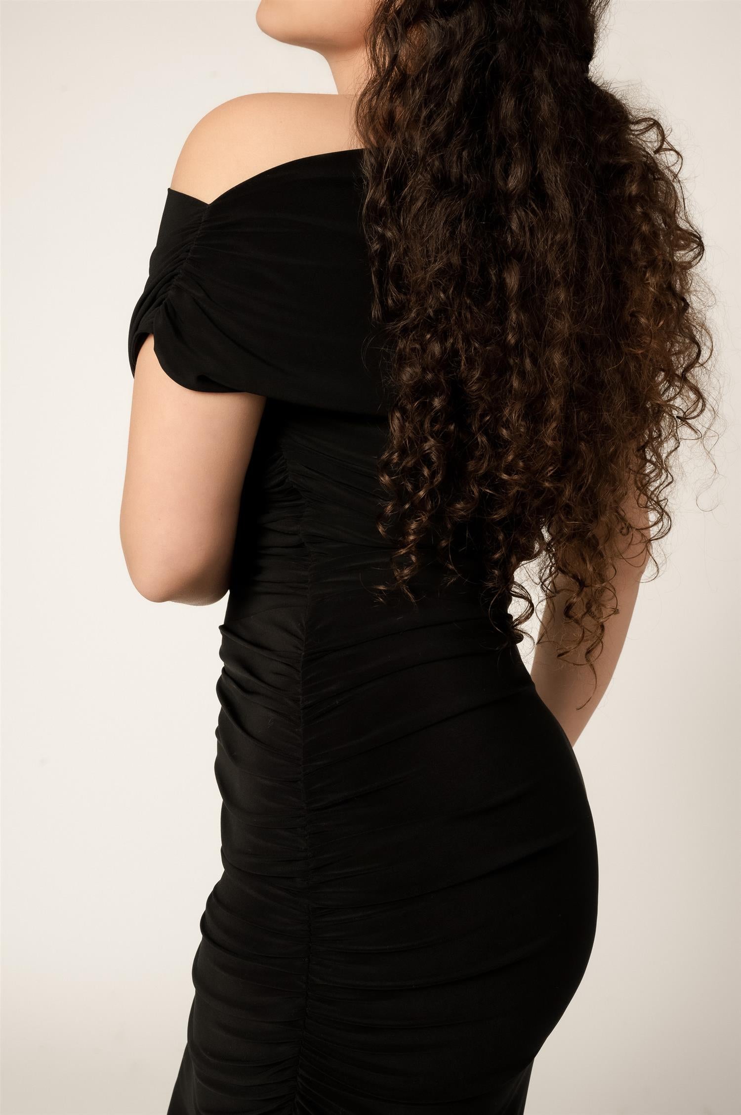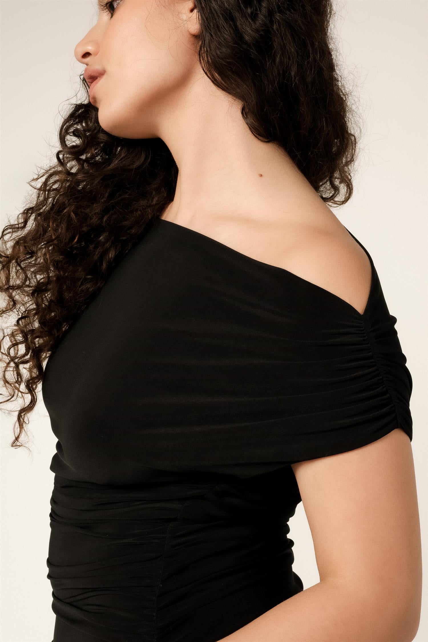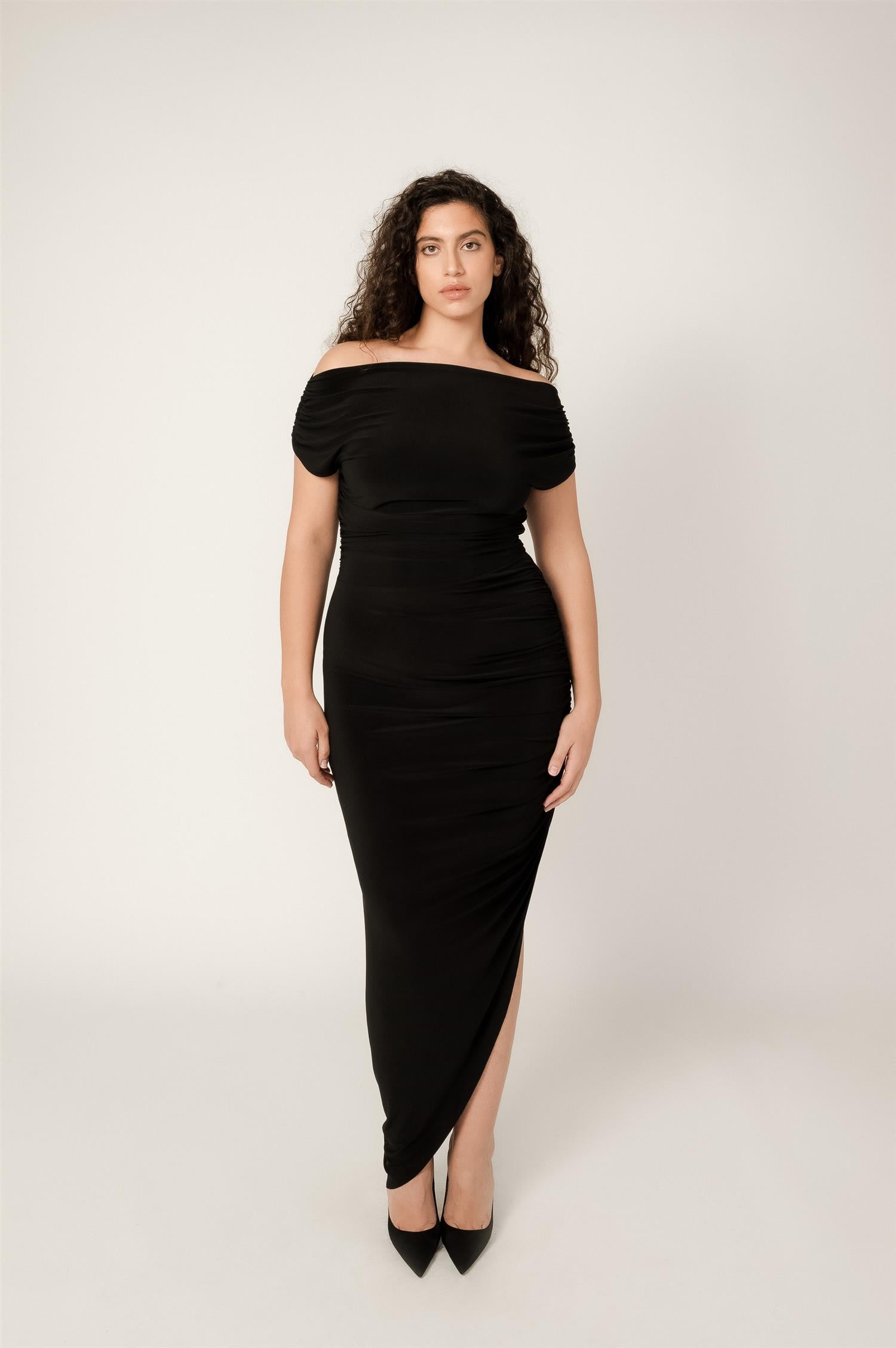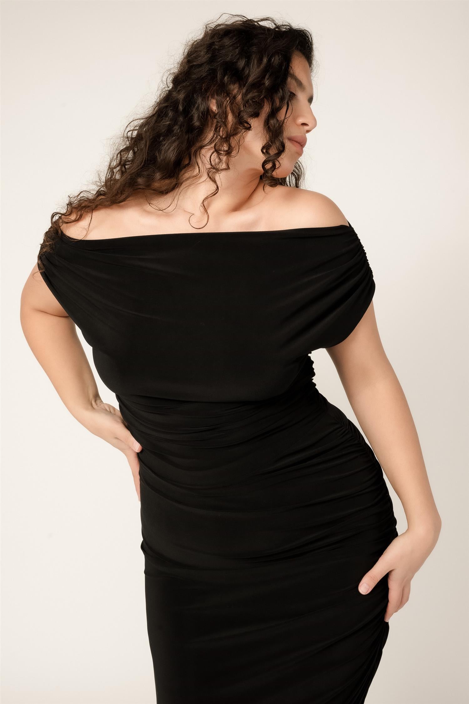 Columbine dress black fra Viveh er en asymmetrisk kjole med vakre draperinger på tvers av kroppen. Kjolen har en vid neckline, og et klassisk snitt med ankellengde. Den perfekte kjolen i kombinasjon med "Garment clip" for en elegant look.