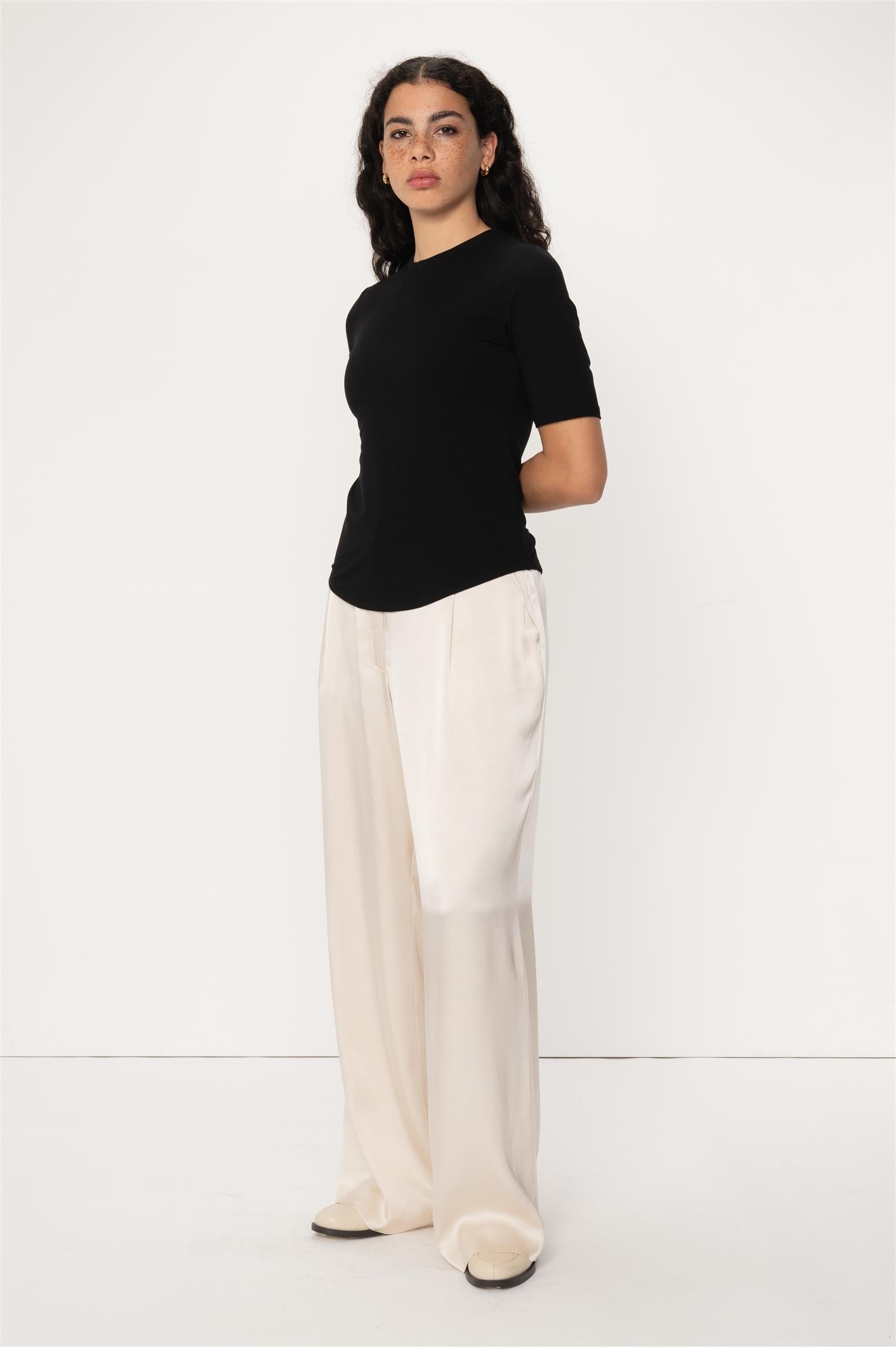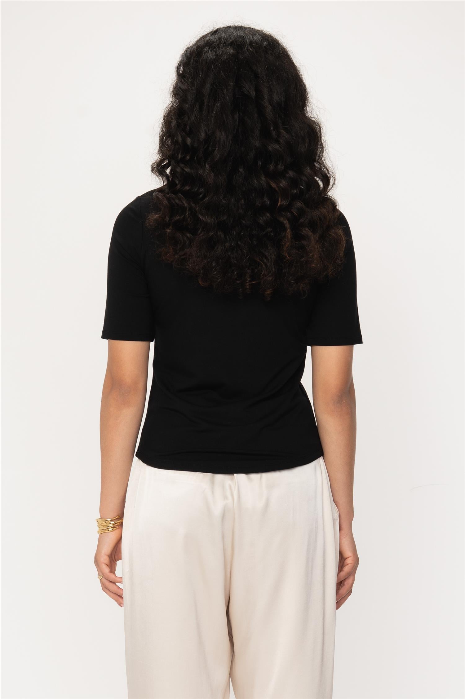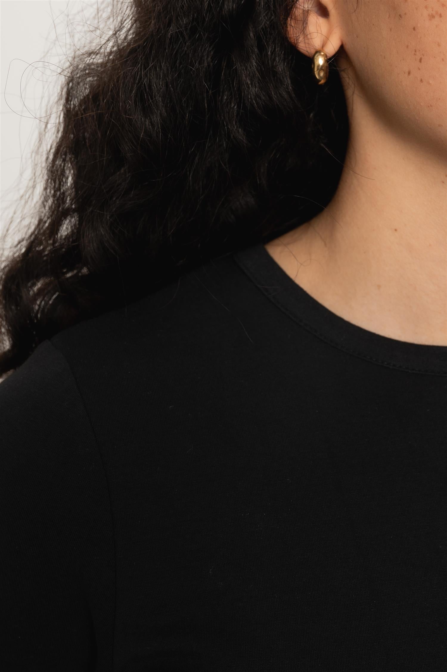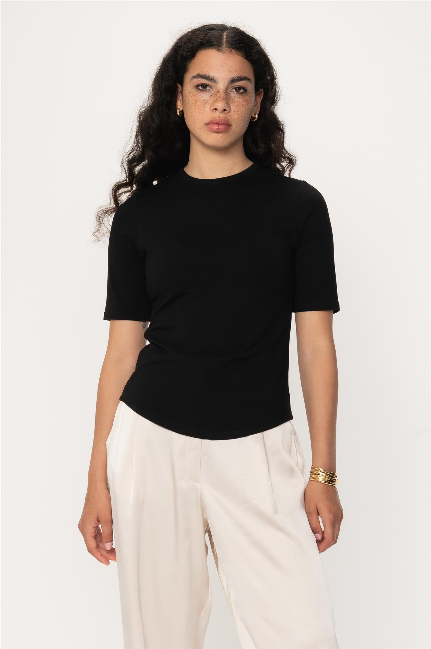 Spica Top Black fra Viveh er base t-skjorten med et løftet og rent uttrykk. Toppen er laget av en myk og strukturert ECOVERO™ viskosejersey med dobbel fôring for god dekkevne og komfort.