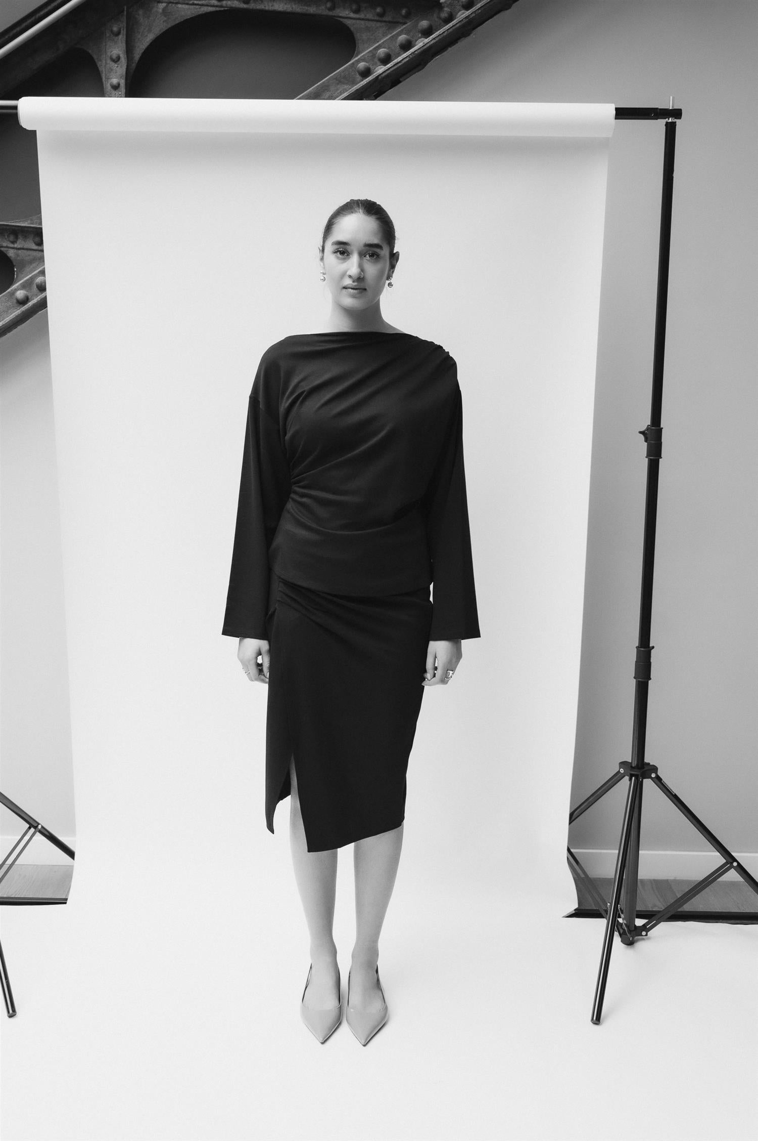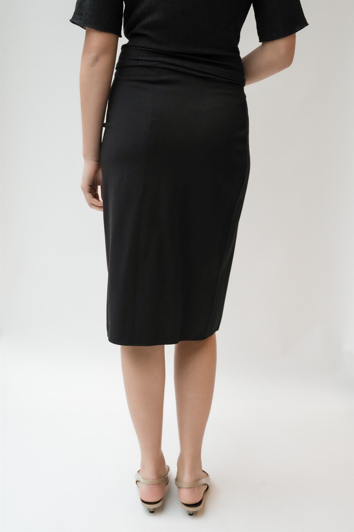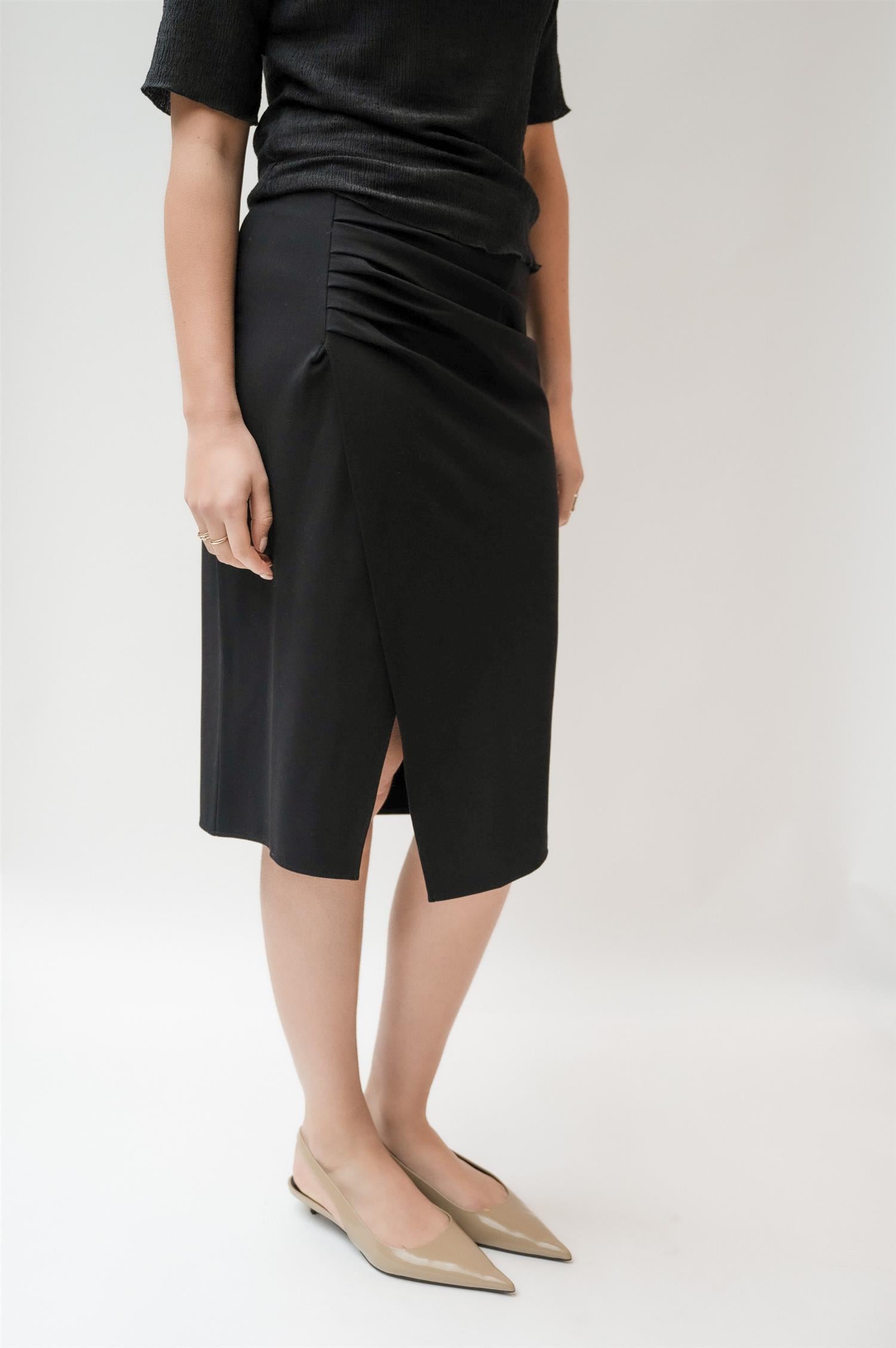 Hadar Skirt Black fra Viveh er et sort høytlivsskjørt laget i kvalitetsjersey. Skjørtet har en høy splitt i front, med drapert stoff som samler seg ved midjen. Med sin knelengde og flatterende blyantskjørt-silhuett, er skjørtet både sofistikert og en dose småfrekt.