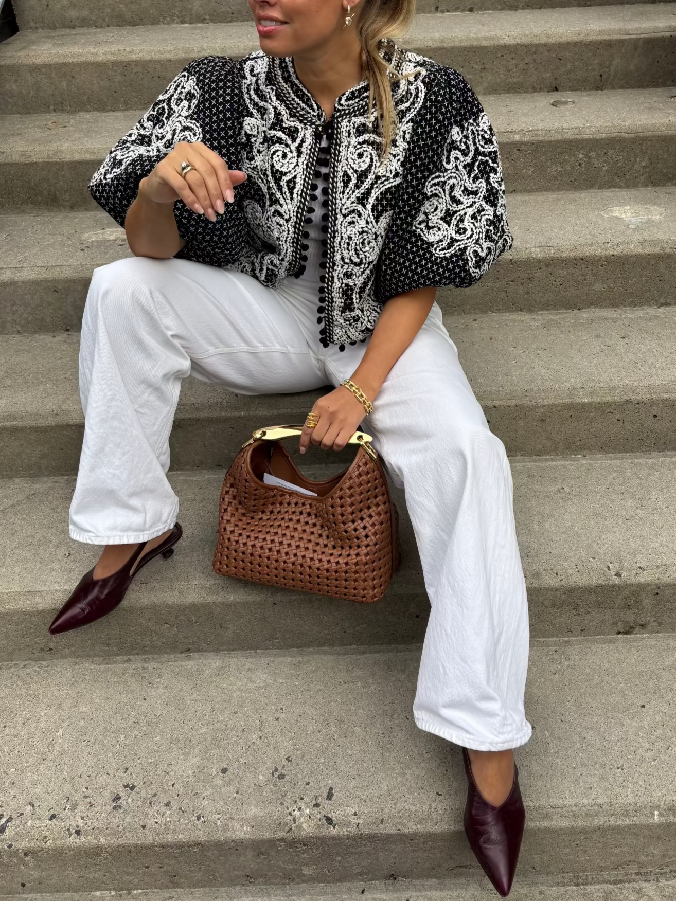 Toppen har en løs og luftig passform, med ballongermer og en åpen front som lukkes med en alternativ hekte. En feminin og detaljrik jakke som enkelt kan brukes alene til en lys dressbukse eller jeans, eller styles sammen med en pen topp.