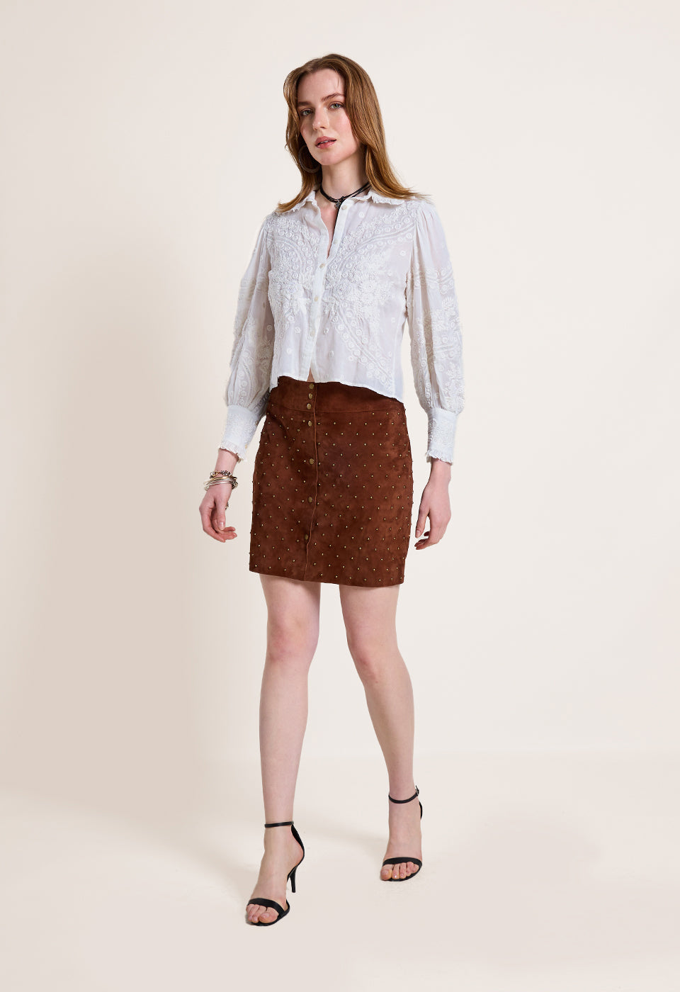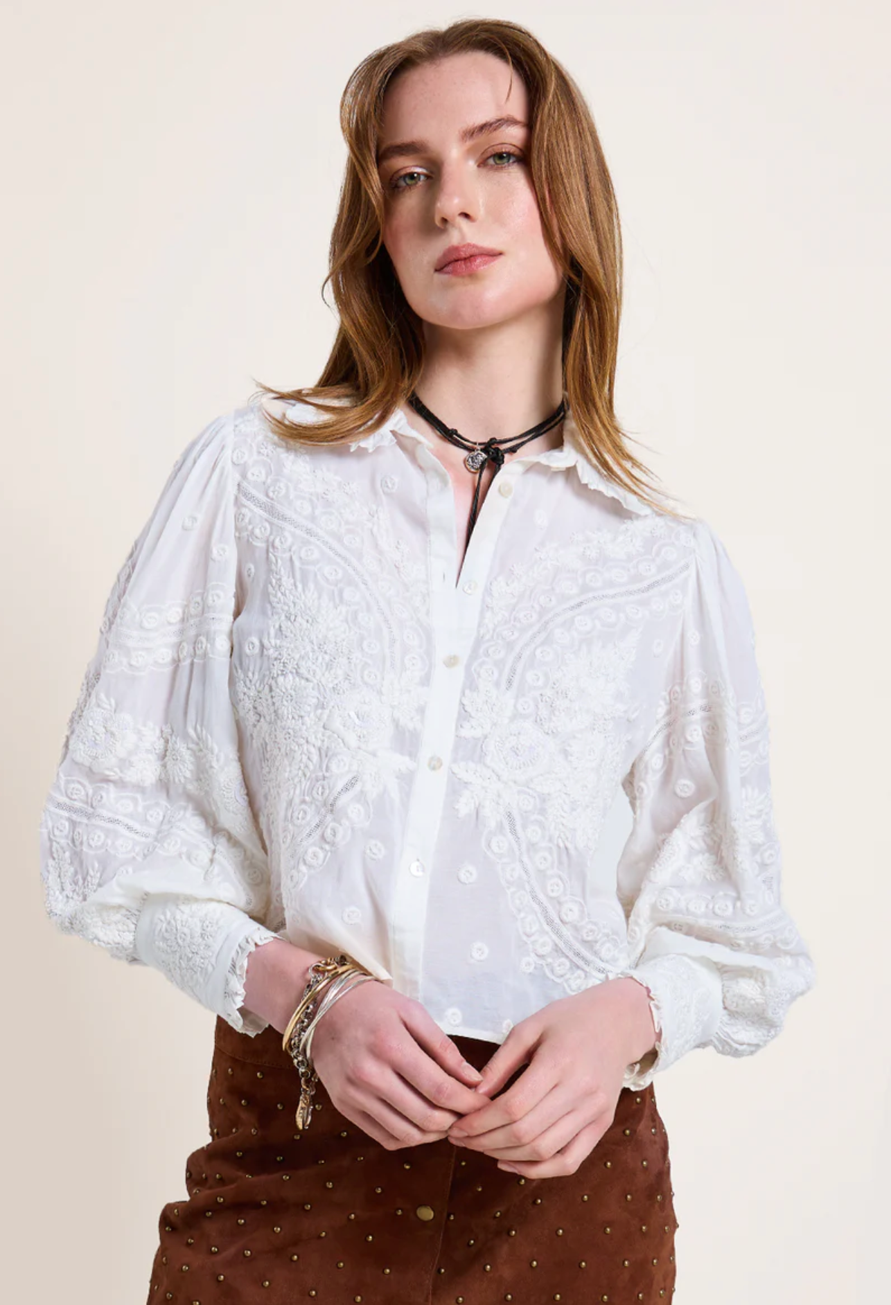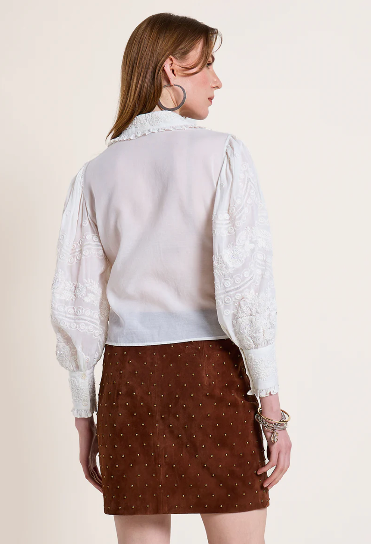 Chetna top er prydet med broderier for tekstur, og blonder som skaper et delikat uttrykk. Mansjettene er fullført med frynsede kanter og broderier.