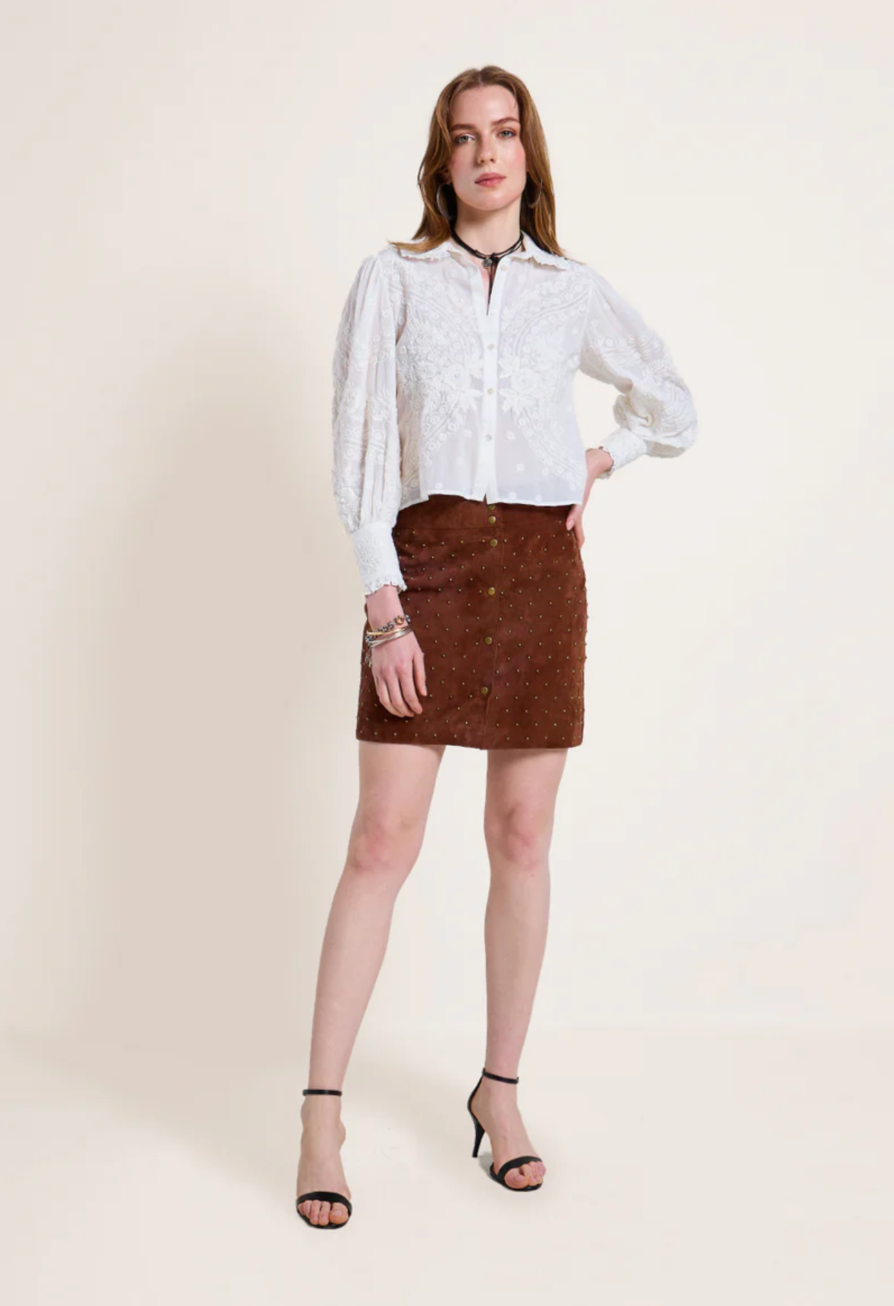 Chetna top fra Scarlett Poppies er en sofistikert og moderne bluse med intrikate broderier. Blusen er laget av en deilig miks av viskose og bomull, en rett passform med krage og frynsede kanter.