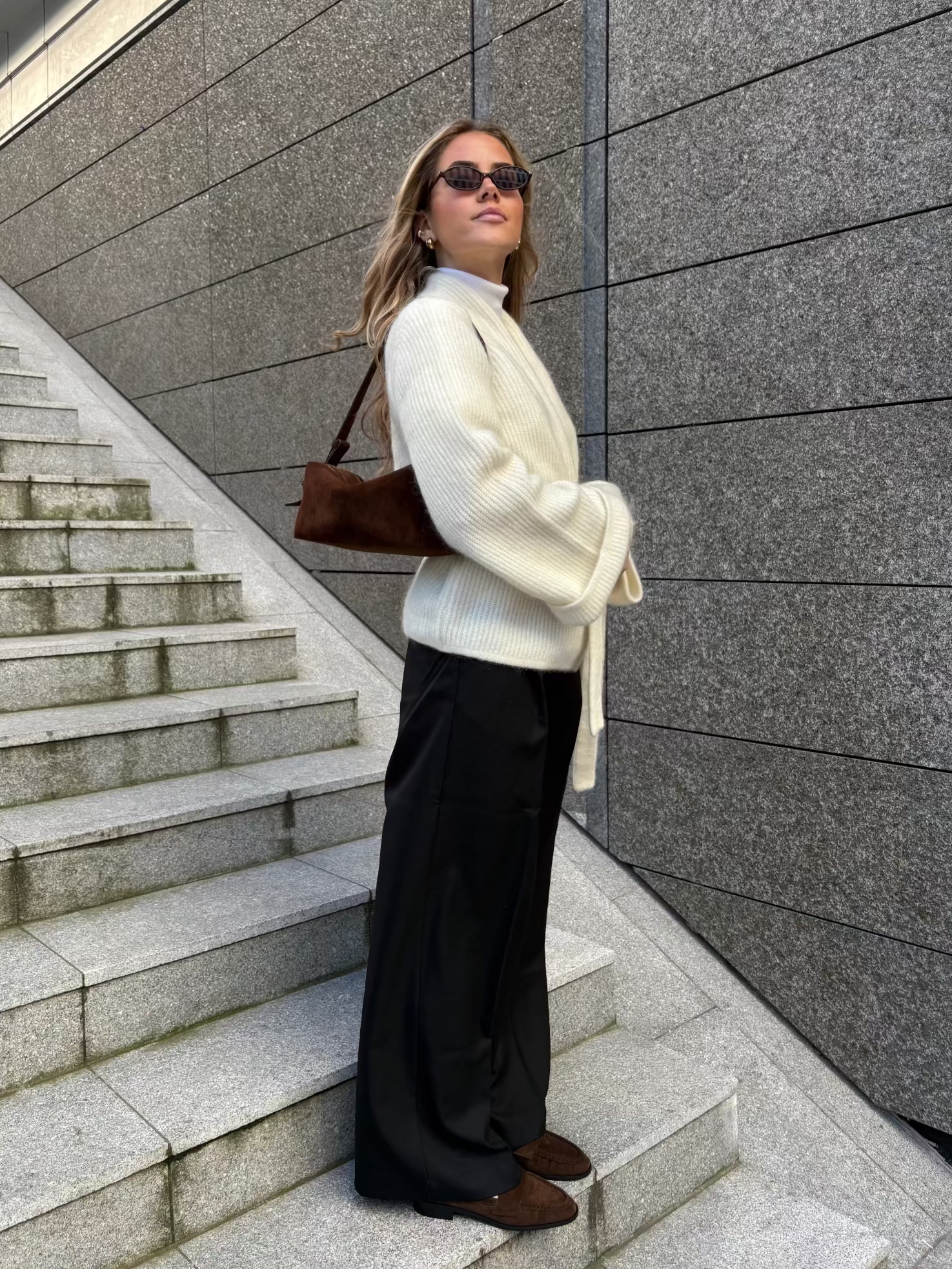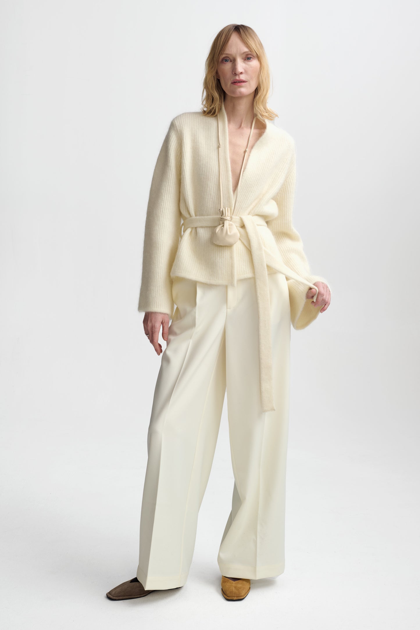 Lila Mohair Cardigan Eggshell fra Christian Aks. En myk strikket cardigan i en nydelig kremhvit farge. Cardiganen kan lukkes med et belte i midjen, som gir en mer feminin fasong. Cardiganen er i en ullmix og holder deg varm i vinter.
