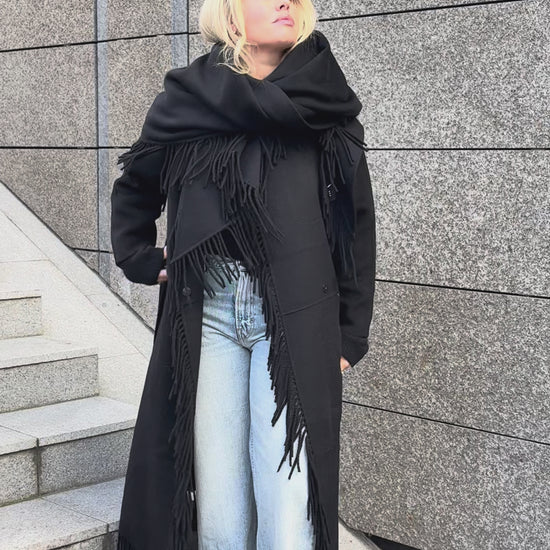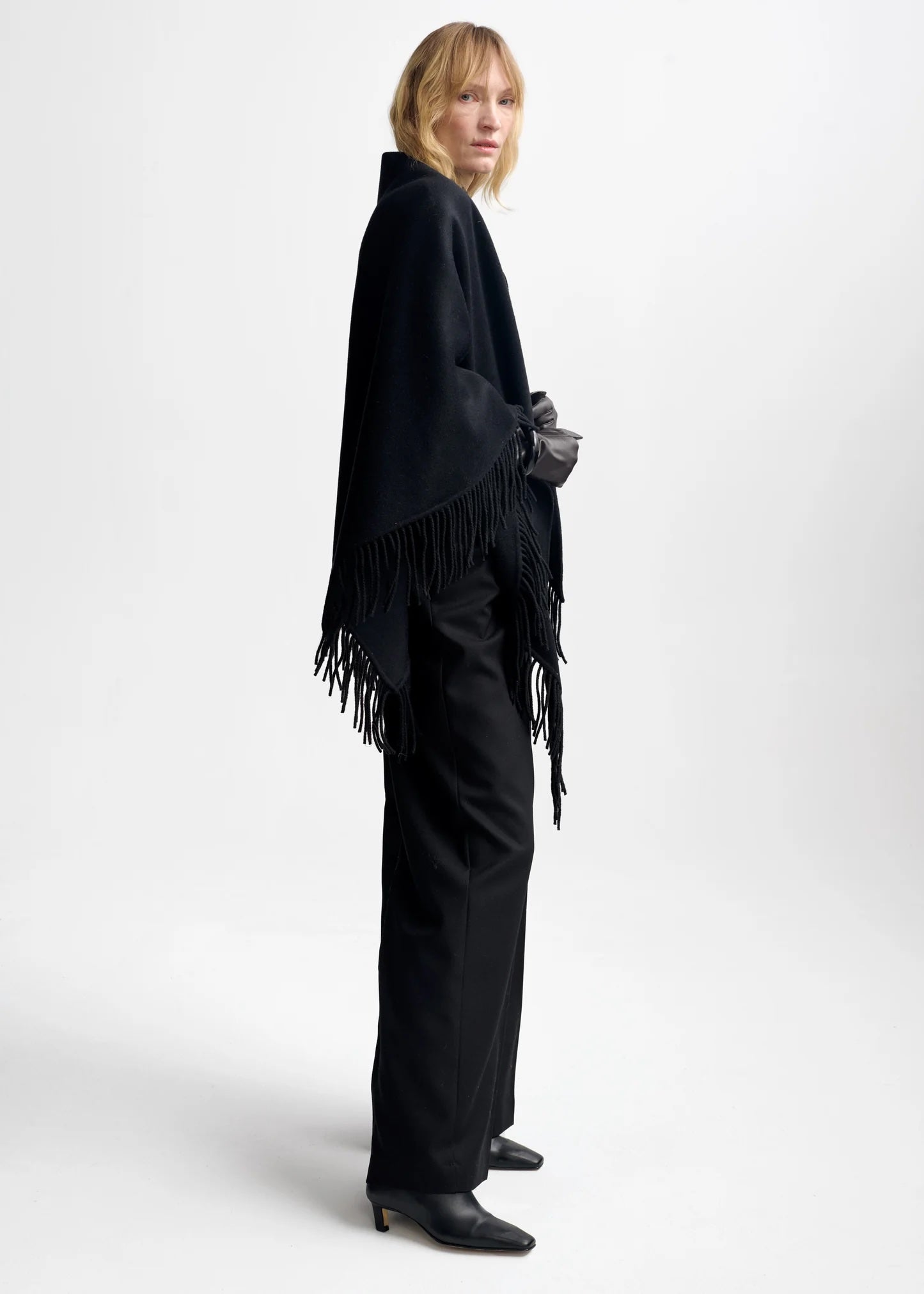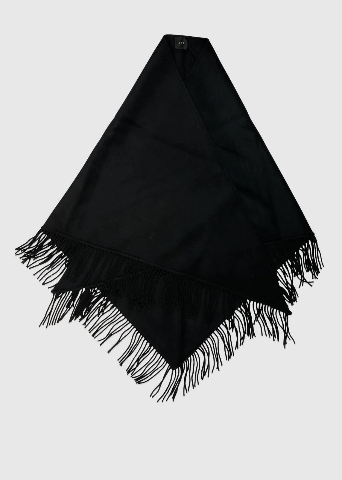 Alba Wool Scarf Black fra Christian Aks. Et stort trekantformet skjerf i myk, dobbeltsidig ull med deres signaturfrynser på sidene. Pakk deg inn med dette store og varme skjerfet i vinter.