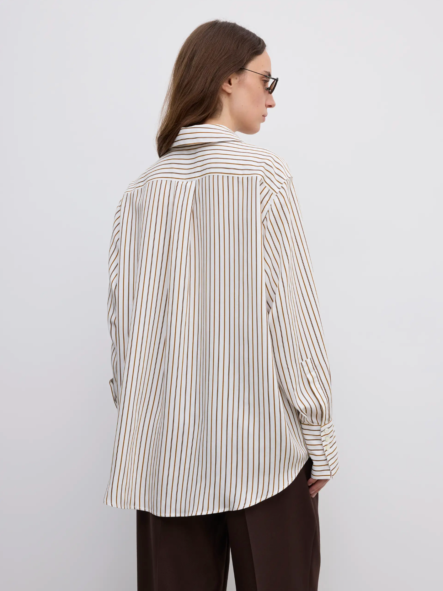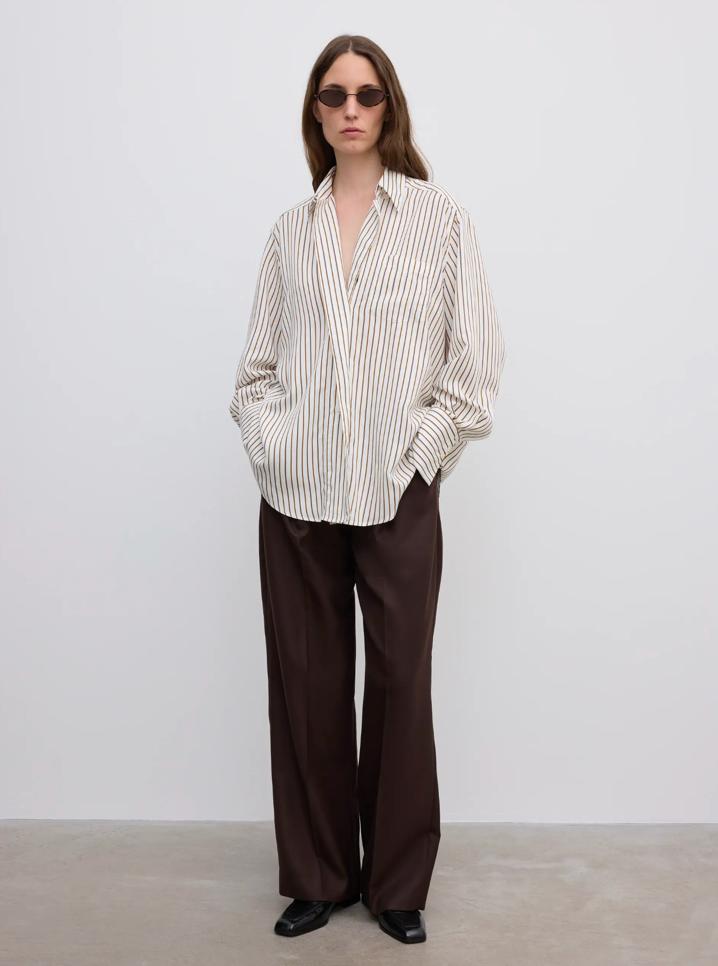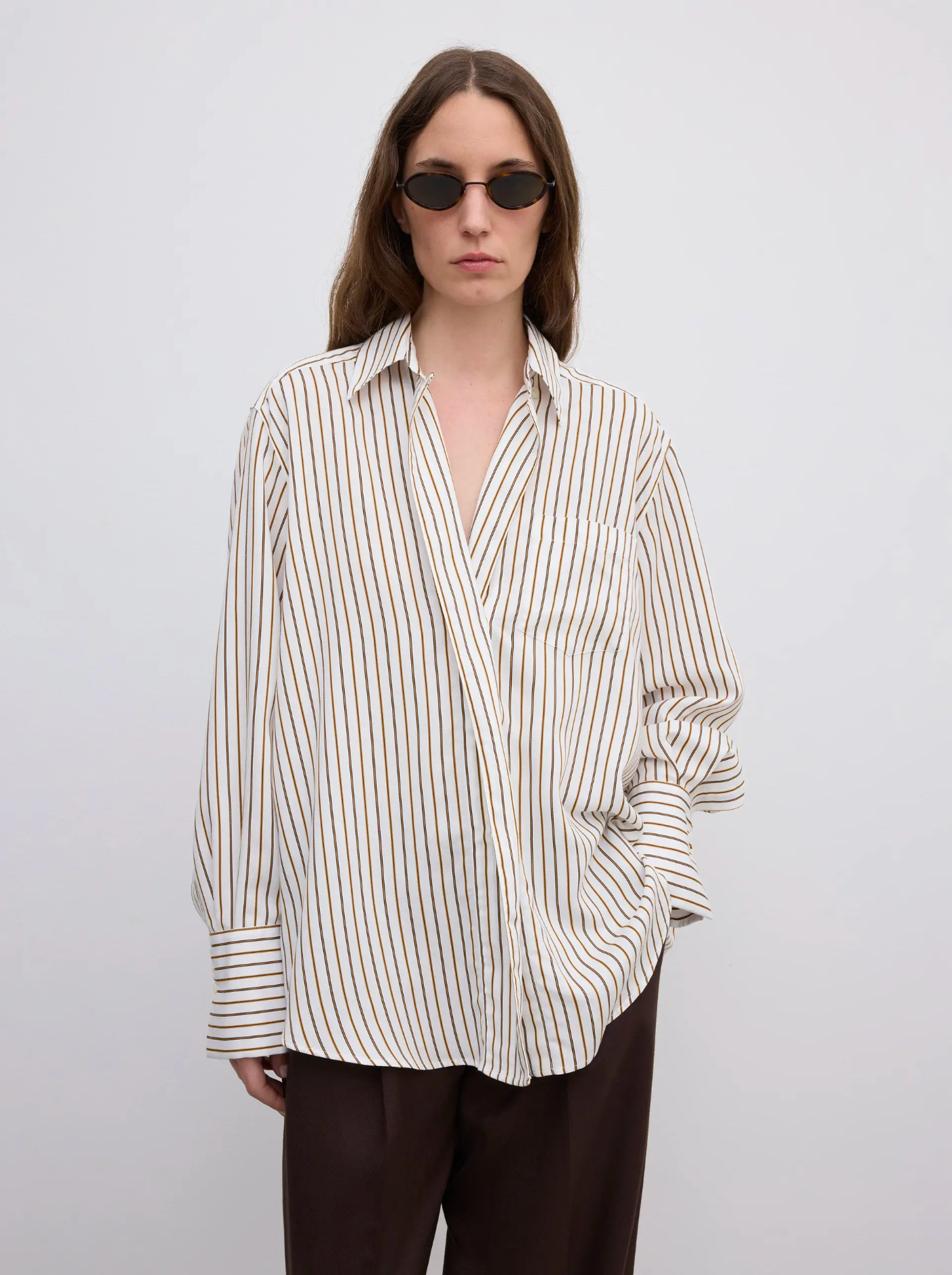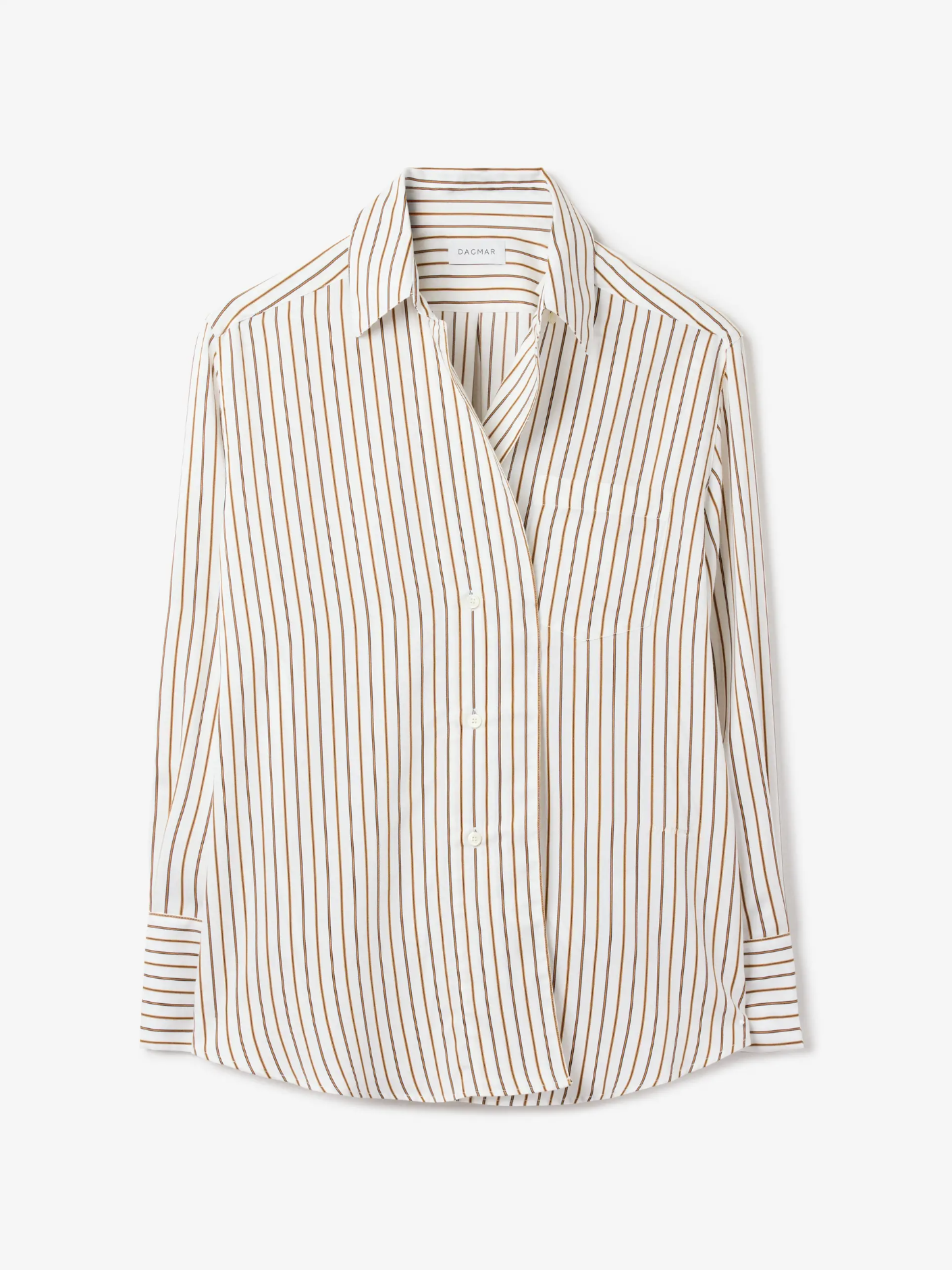 Fluid Stripe Shirt fra Dagmar er en asymmetrisk og rektangulær skjorte, med den perfekte sammensmeltning av maskulint og feminint uttrykk. Skjorten har brede mansjetter, og en asymmetrisk knappestolpe, laget i et stilrent stripete brunt og hvitt mønster. Den avslappede og stilige skjorten å kombinere til et par wide leg jeans!