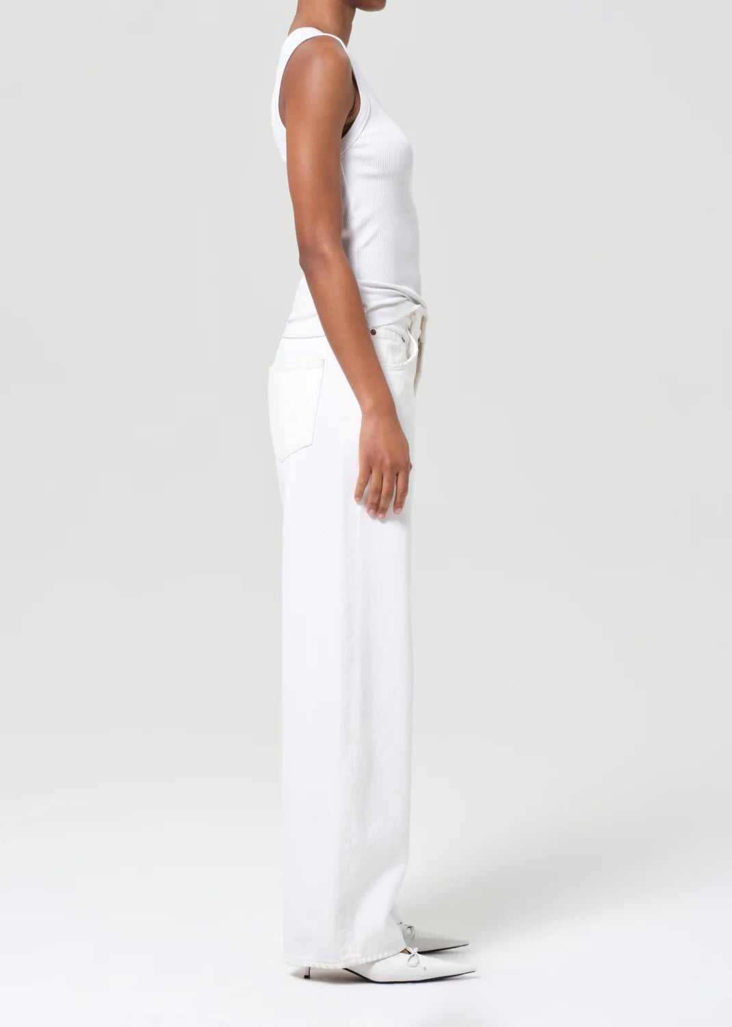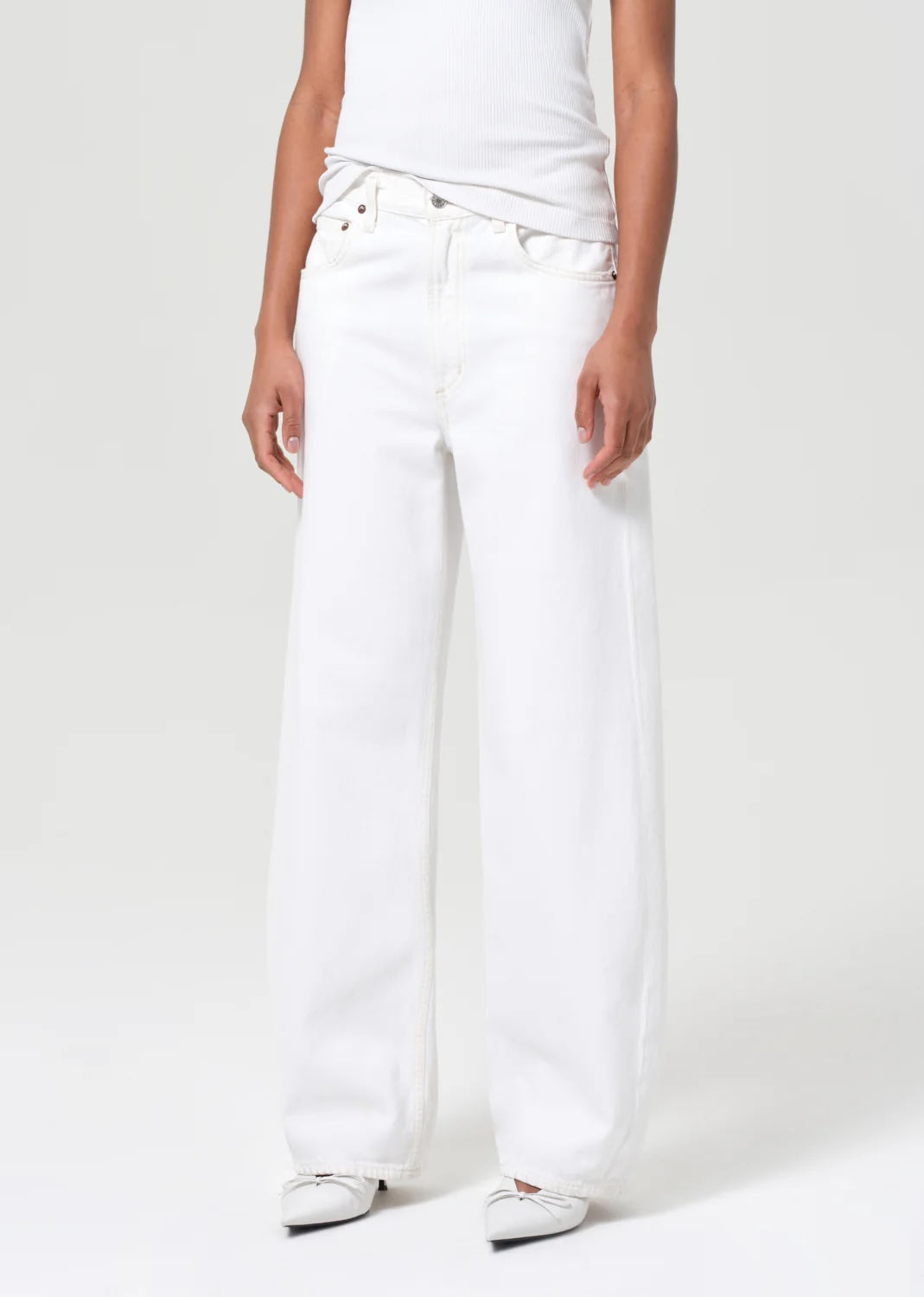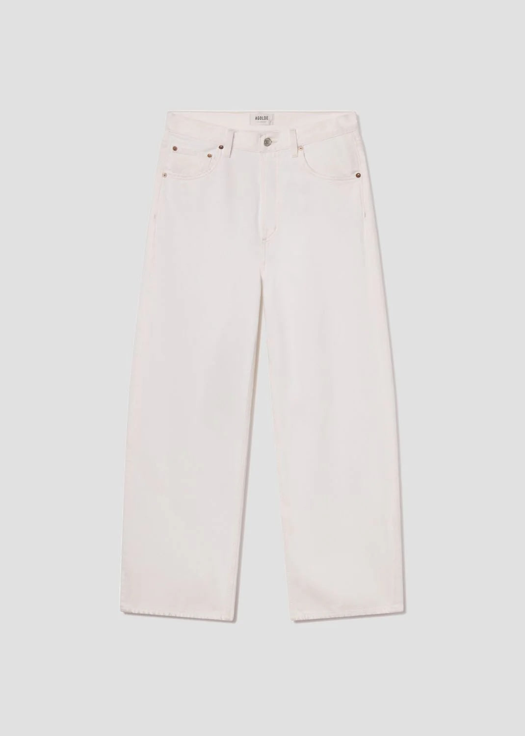Low Curve Jeans in Milkshake fra AGOLDE. Low Curve-jeansen er designet med en mellomhøy midje, avslappet passform og en subtil buet yttersøm som smalner av for en raffinert, men likevel uanstrengt silhuett. Laget av ren hvit, ikke-elastisk denim i regenerativ bomull, gir den en skarp, strukturert følelse med en moderne vri. Style med tonale lag for et friskt monokrom statement, eller kombiner med avslappet skreddersøm for et balansert, minimalistisk utseende.