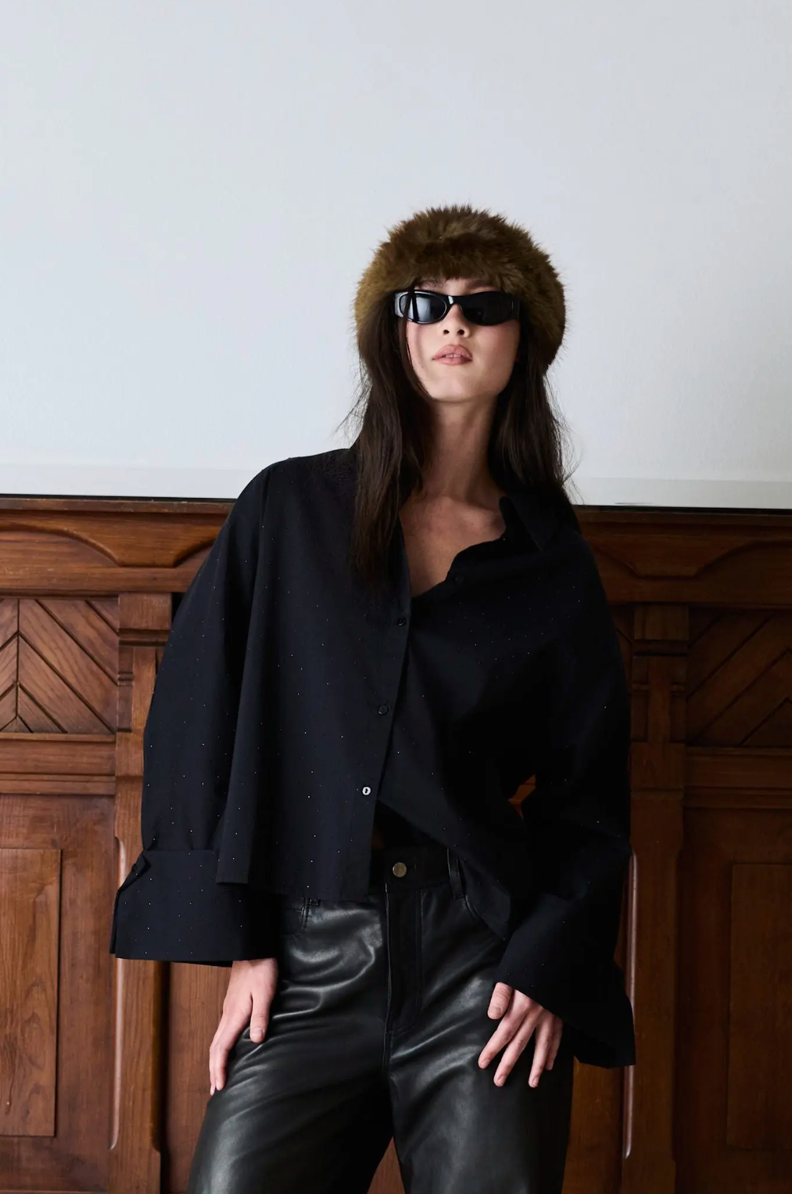 Atari shirt har klassiske skjortedetaljer med knepping i front og krage, og er en showstopper med sine vide ermer og trendy passform. Skjorten kommer nå i en nydelig sort base med rhinestones, som hever skjorten fra hverdagsantrekket til formelle kveldsanledninger! Den ultimate skjorte for å lyse opp hverdagen.