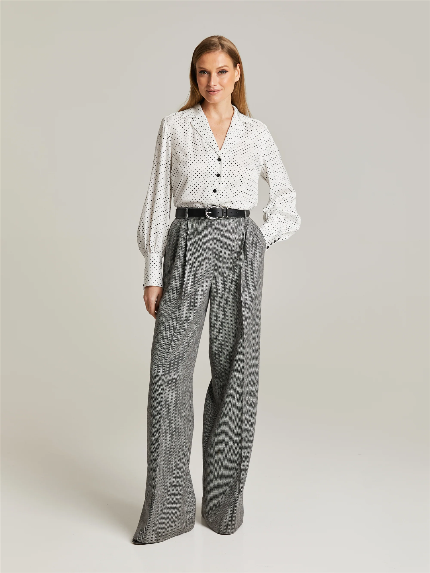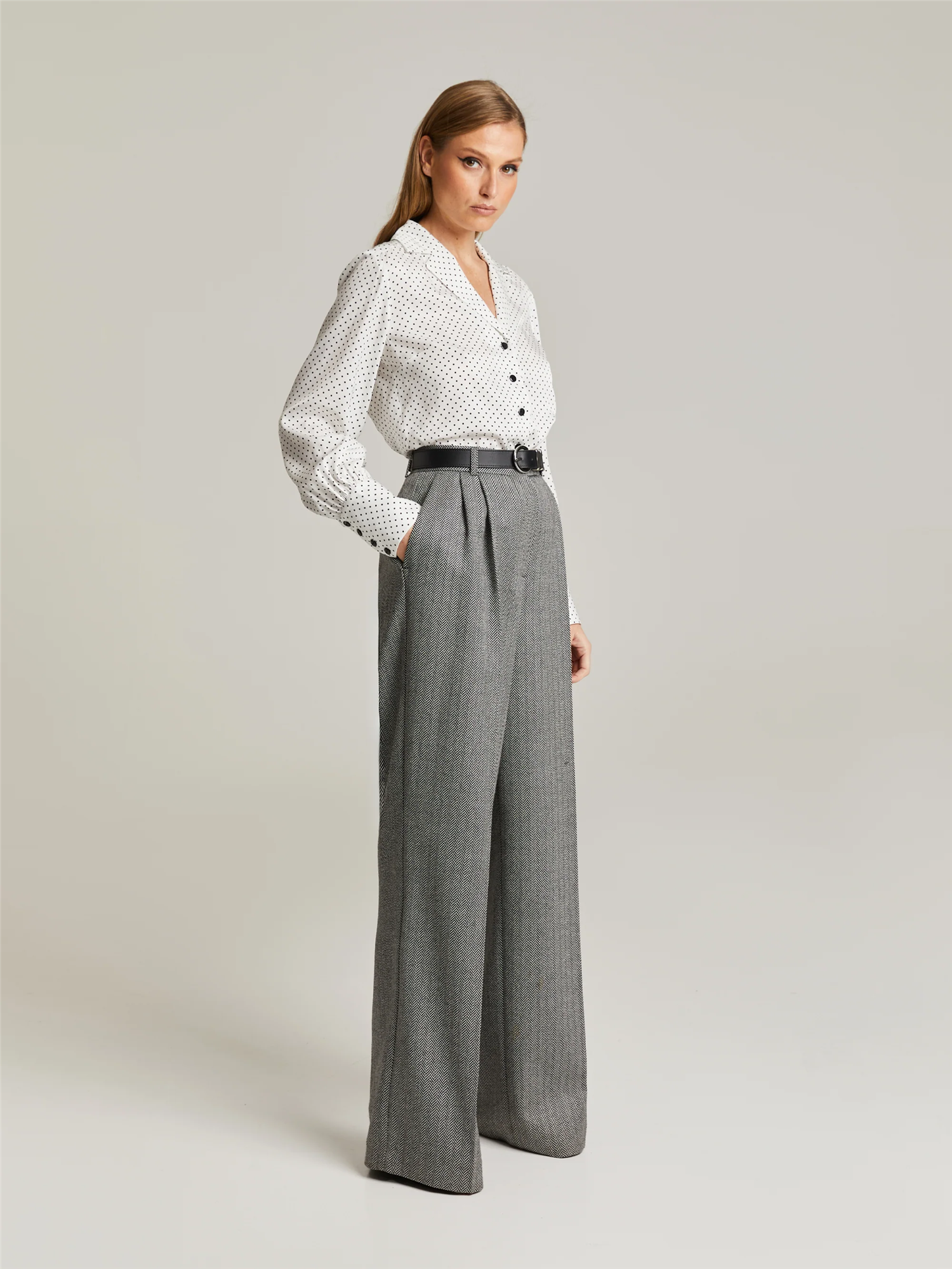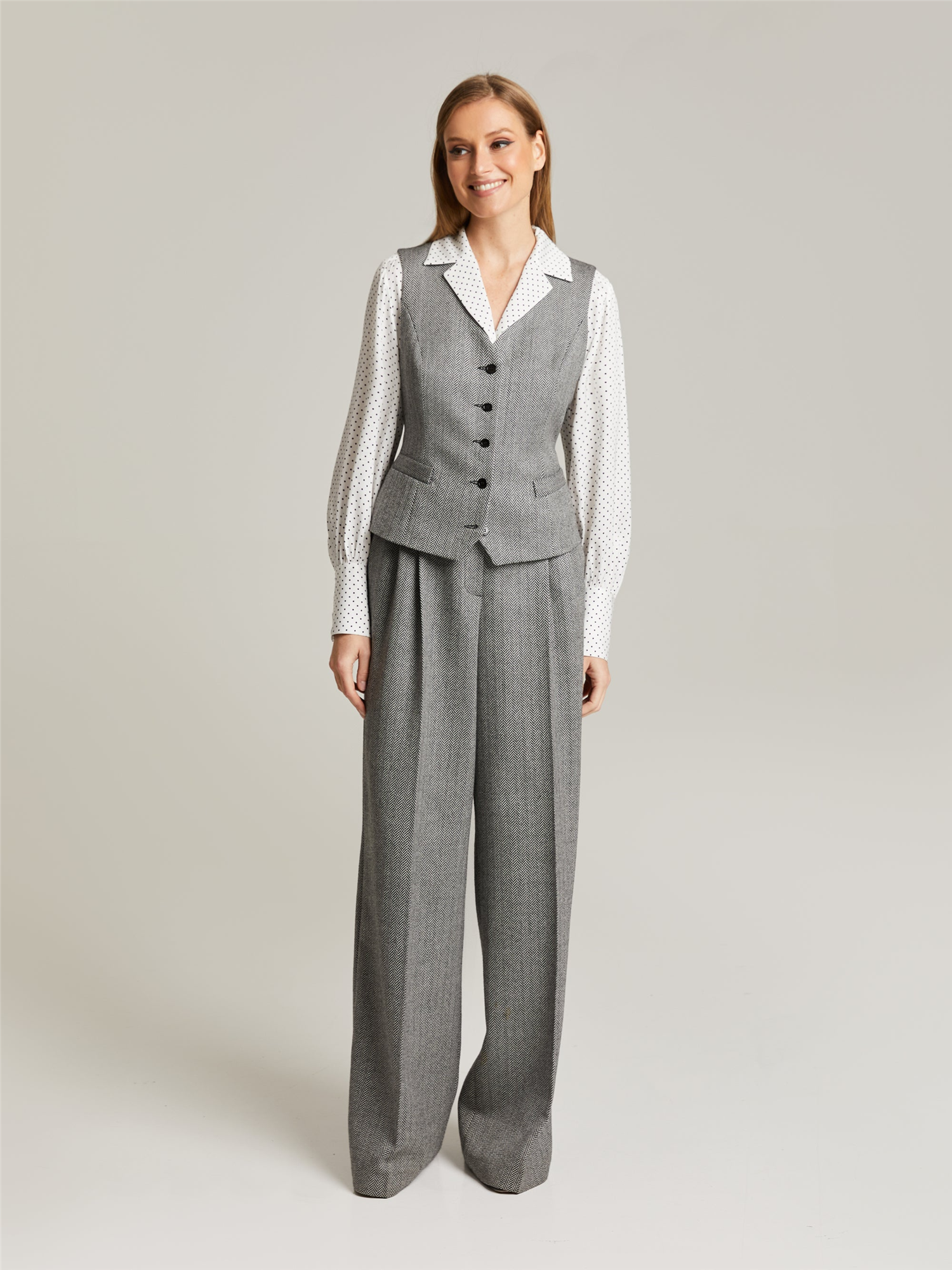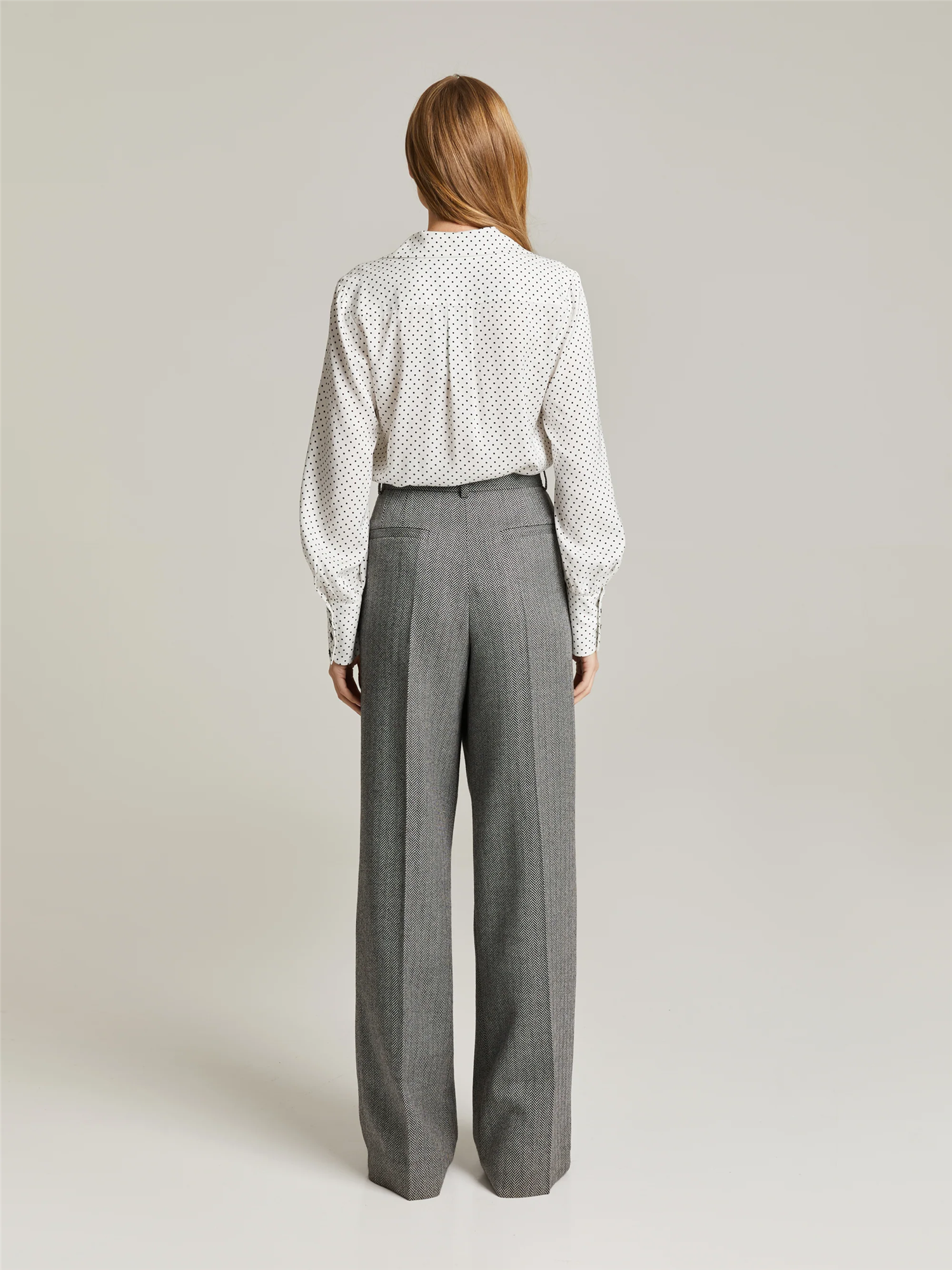 Gytta Wool Trousers Grey Herringbone fra Andiata. En bukse med høyt liv og lange bein laget i italiensk ull med fiskebensmønster. Den har vide ben, skråstilte sidelommer, beltehemper, passpolerte lommer bak og plissé foran. Knappene er i ekte perlemor. Bruk med den matchende Maria-vest for en komplett look.