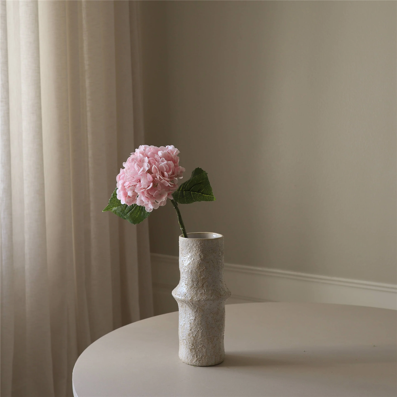 Light Pink Hydrangea Flower fra Botane. Denne lyserosa hortensiablomsterstilken har en enkelt stor blomst med myke, pastellrosa kronblader som danner en tett, avrundet klase. Kronbladene viser subtile variasjoner i fargetone, noe som skaper en naturlig gradienteffekt. Blomsten er ledsaget av teksturerte, dypgrønne blader med taggete kanter, festet til en solid, lysegrønn stilk, og når en høyde på 49 cm.