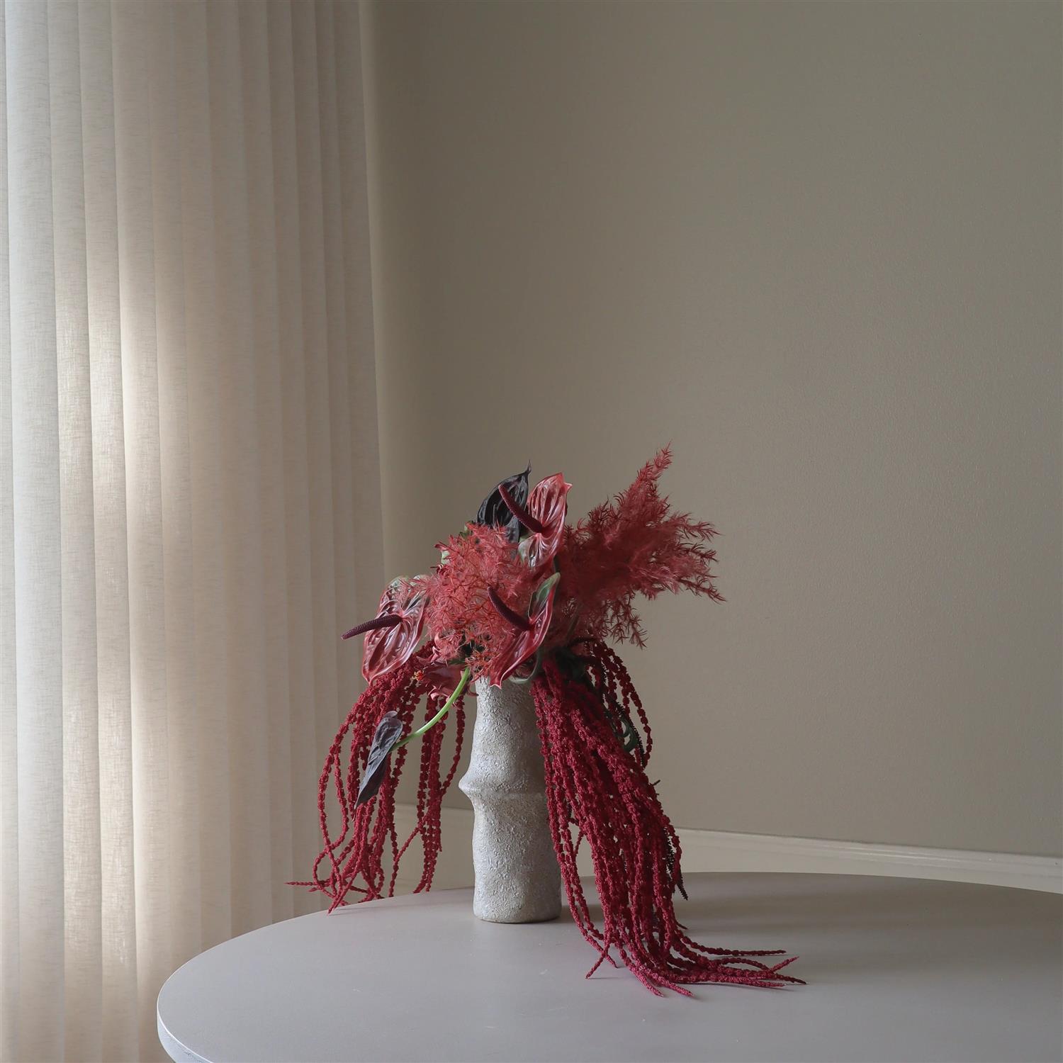 Hearbeat fra Botane. Denne buketten er en dristig komposisjon av dyprøde og mørke fargetoner, med skulpturelle elementer og kaskader av teksturer som skaper en slående visuell effekt. Kontrasten mellom blanke og fjæraktige elementer tilfører dybde og bevegelse, noe som gjør den til en iøynefallende bukett.