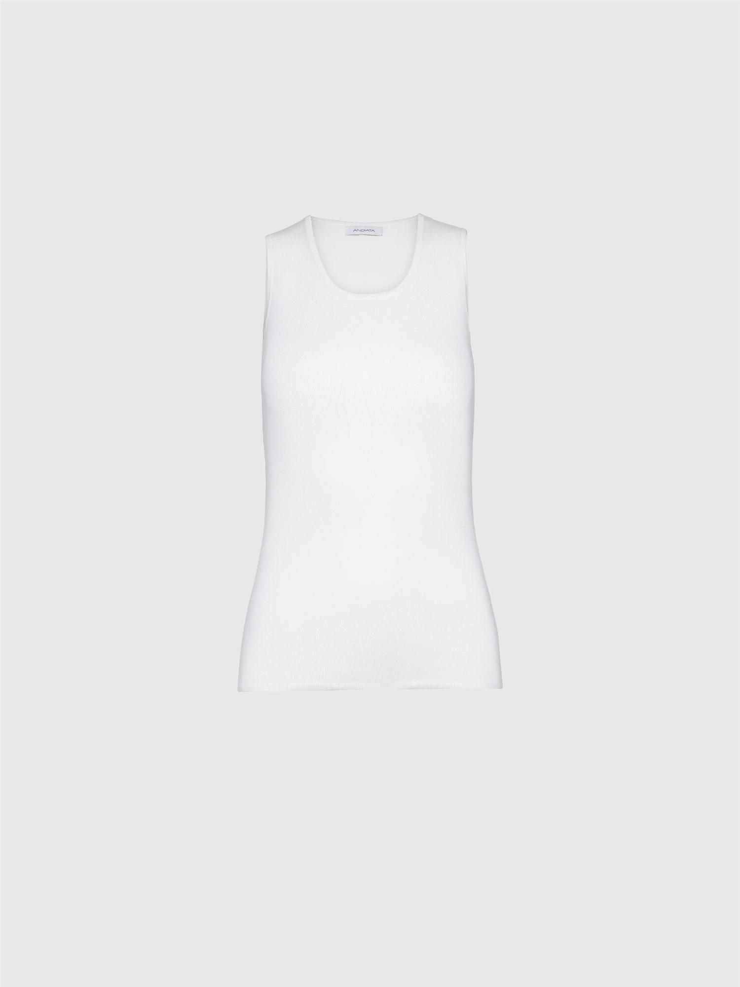 Hannele Top White fra Andiata. Ermeløs strikketopp i fleksibel viskose med anti-pilling-egenskaper. Toppen er tettsittende og har brede skulderstropper. Dette er det perfekte baseplagget for lag-på-lag til høsten.