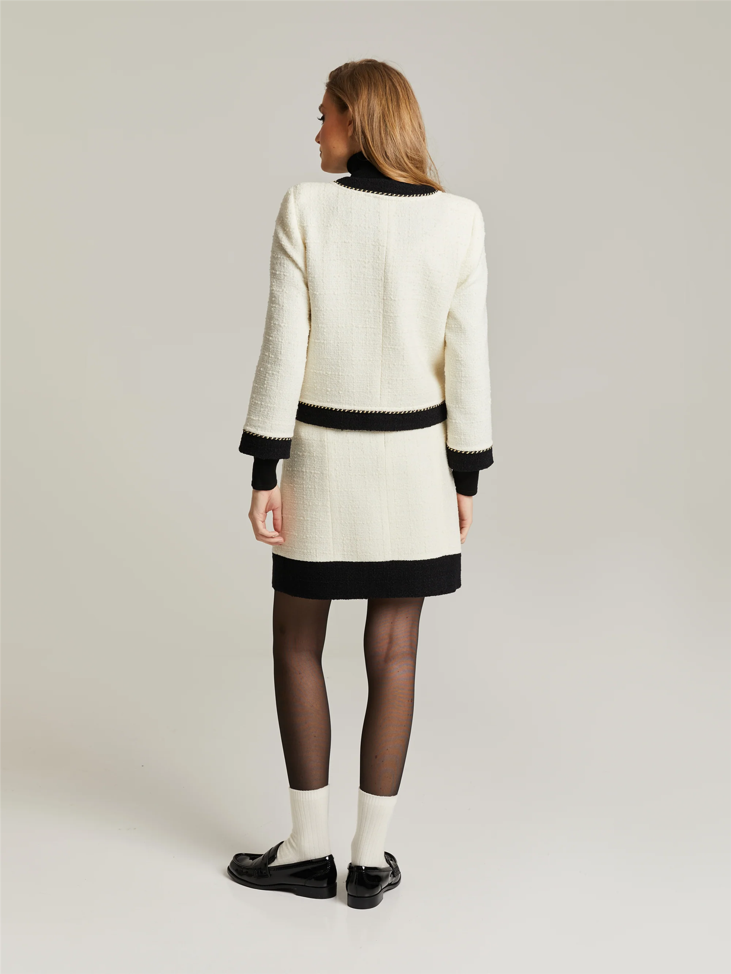 Ragni Blazer White fra Andiata. Bouclé-blazer med fire lommer foran og gullfargede knapper. Den har rett silhuett og 3/4-ermer, og er helfôret. Jakken er laget av italiensk ullblanding av høy kvalitet. Bruk den med skjørt eller dressbukse for en classy look.