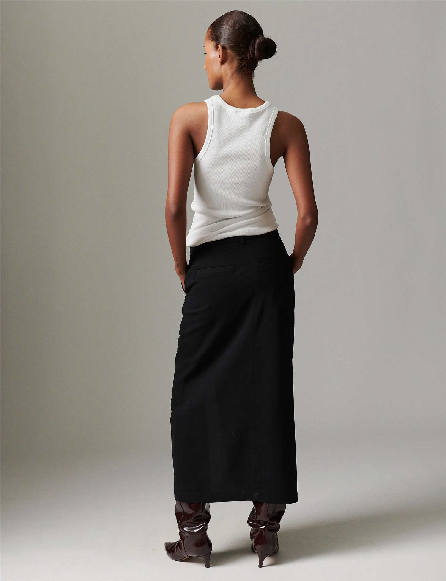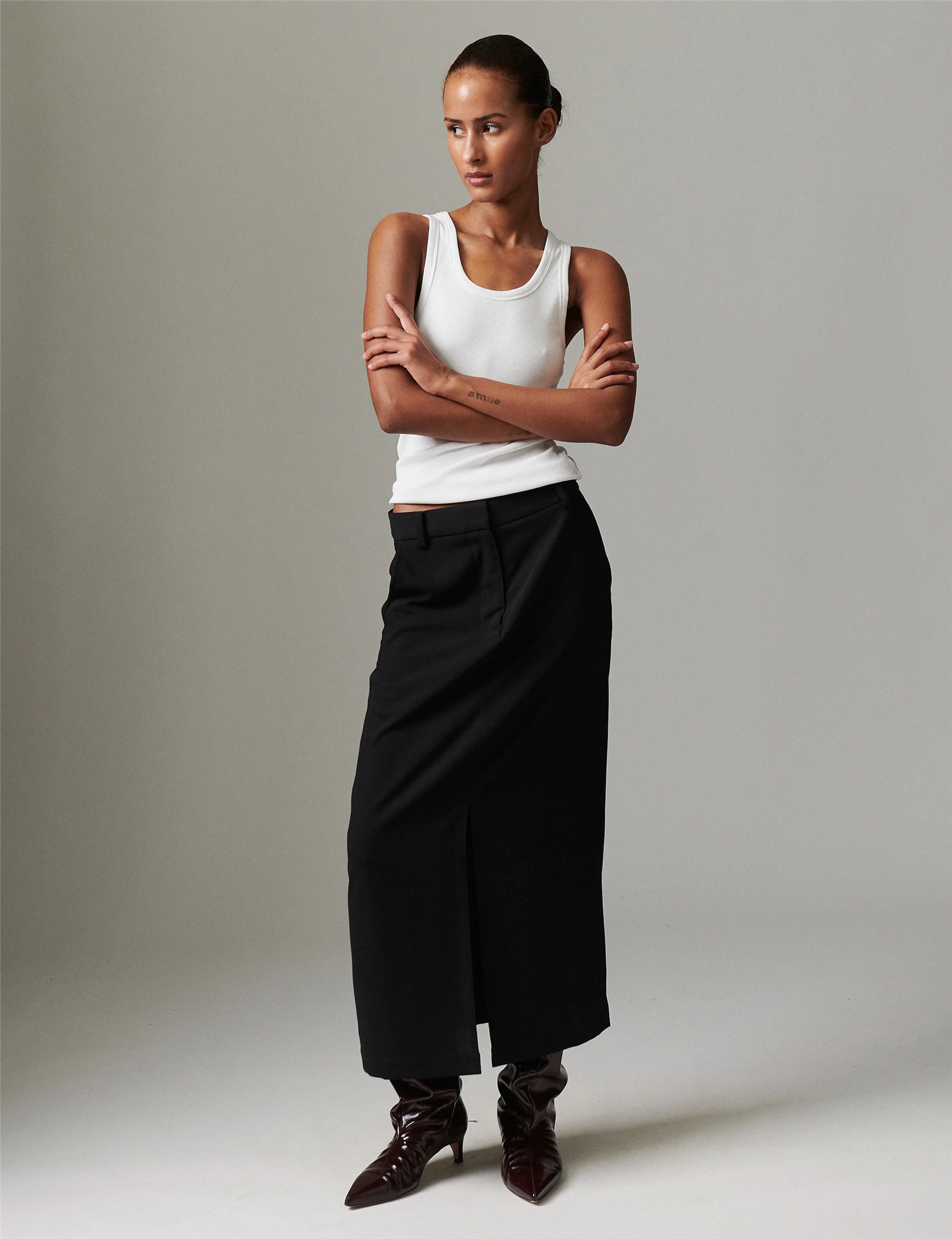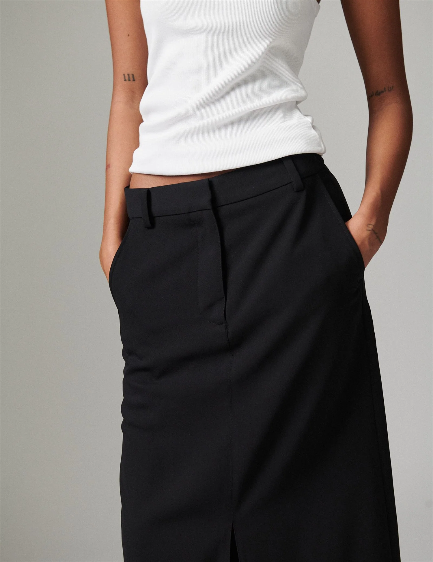 Anno Skirt Classic Gabardine fra DAY. Dette midilange skjørtet har glidelåslukking bak, en høy splitt i midten og frynsedetaljer foran og bak. Skjørtet er helfôret og har en normal passform. Det er laget av DAYs signaturstoff - Classic Gabardine. Et klassisk og dresset skjørt du kan style med en chunky strikk eller med en bluse.