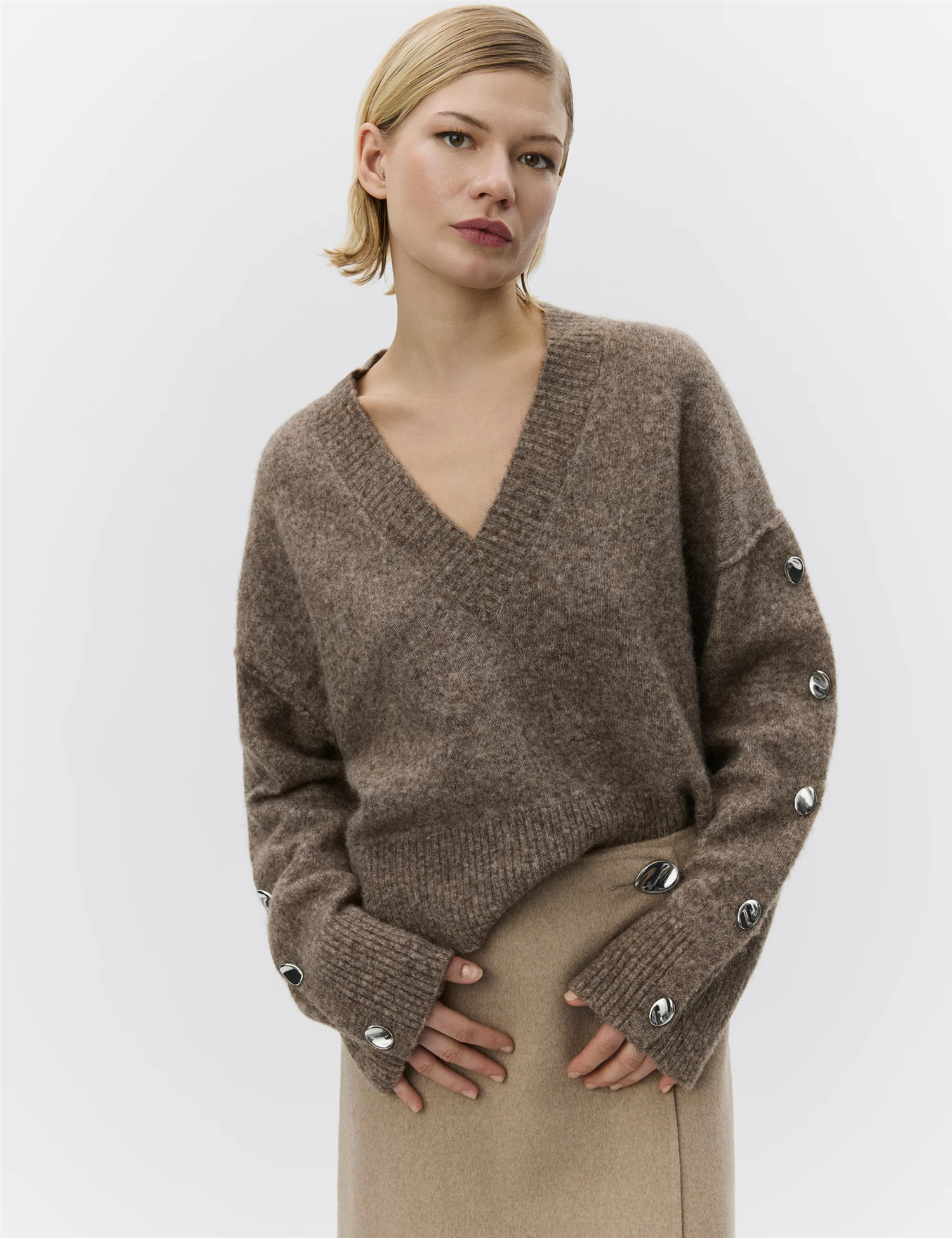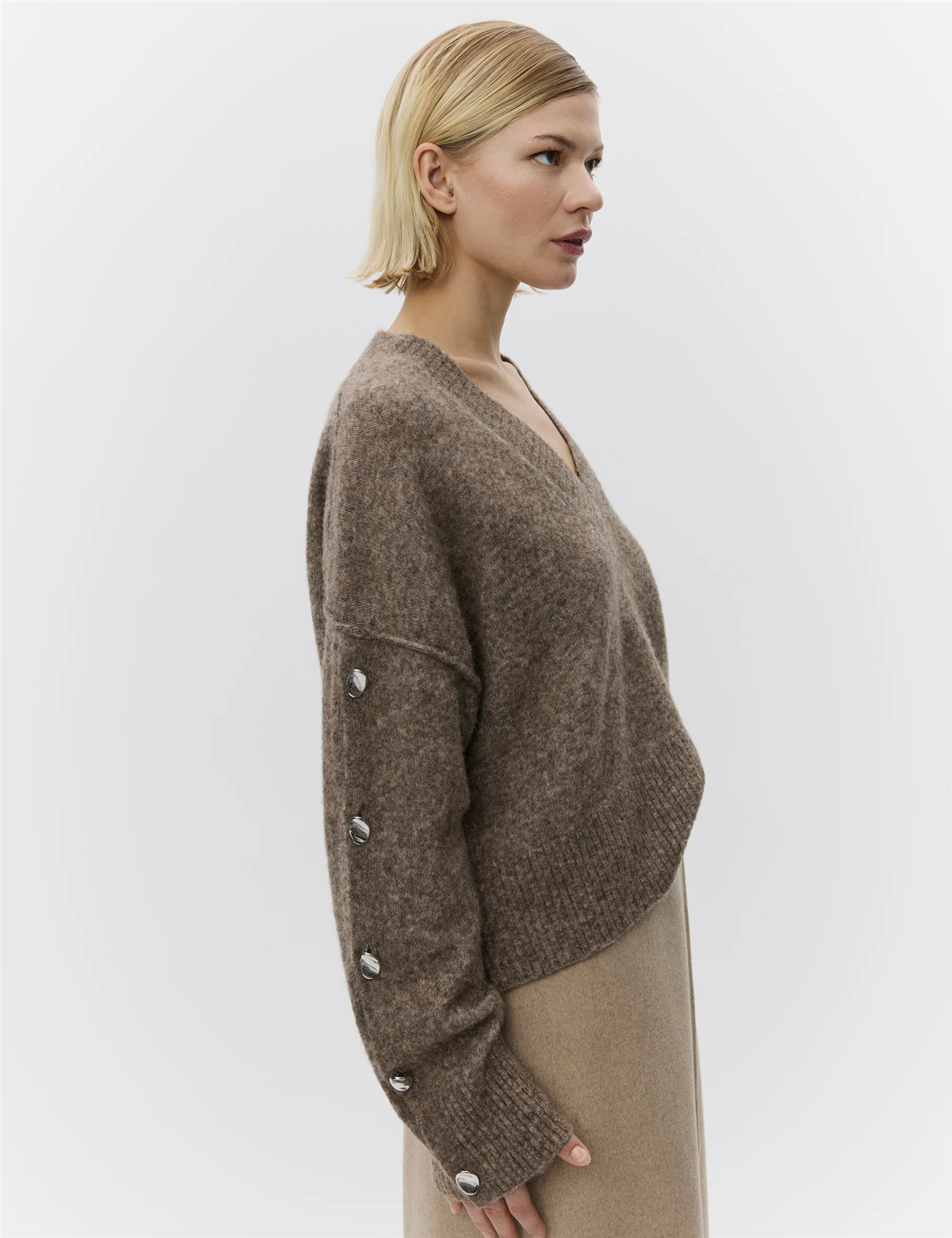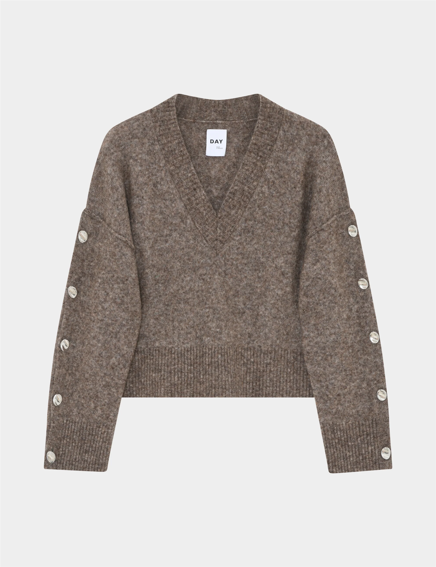 Solange - Cozy Days Wren Melange fra DAY. En ny strikk i DAYs ullmiks med alpakka og ull, som holder seg fint. En oversized genser med V-hals og sølvknapper nedover hele ermene. Den er i en melert bruntone. Knappene gir det lille ekstra. Bruk den sammen med en jeans eller dressbukse og hold deg varm i vinter.