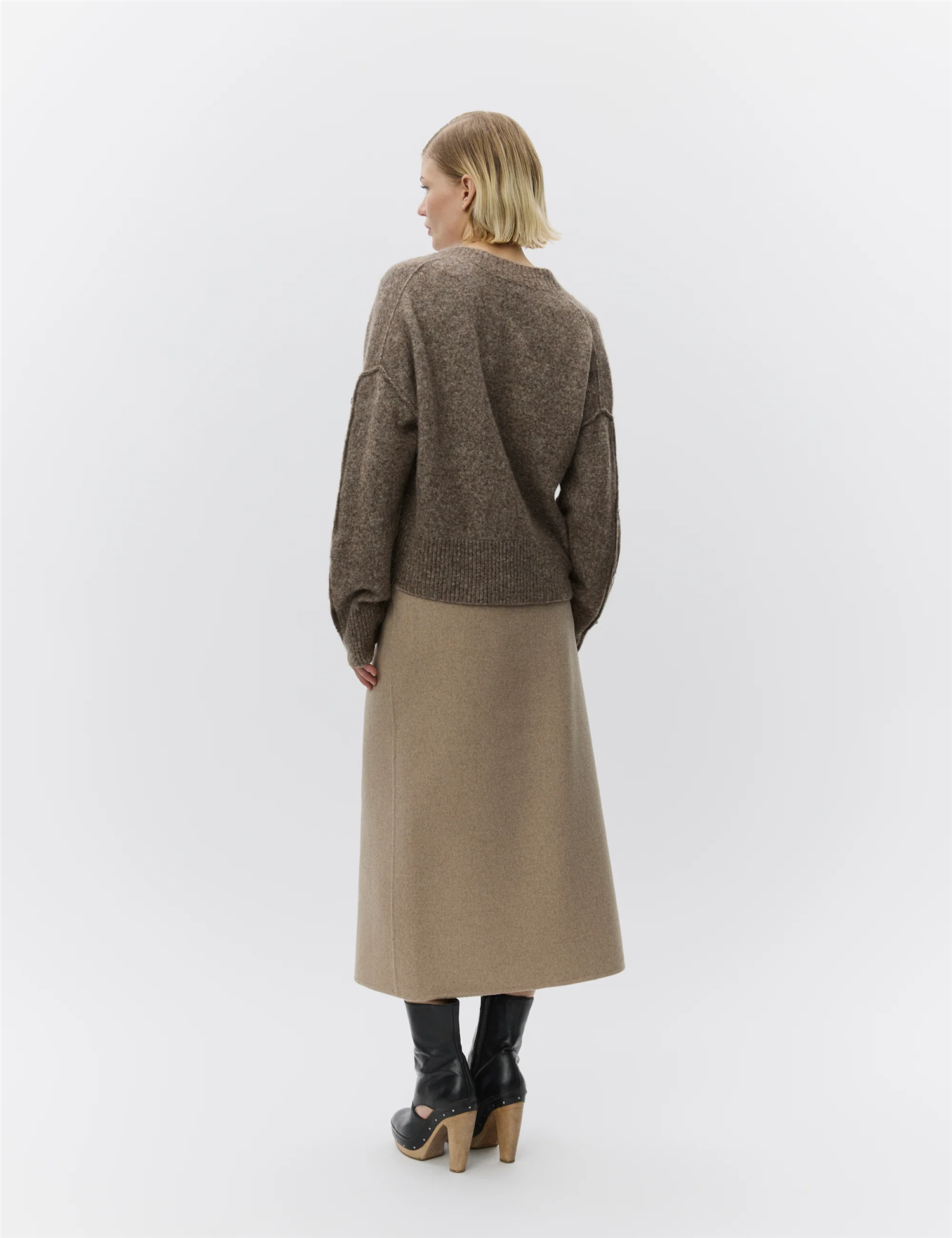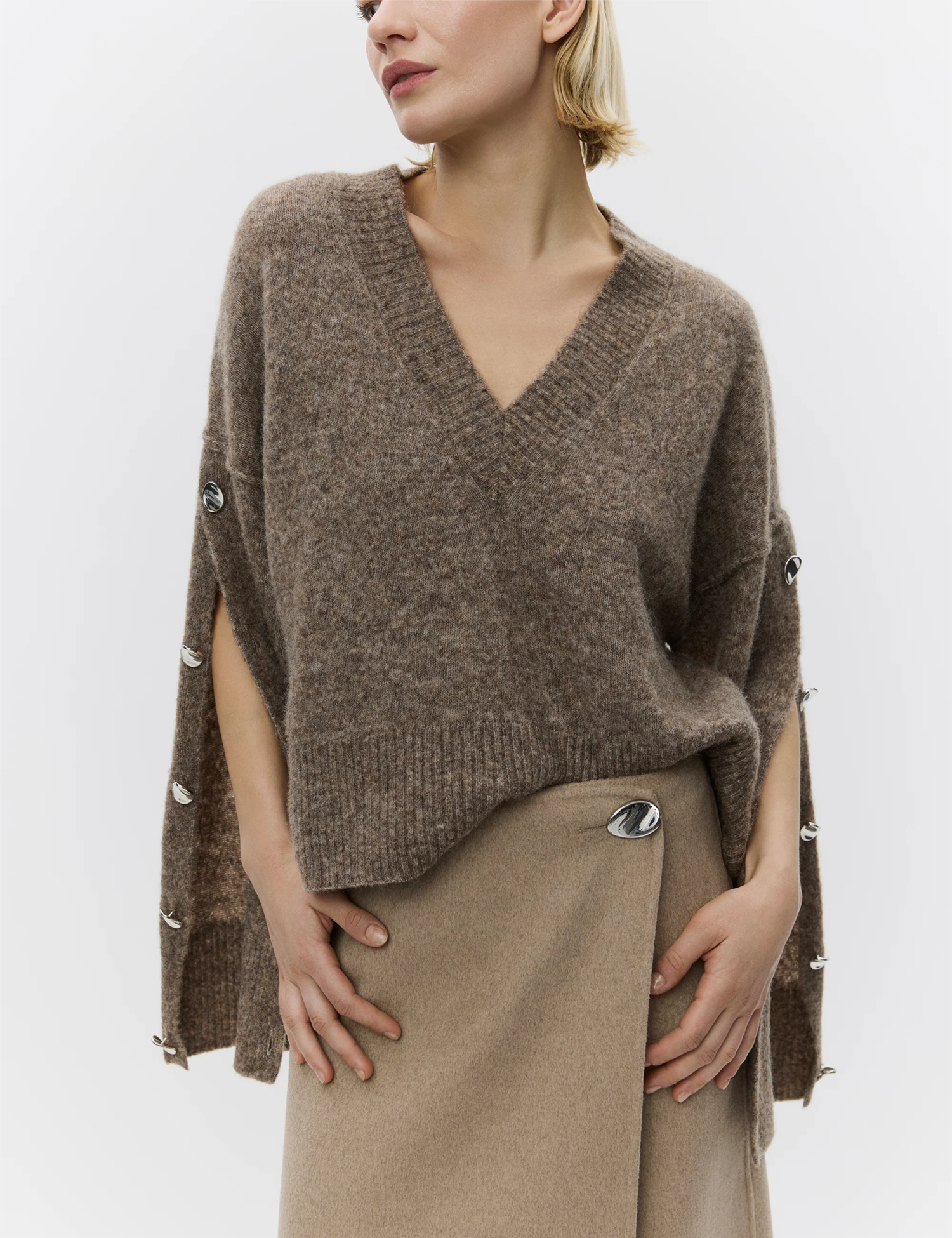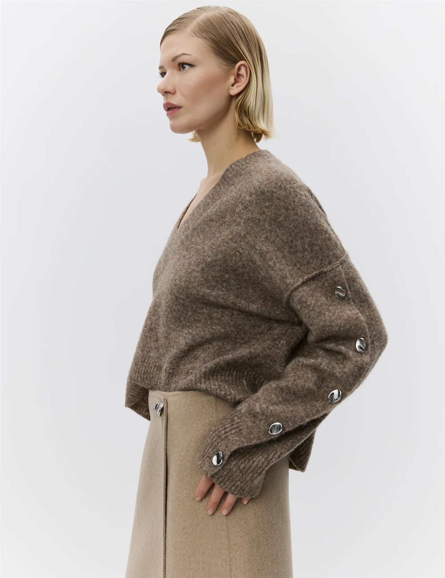 Solange - Cozy Days Wren Melange fra DAY. En ny strikk i DAYs ullmiks med alpakka og ull, som holder seg fint. En oversized genser med V-hals og sølvknapper nedover hele ermene. Den er i en melert bruntone. Knappene gir det lille ekstra. Bruk den sammen med en jeans eller dressbukse og hold deg varm i vinter.