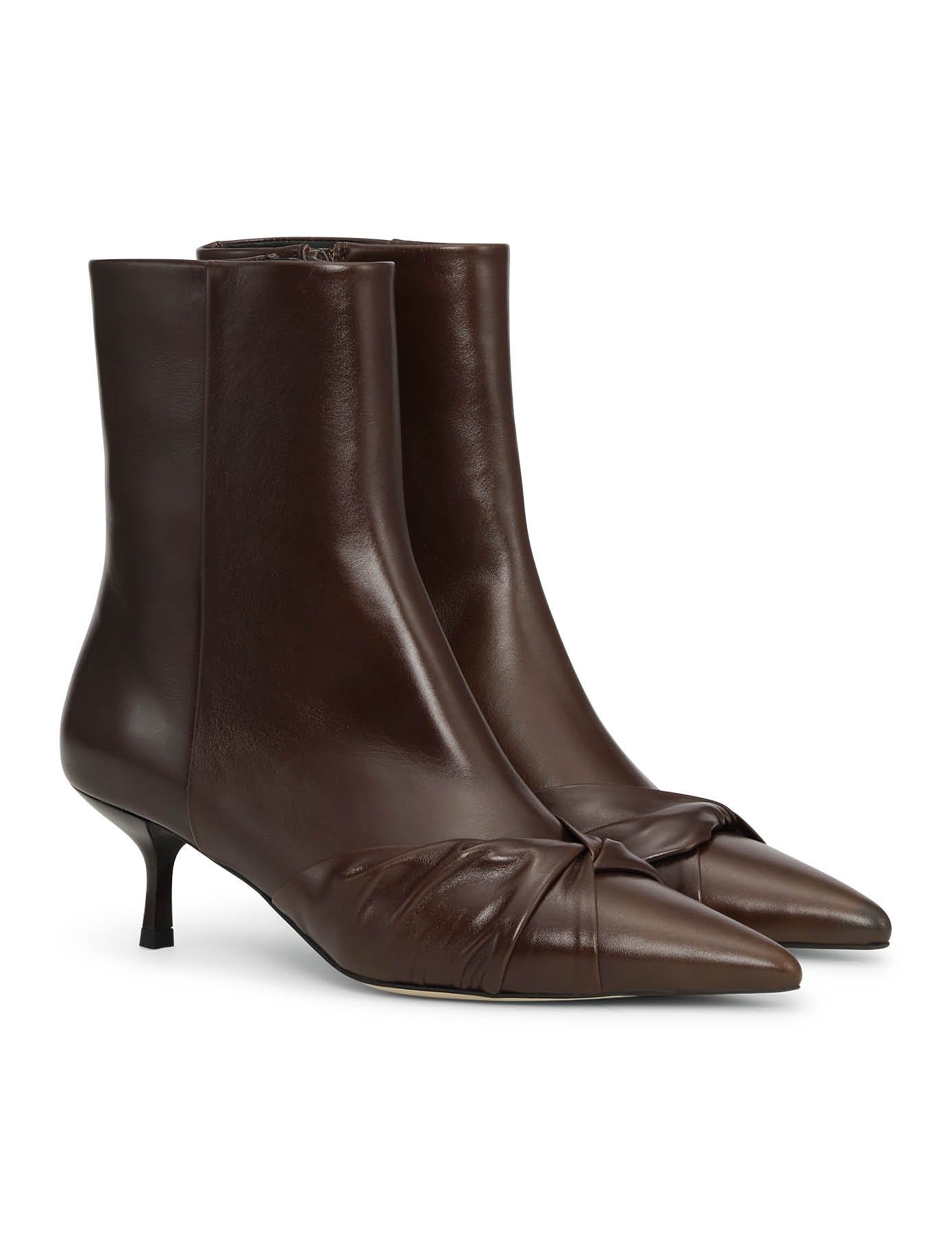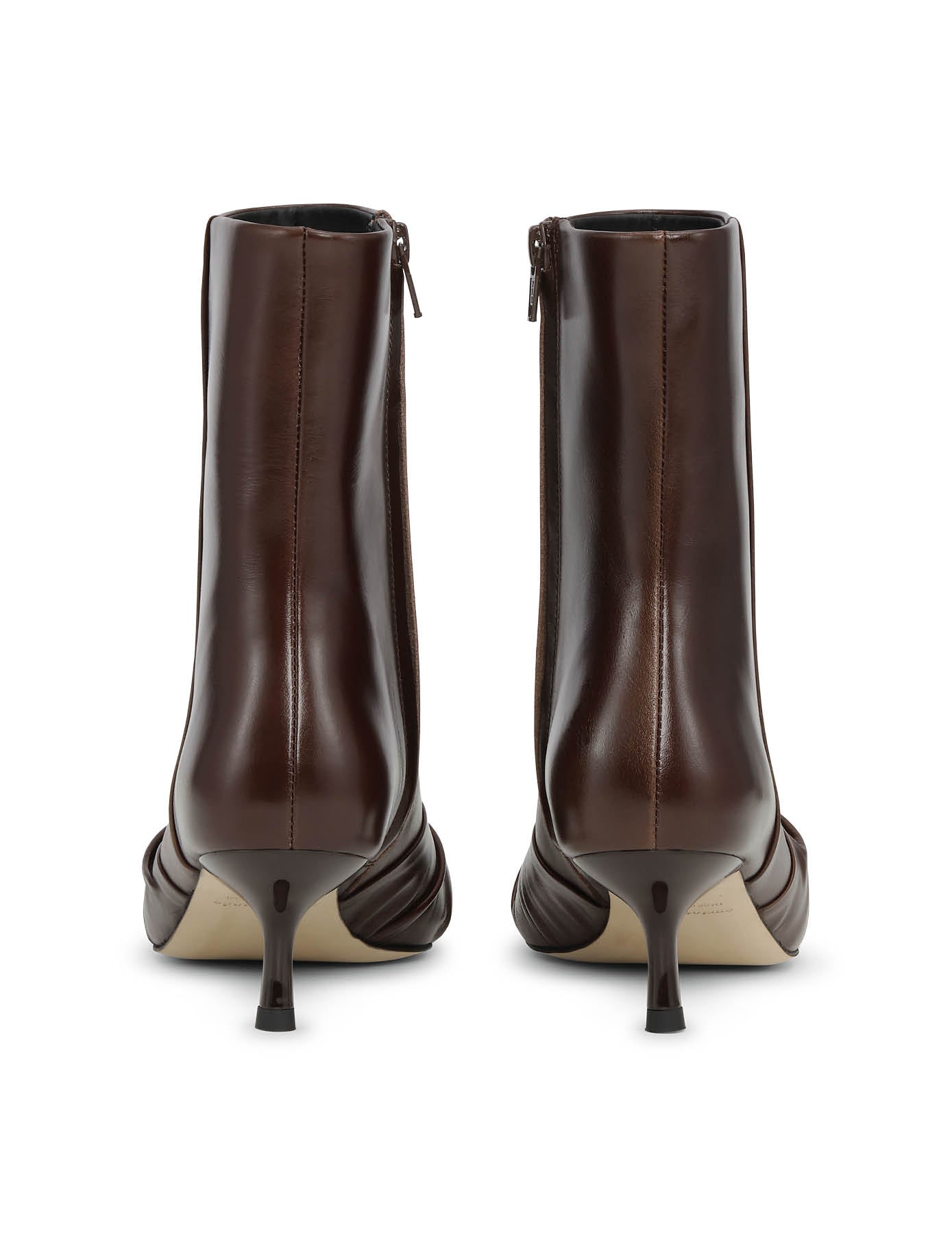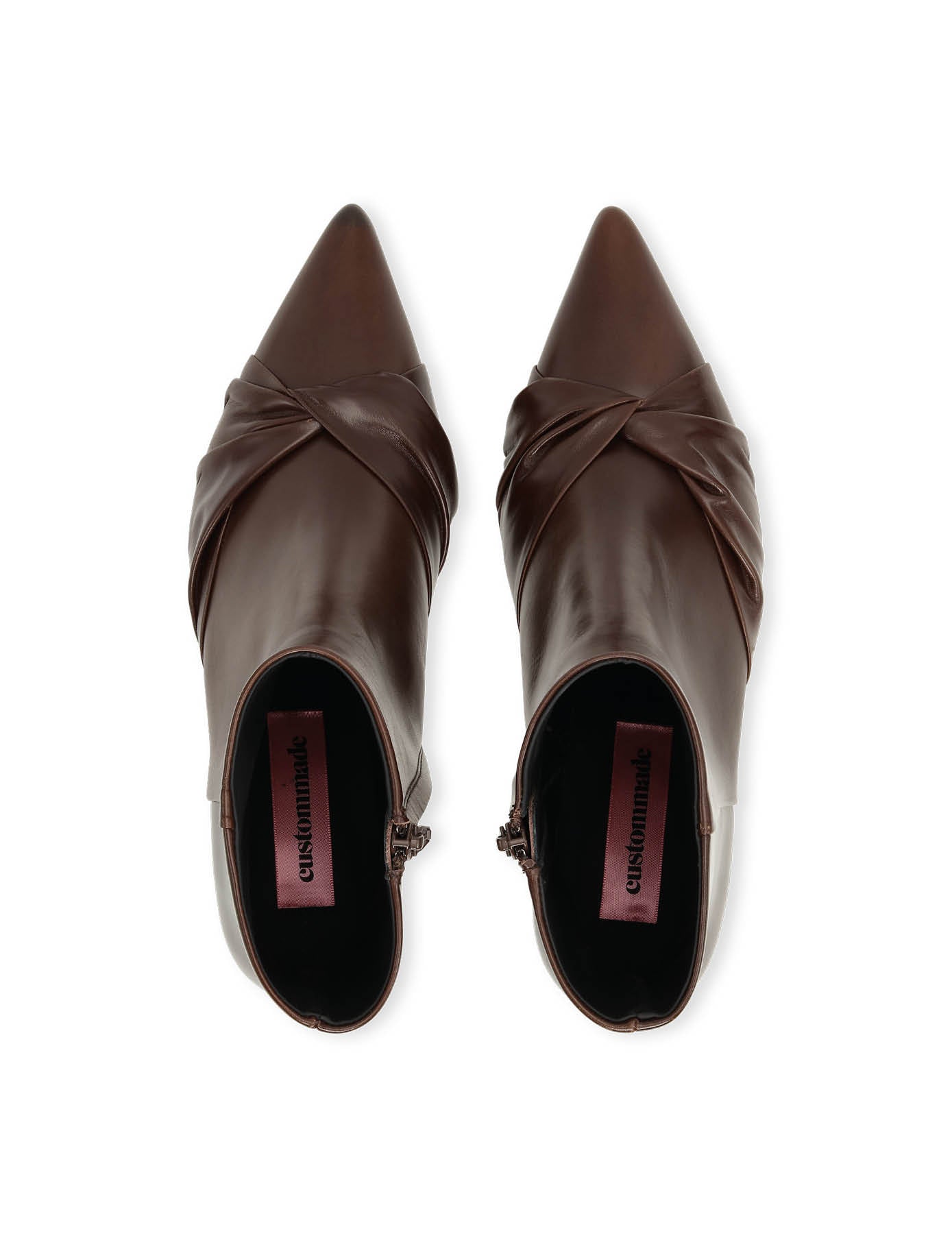 Velissia Chocolate fra Custommade. Velissia er ankelstøvelen som trer inn i garderoben med en stille autoritet – moderne, elegant og med en myk styrke i uttrykket. Silhuetten er ren og sofistikert, formet i glatt, sjokoladebrunt skinn med en naturlig glans som fanger lyset uten å overdrive. Over vristen samles skinnet i en subtil vridd detalj, som en diskret knutetekstur som gir skoen dybde og karakter. En detalj som gjør henne unik, uten å rope om oppmerksomhet.