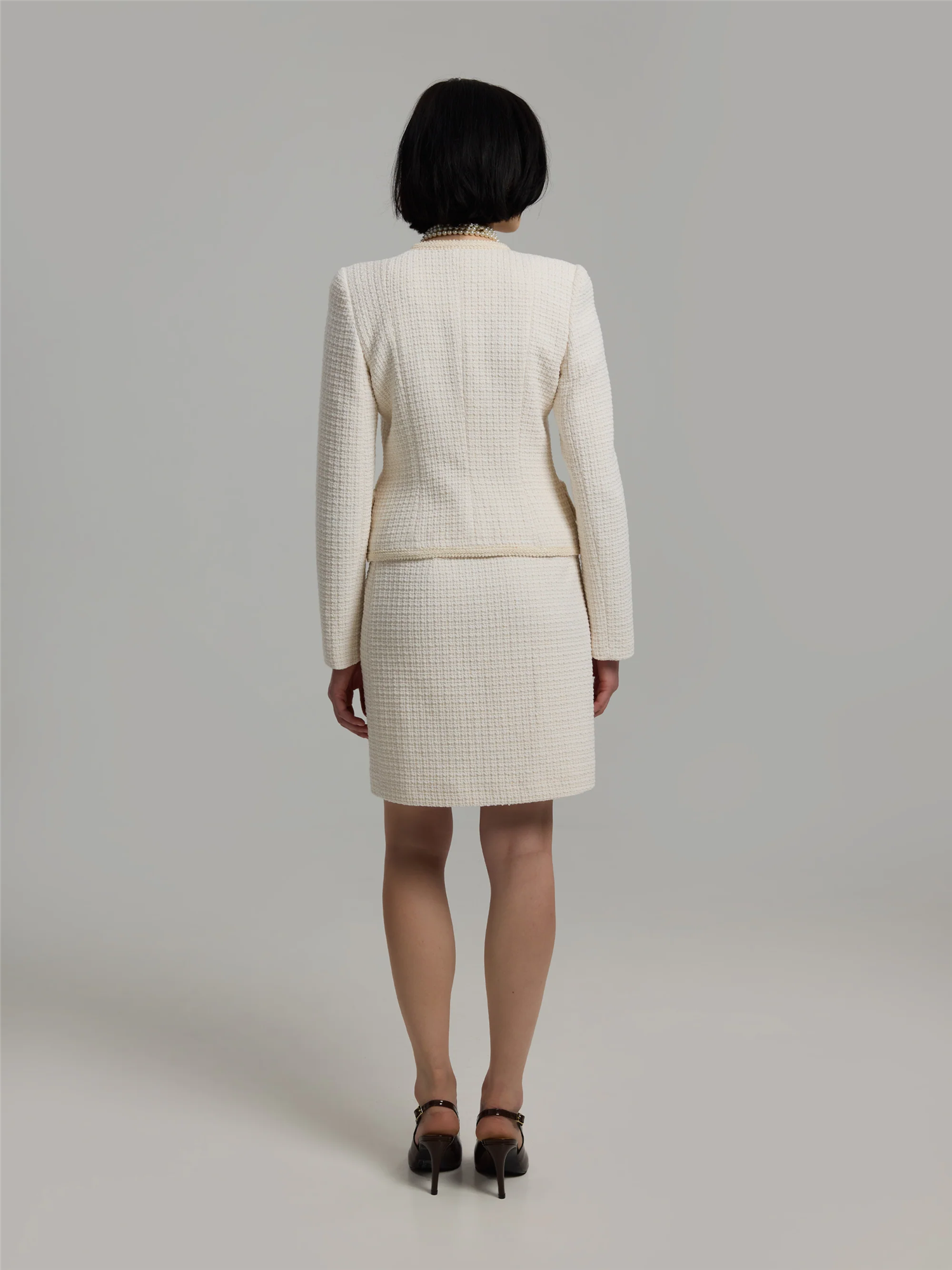 Lesley Blazer White fra Andiata. En klassisk bouclé-blazer laget av italiensk stoff i en delikat hvit-farge. Med en tettsittende silhuett, lange ermer og rund halsutringning skaper den et tidløst utseende. Gullfargede knapper og dekorative fuskelommer fullfører stilen. Style med matchende Celia-skjørt for en komplett look.