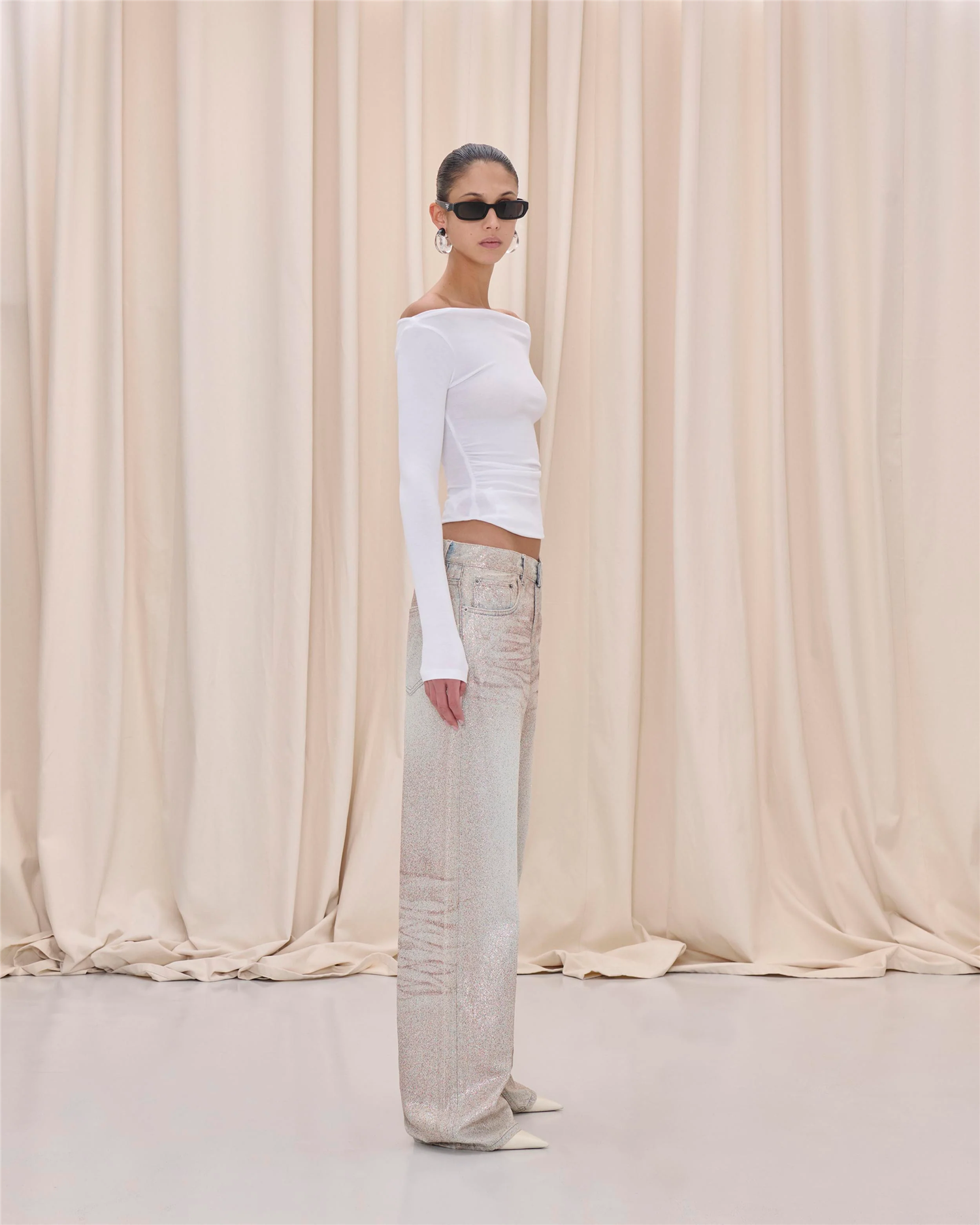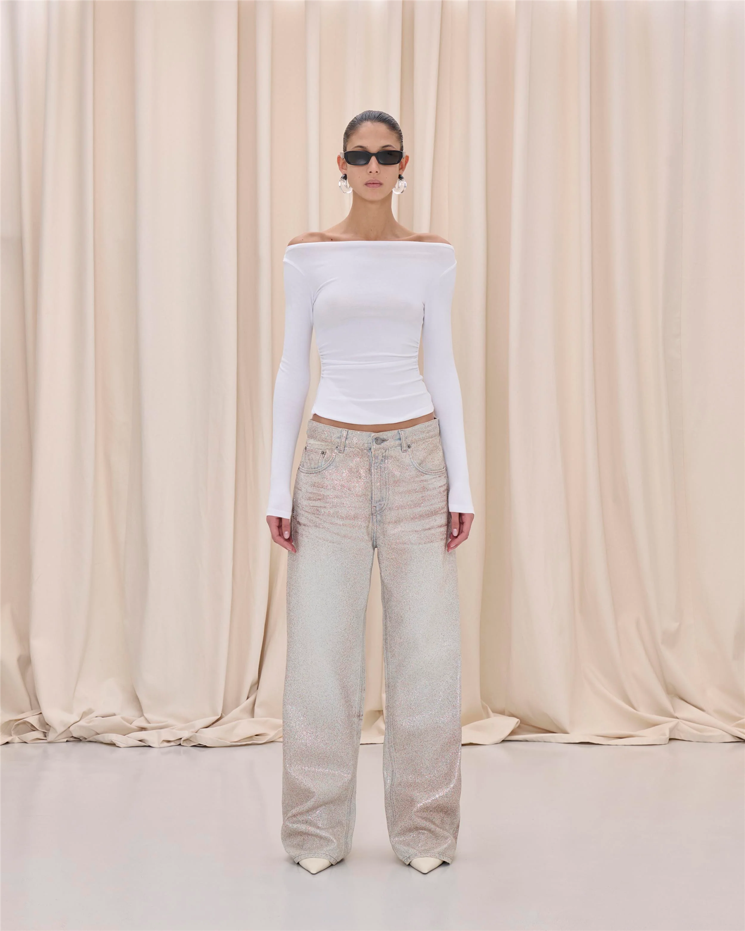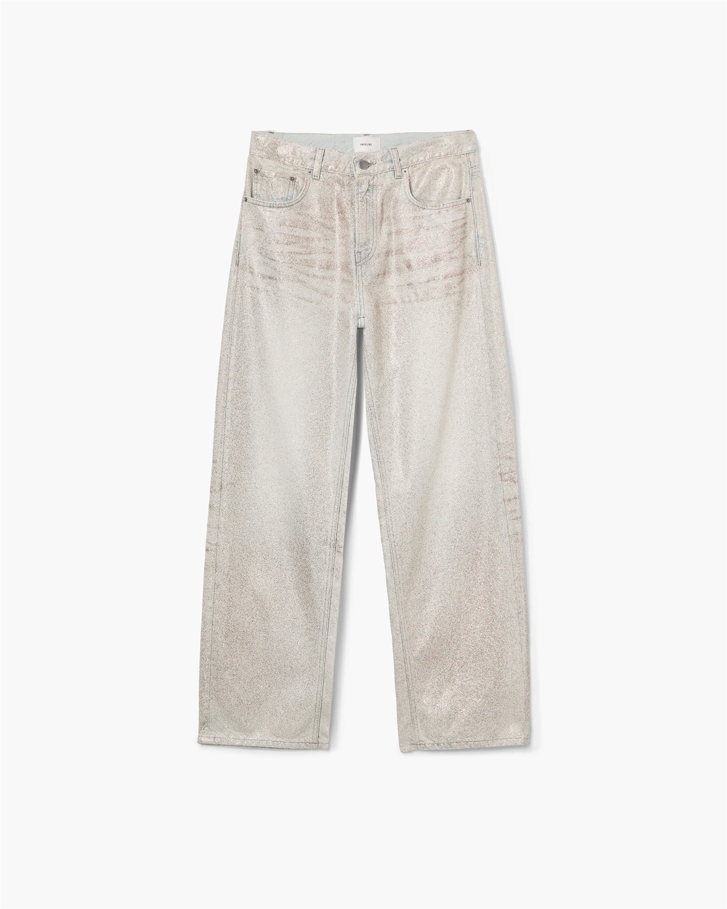 Bonnie Denim Glam fra Haikure. Sesongens råeste bukse er her. En jeans i sølv med en oversized passform. Den har rette ben, avslappet midje og sitter løst. Bruk den sammen med matchende jakke for en komplett og cool look. Eller style den med en enklere genser og sneakers for en mer avslappet look.