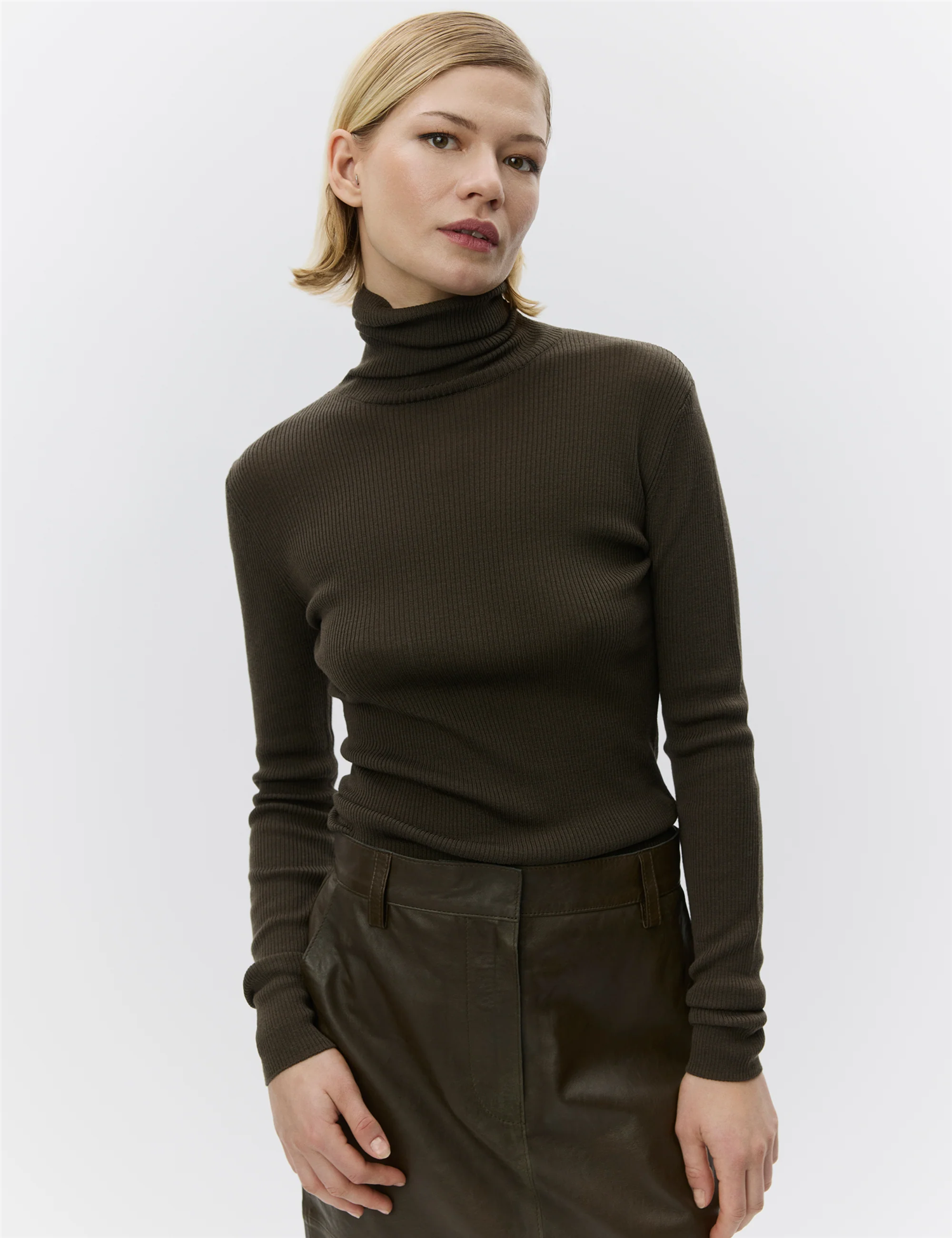 Sierra Sweater Wren fra DAY Birger et Mikkelsen. En klassisk ribbestrikket polo i 100% merinoull. Genseren har en smal passform og høy hals. En perfekt genser å ha i basegarderoben til kaldere dager.
