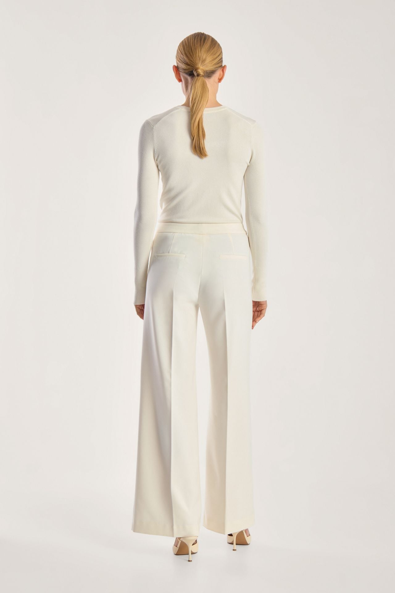 Bridget Pants Off White fra Seductive. Bridget er en elegant bukse med vide ben og en sofistikert silhuett som faller vakkert fra hoften og ned. Den har middels liv og en flatterende passform som gir et balansert og feminint uttrykk. De dekorative knappene i front tilfører et klassisk, nesten maritimt preg, mens pressfoldene understreker den lange og rene linjen.