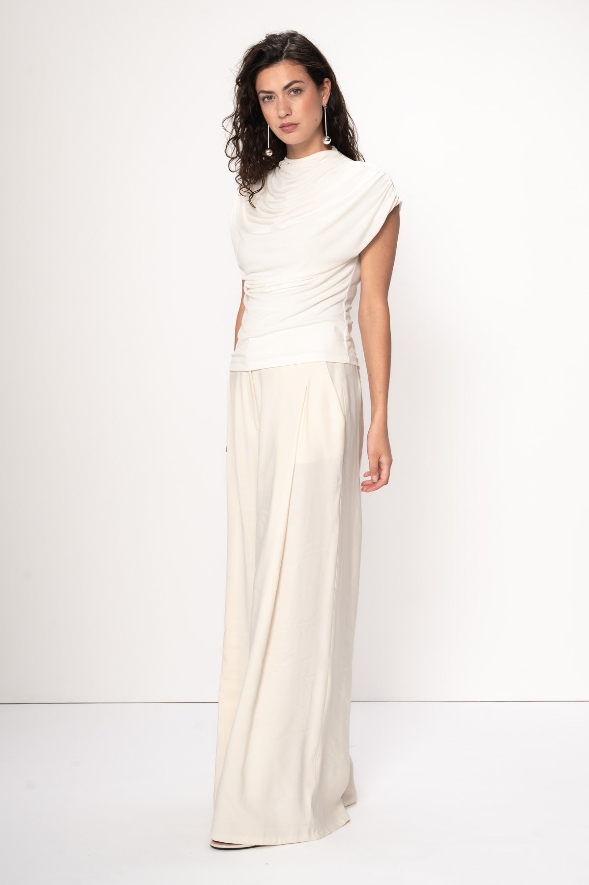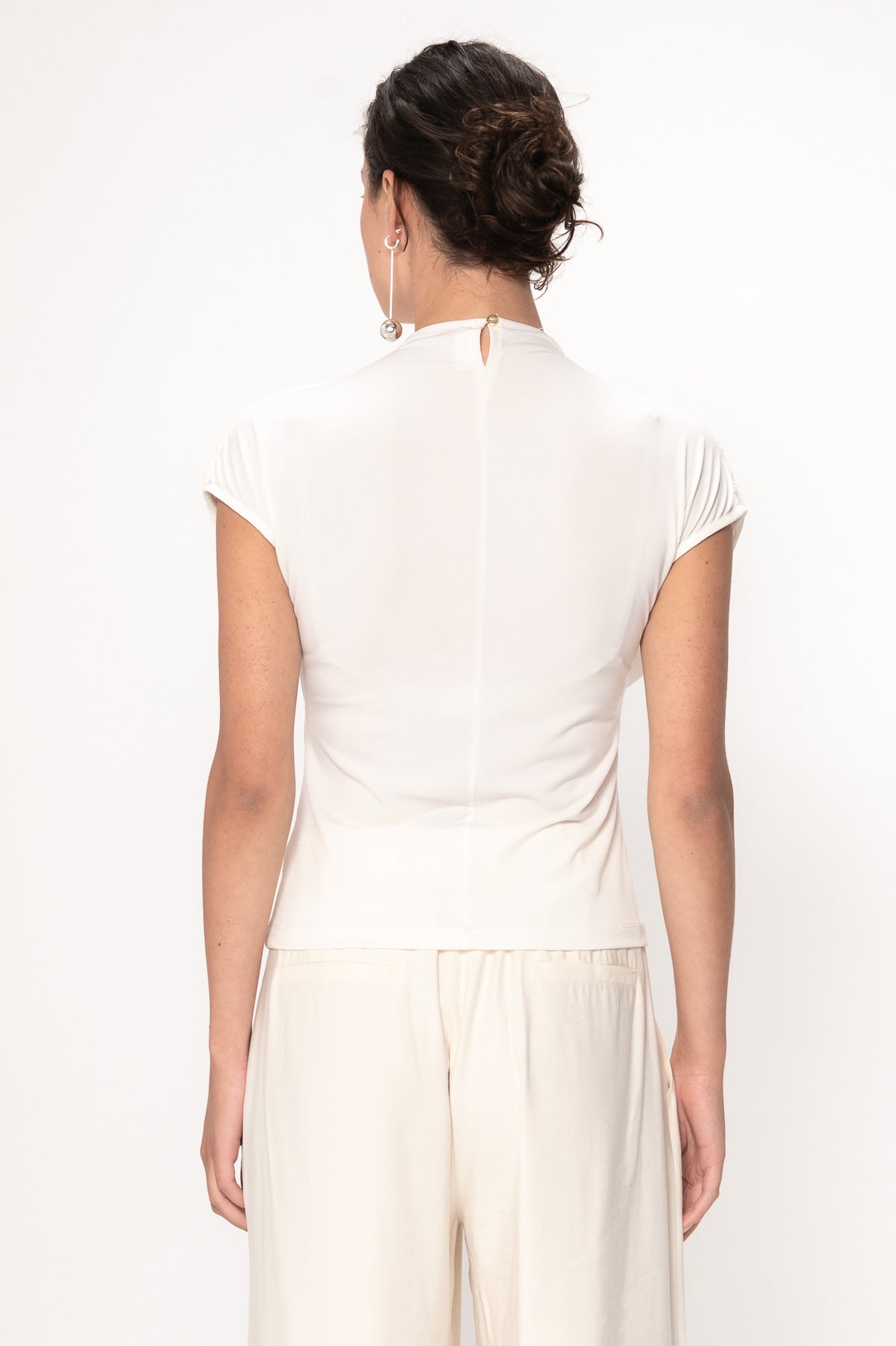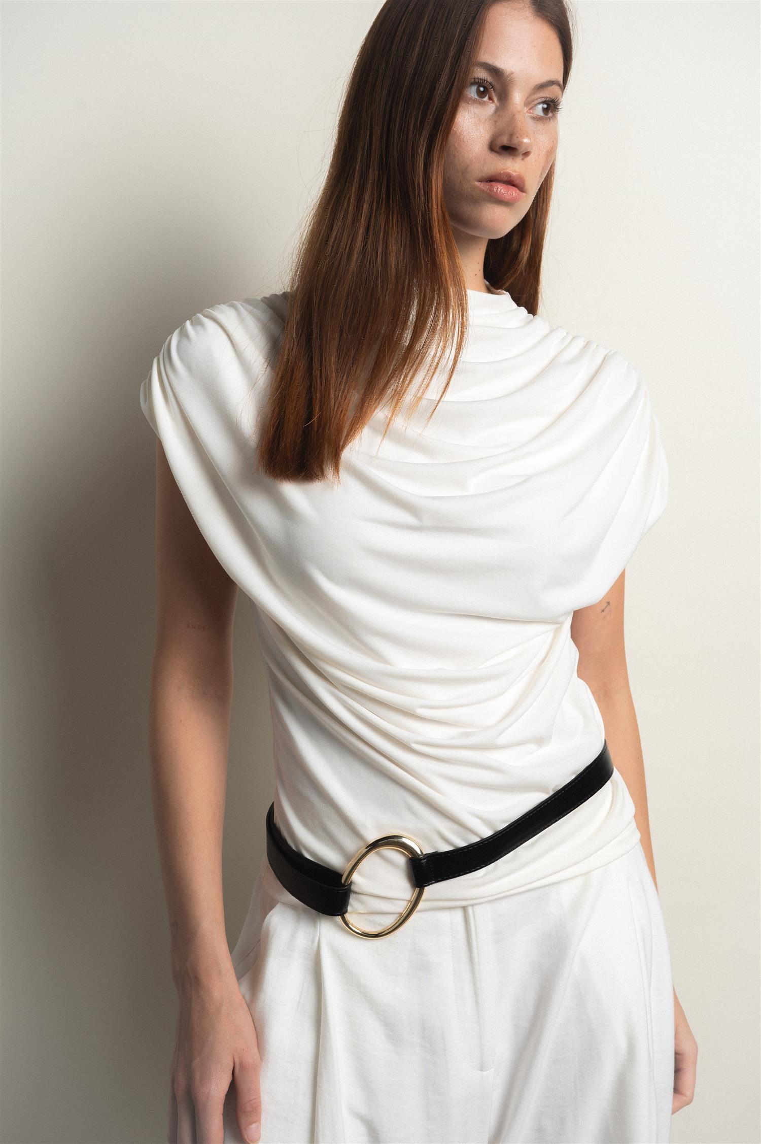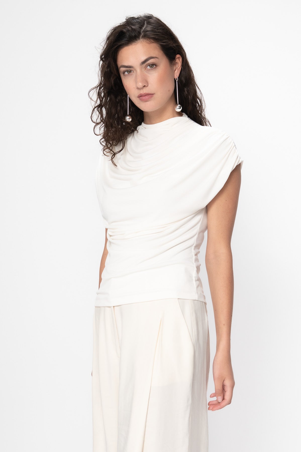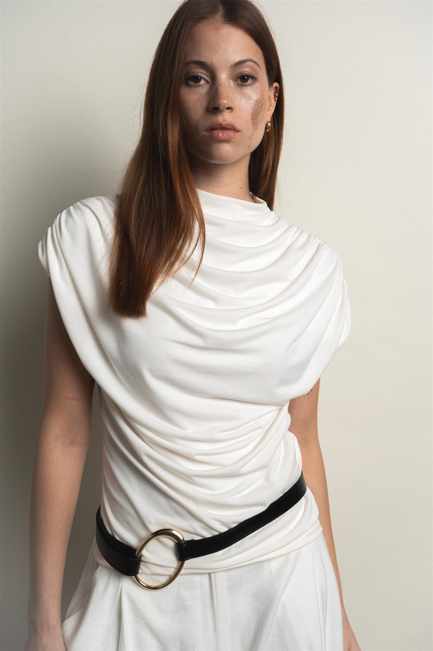 Raza top fra VIVEH er en cap-sleeve topp med en middels høy turtleneck utringning og delikate draperinger over brystet. En elegant og allsidig topp som gjør seg godt i kombinasjon med dressbukser, eller til en avslappet jeans for hverdagslooken.