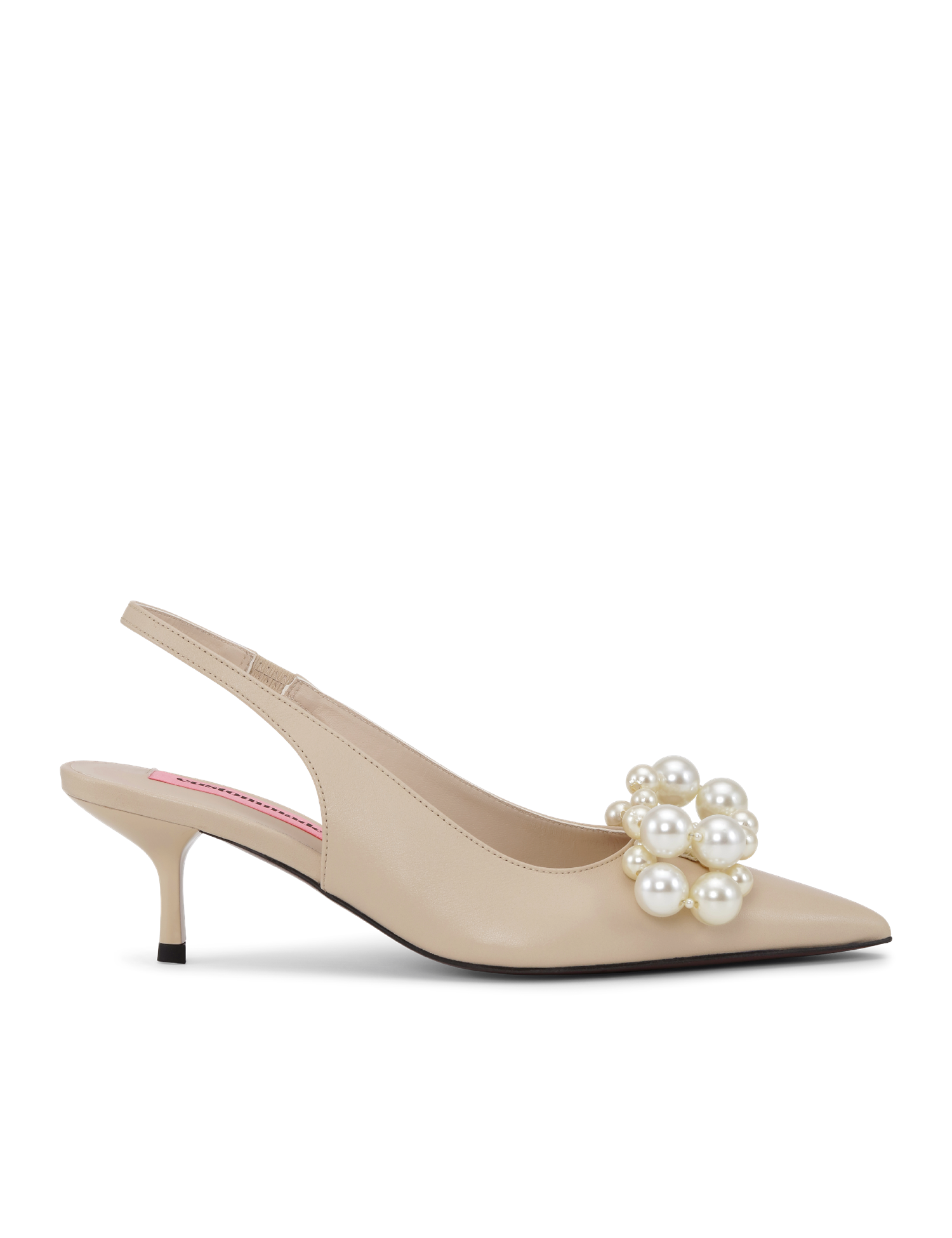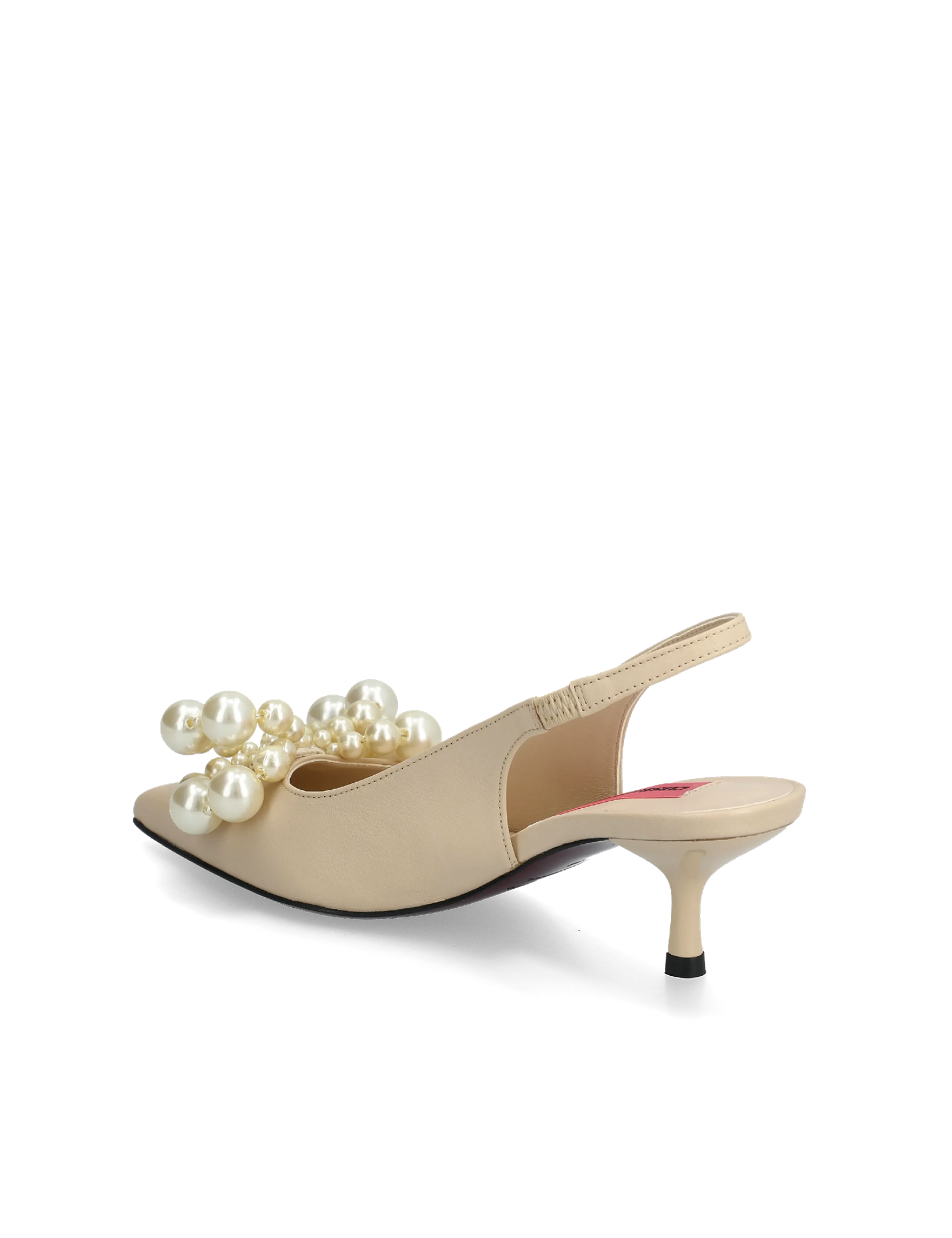 Det mest karakteristiske ved modellen er den dekorative frontdetaljen med perler i ulike størrelser, arrangert i elegante sirkler. Dette gir skoen et luksuriøst uttrykk og tilfører et subtilt statement til antrekket. Den åpne hælen med elastisk slingback gir en komfortabel passform og gjør skoen lett å ta av og på.