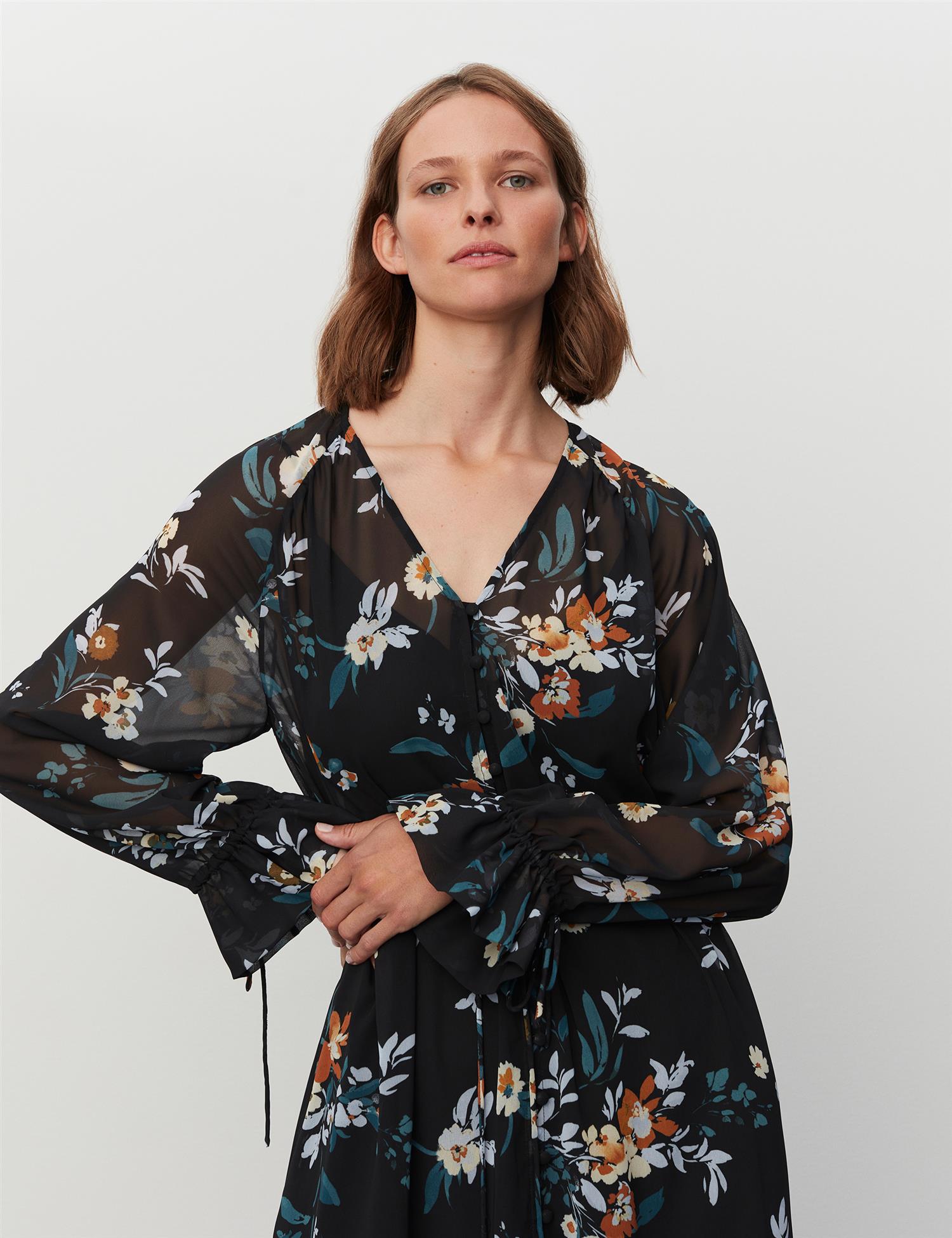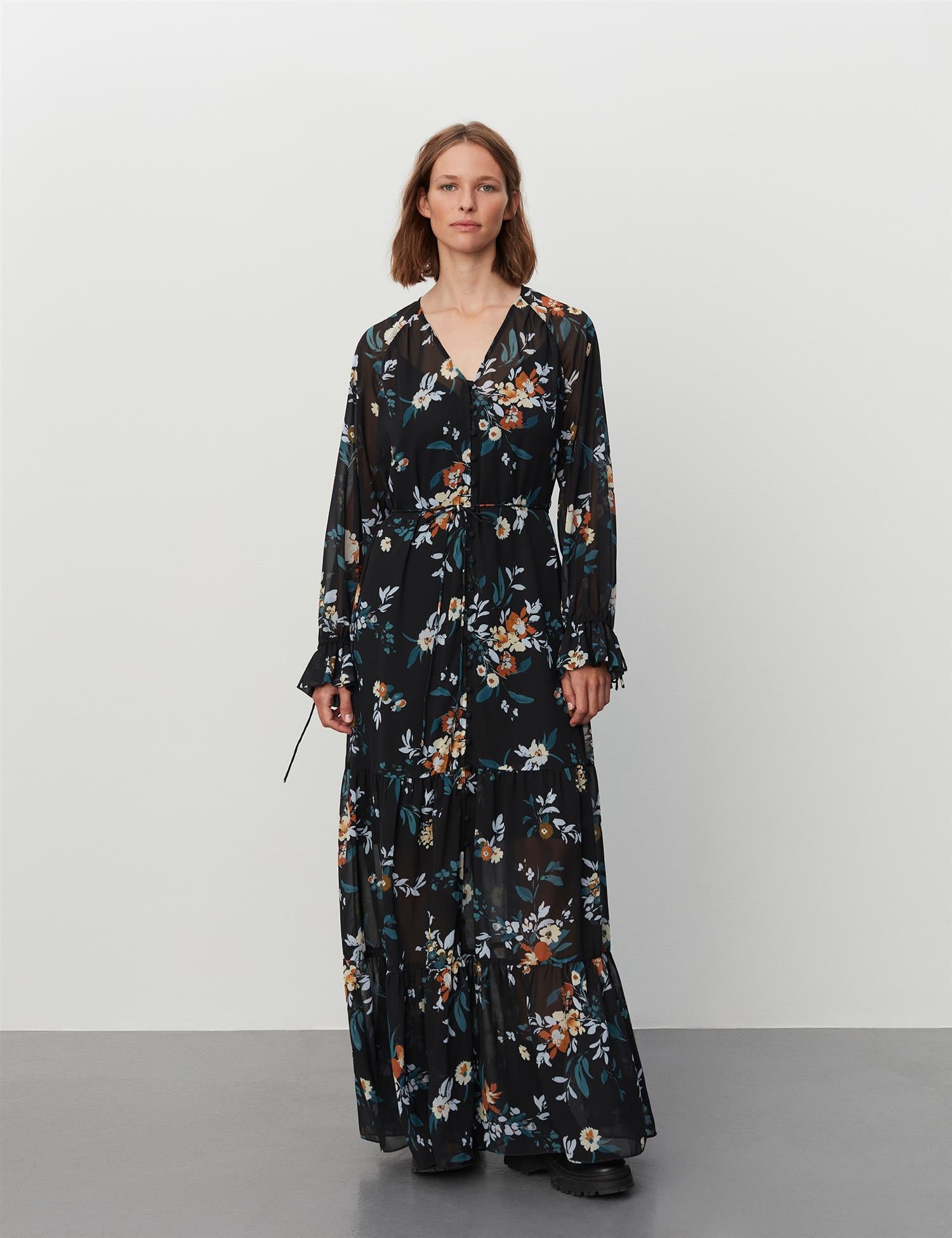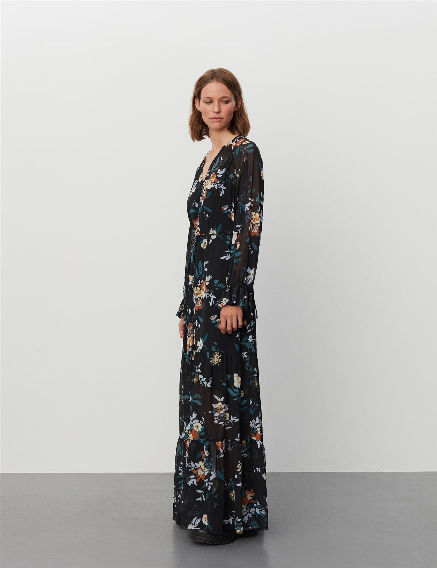 2ND Darisana kjolen er langt, med v-hlas, knapper i front og har belte i livet. Kjolen er i tynt chiffon stoff med blomsterpritnt og en bomull underkjole inni.