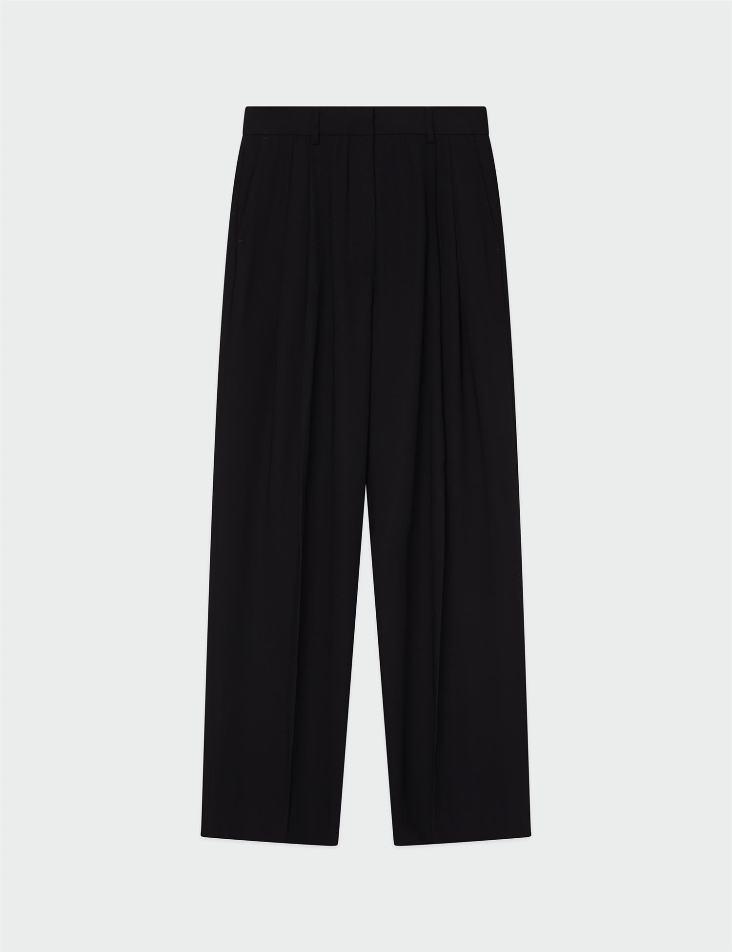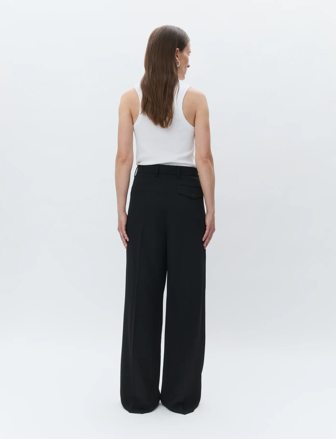 Buksen har et høyt liv, lukkes med hempe og glidelås. Det er rette vide ben med pressekant i front. DAY Enzo buksene er i klassisk sort.