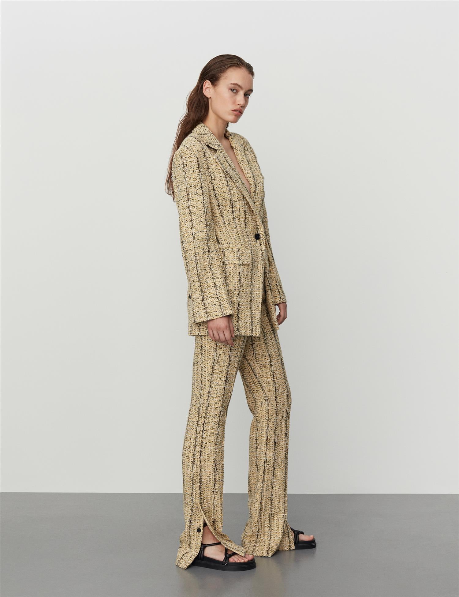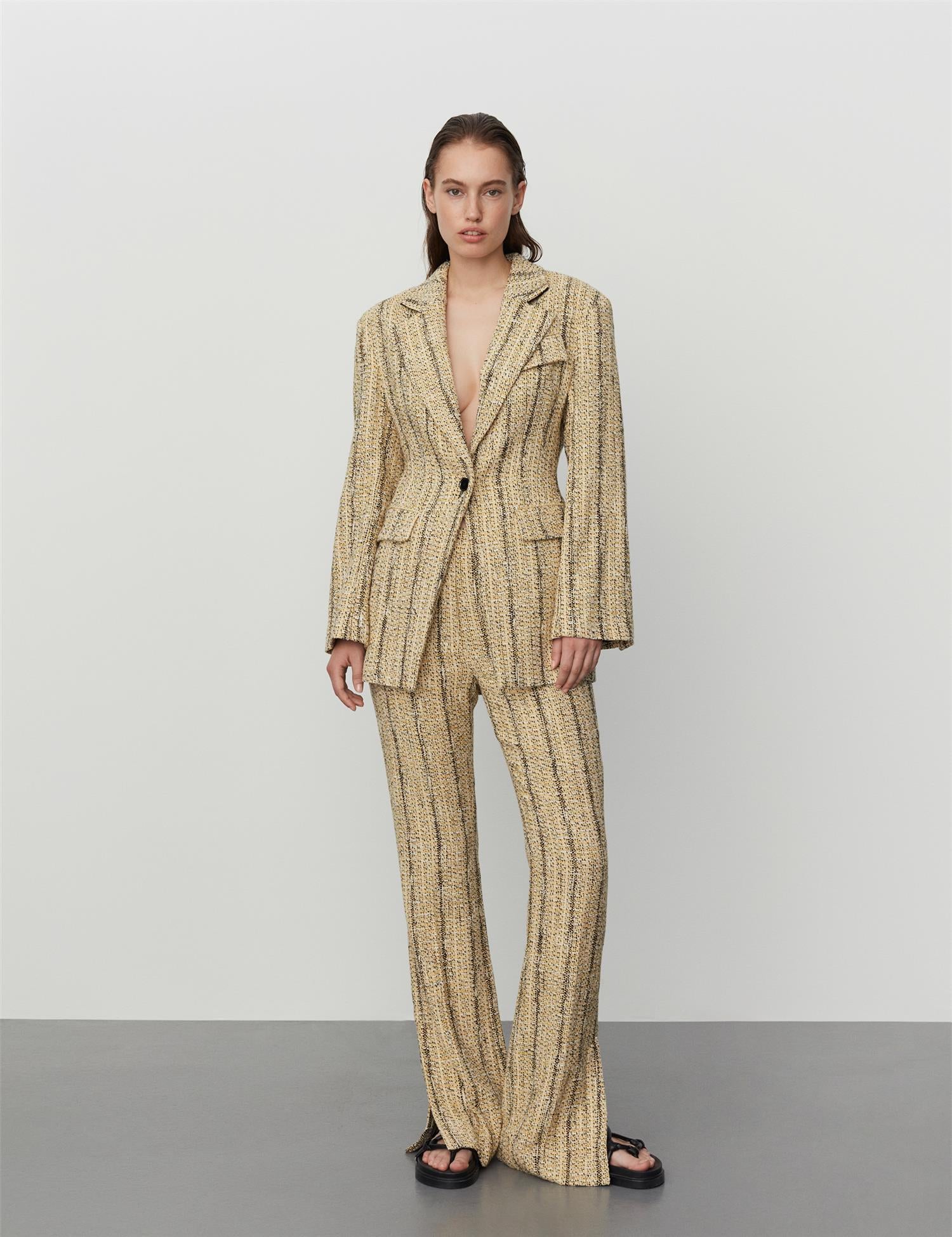 DAY Ines blazeren er en femin blazer med skulderputer og et smalt liv. Blazeren er foret, er tweedet i looken i fargene gul, sort og hvit.