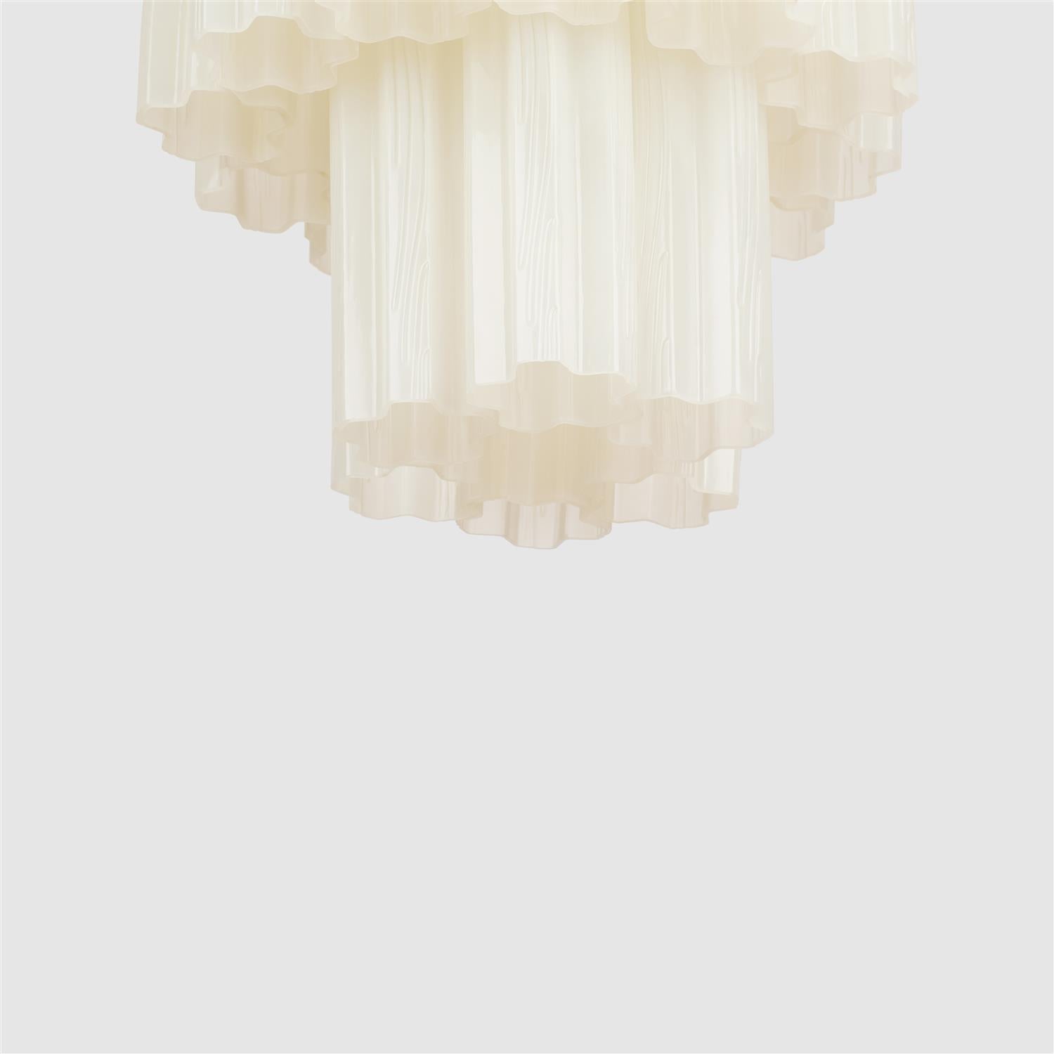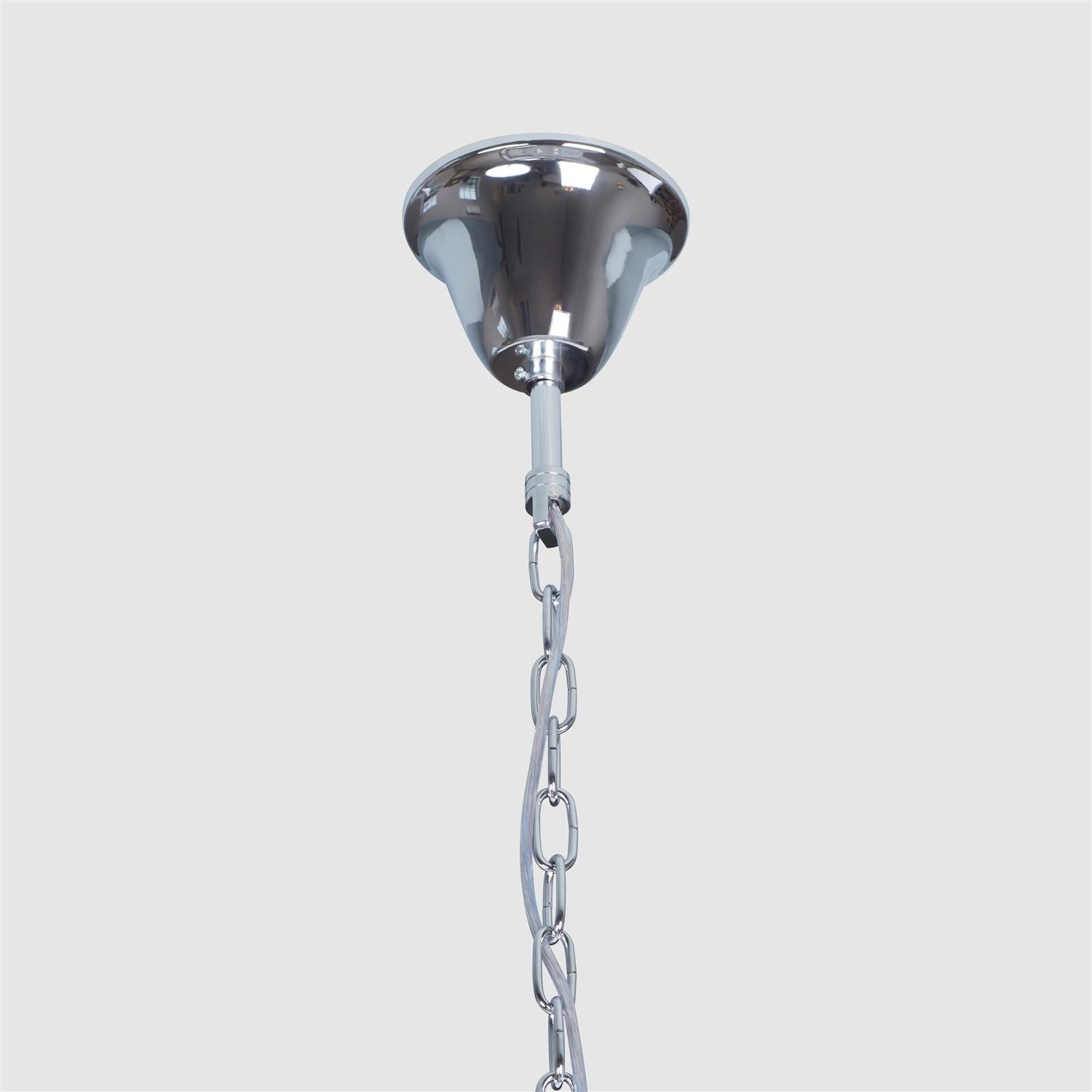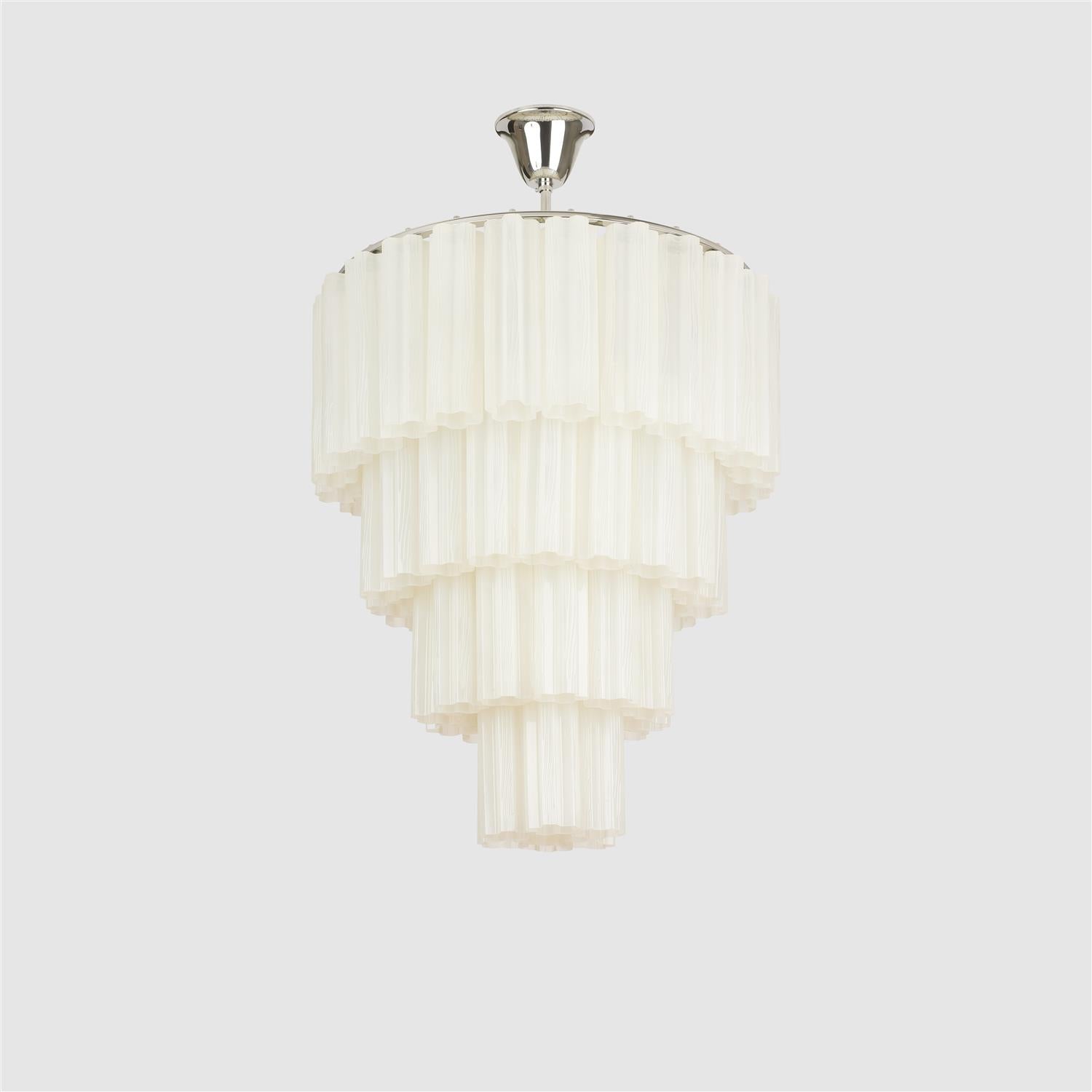 Fontaine Chandelier L White fra det norske merket MEUBLE. Et smykke i hjemmet. Lampen har fire "lag" og blir smalere og smalere for hver lag. Den er 77 cm lang og har en diameter på 65 cm øverst. Festet er laget av metal chrome.