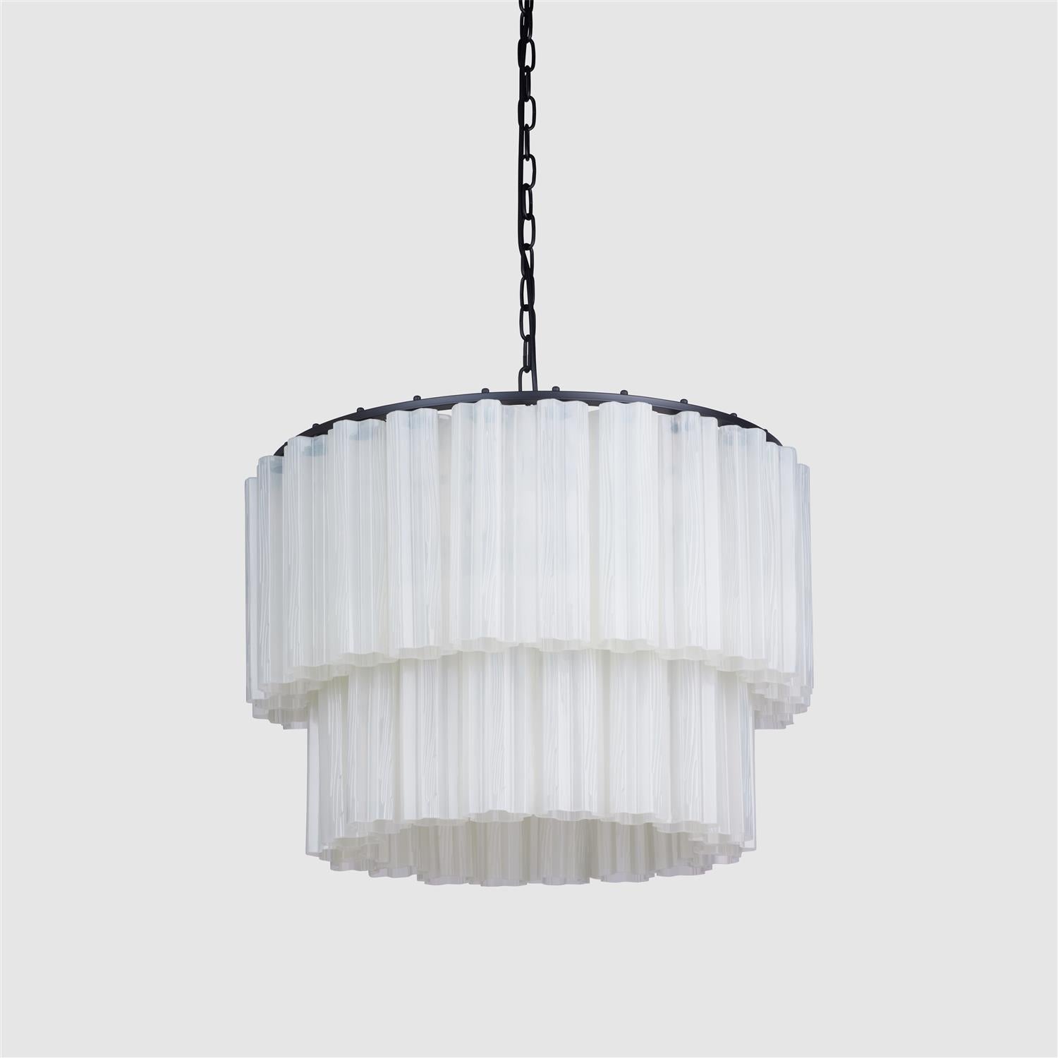 Fontaine Chandelier S White fra det norske merket MEUBLE. Et smykke i hjemmet. Lampen har to "lag" og et bredt øverst og et litt smalere under. Den er 45 cm lang og har en diameter på 65 cm øverst. Festet er laget av sort metal.