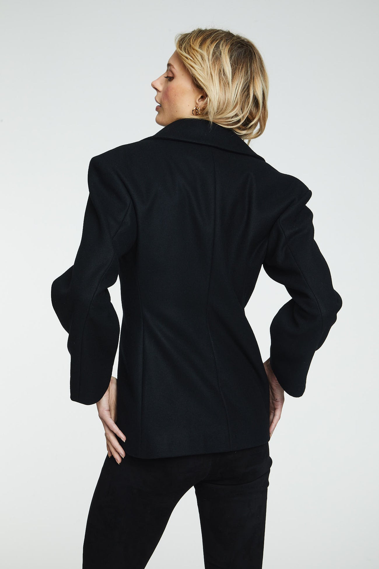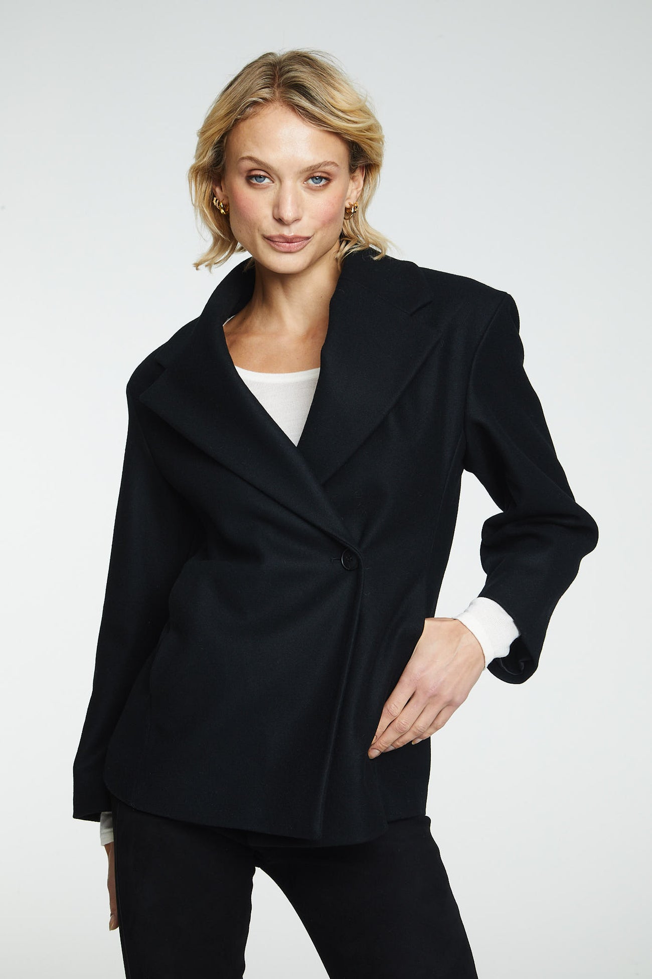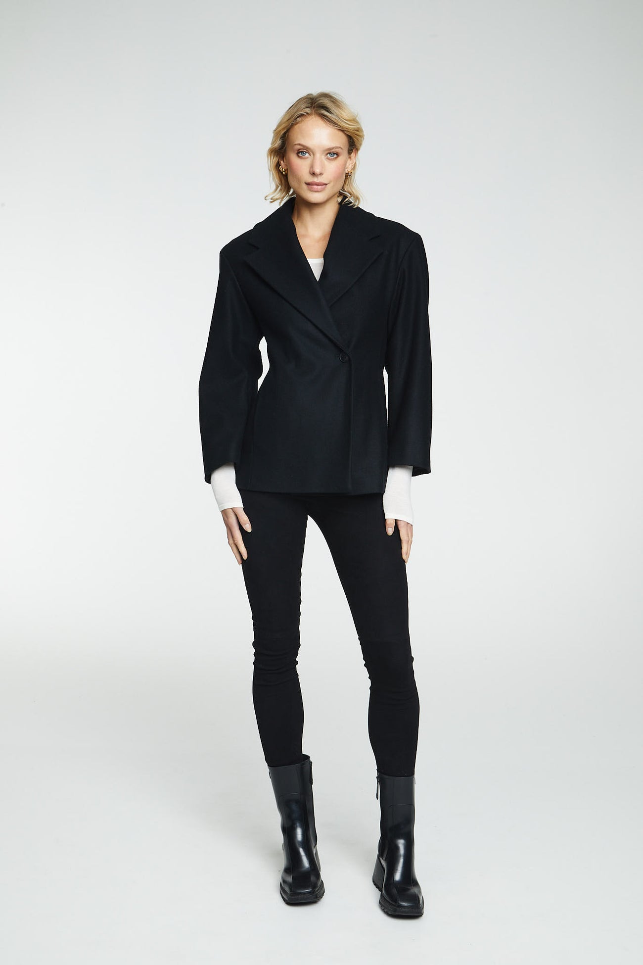 Wool Jacket Black fra norske The Product i samarbeid med Vanessa Rudjord. En oversized blazer jakke i 100% ull. Den er designet av Vanessa Rudjord, og produsert i Italia. Jakken har kort lengde med blazer detaljer og lukkes med en knapp foran. Den er ment for å ha en oversized look. Perfekt for å holde deg varm på de kaldere dagene. Dette er en jakke du kan bruke år etter år.