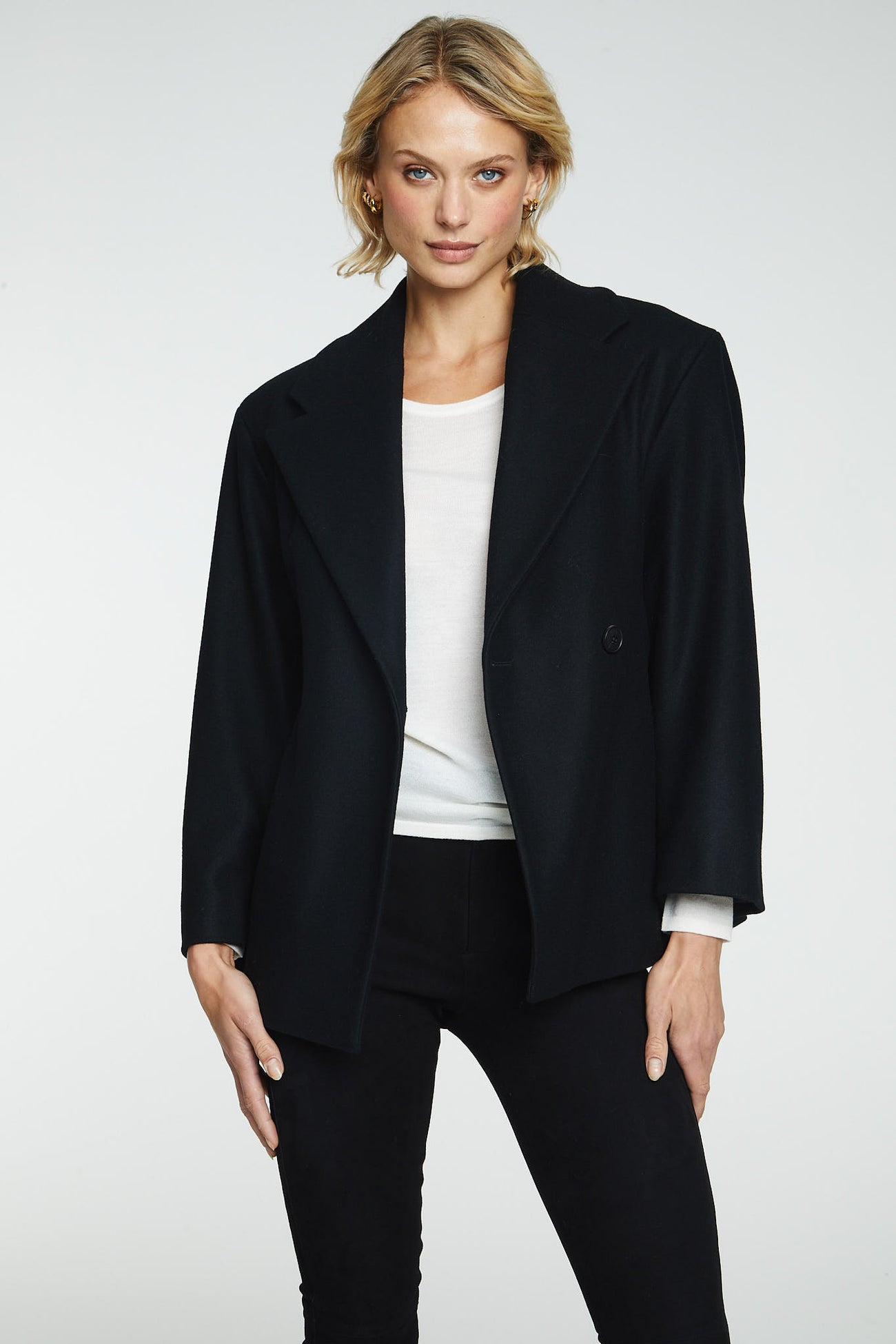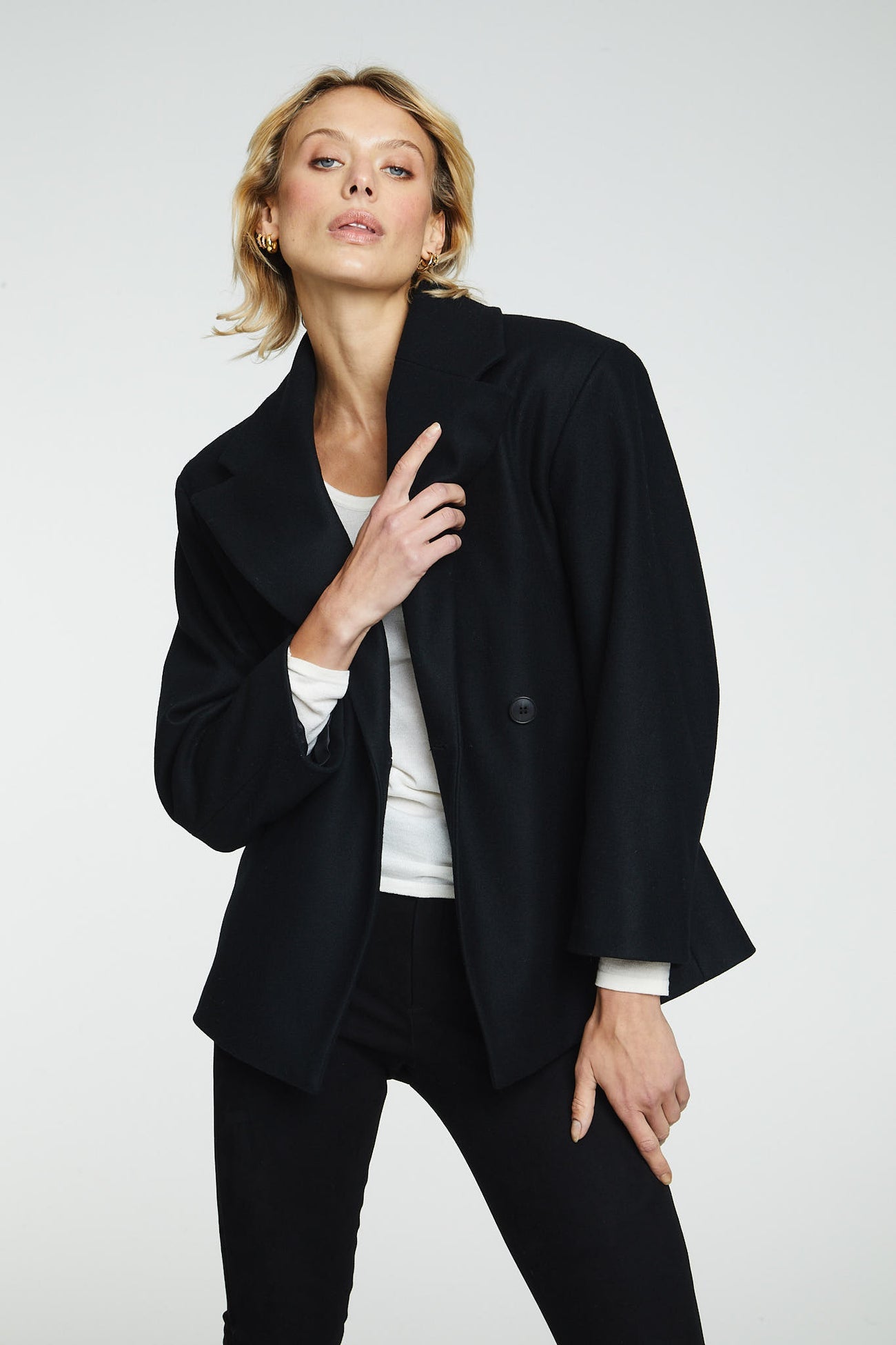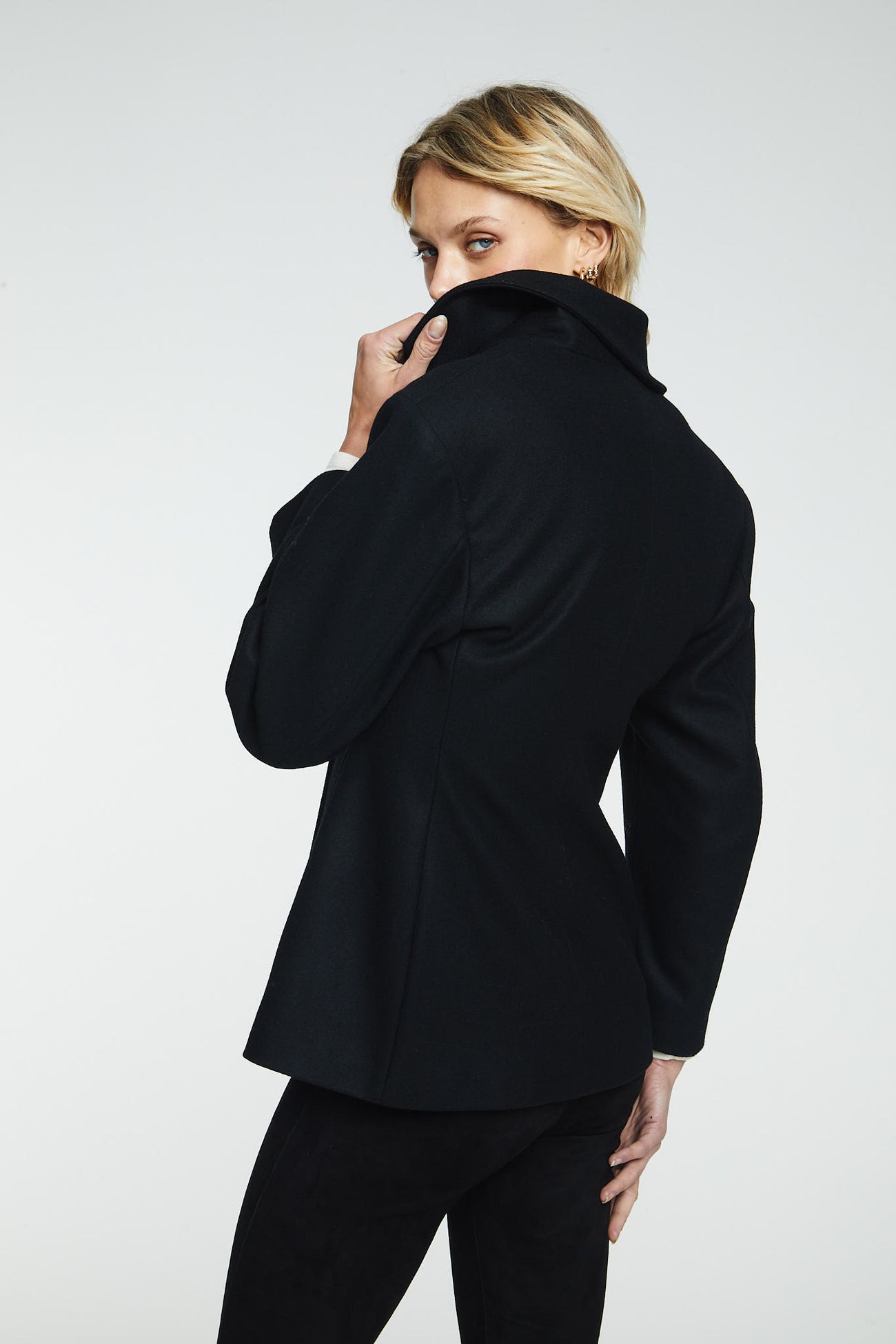Wool Jacket Black fra norske The Product i samarbeid med Vanessa Rudjord. En oversized blazer jakke i 100% ull. Den er designet av Vanessa Rudjord, og produsert i Italia. Jakken har kort lengde med blazer detaljer og lukkes med en knapp foran. Den er ment for å ha en oversized look. Perfekt for å holde deg varm på de kaldere dagene. Dette er en jakke du kan bruke år etter år.