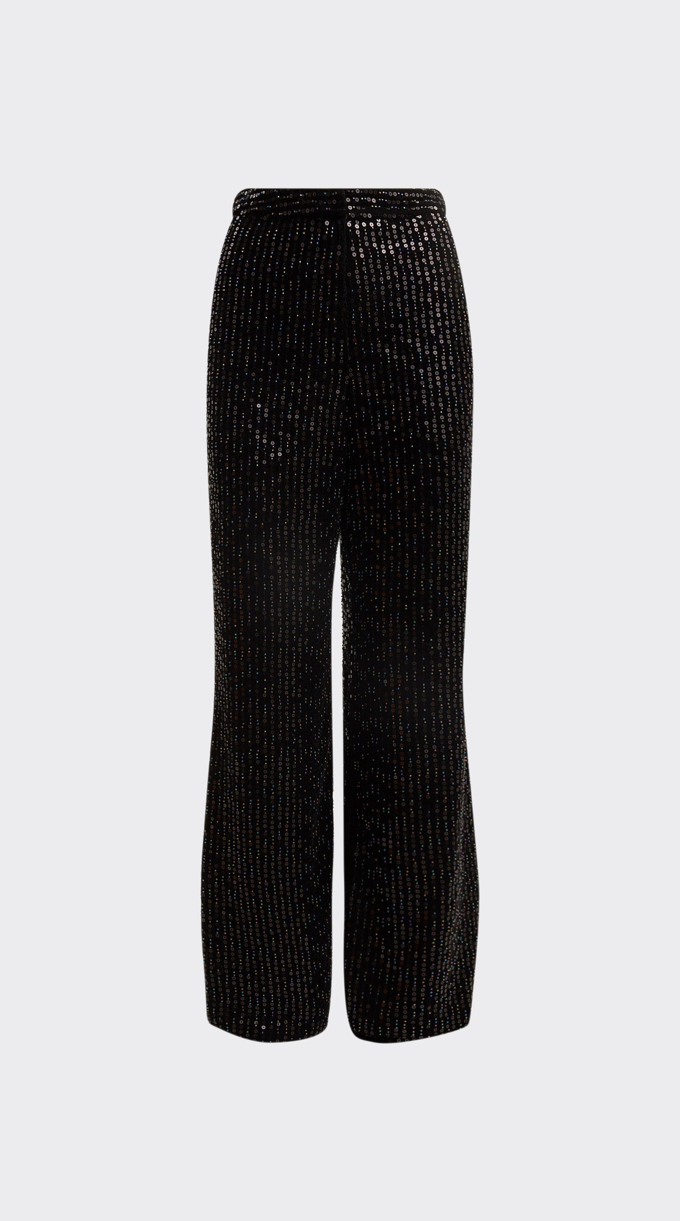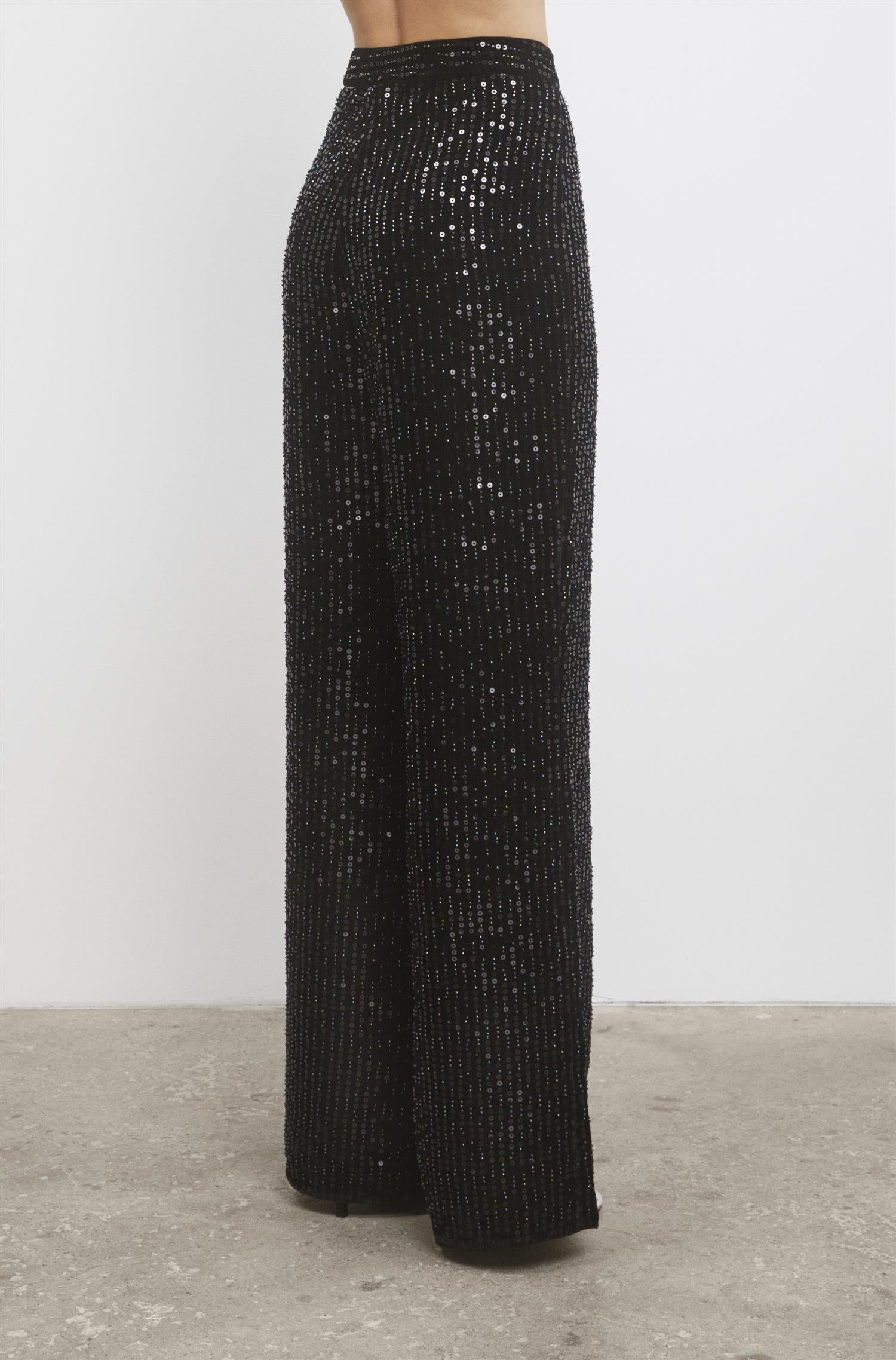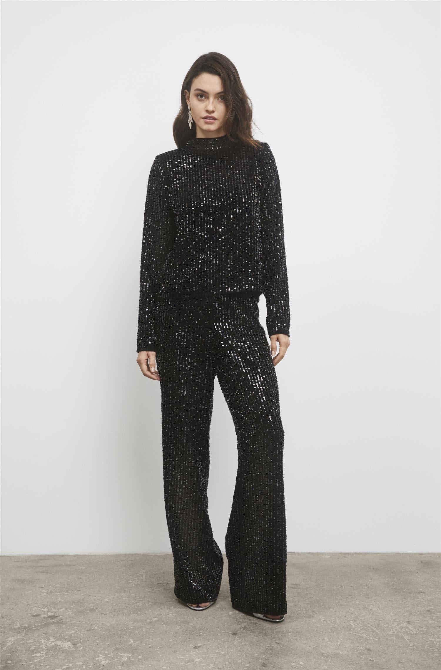 Jagger Sequin Trouser Black fra Camilla Pihl. Buksen er laget i et fløyelsmateriale i bunn med paljetter over hele buksen. Den har en løs passform med lange, rette ben. Buksen er laget i 34-lengde. Den lukkes foran med glidelås og gylf. Dette er buksen vi vil bruke på årets festligheter.