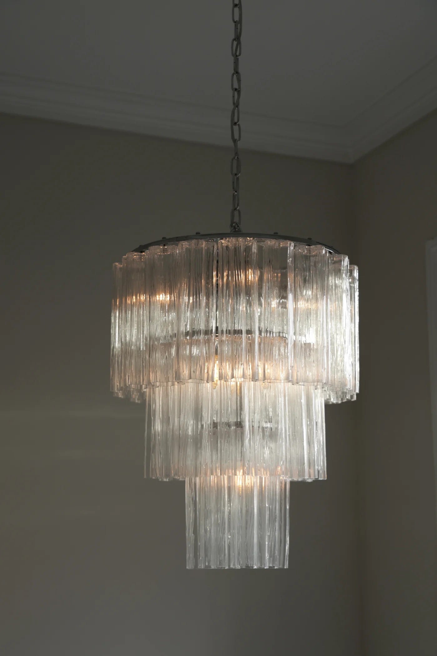 Fontaine Chandelier M Clear fra det norske merket MEUBLE. Et smykke i hjemmet. Lampen har tre "lag" og blir smalere og smalere for hver lag. Den er 61 cm lang og har en diameter på 50 cm øverst. Festet er laget av metal chrome.