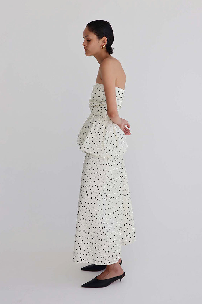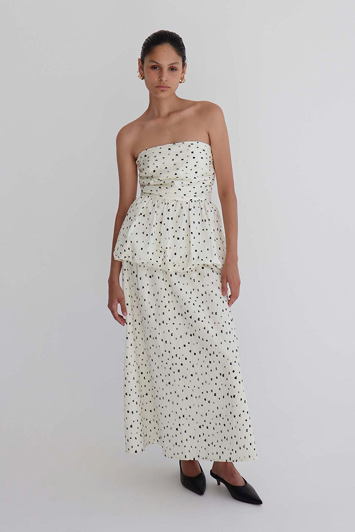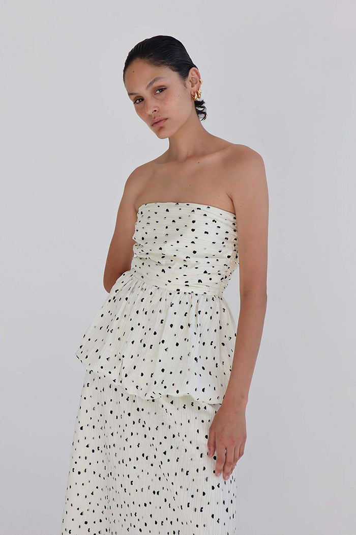 Tiffany Top White fra Blanca. Sesongens must-have for deg som elsker det lille ekstra. Tiffany Top er toppen som gjør antrekket. Toppen er en tube-topp som er smal øverst med peplum lenger ned. Den har hvit bunn med sorte prikker. Style toppen sammen med din favoritt jeans for å tone ned, eller med et skjørt til finere anledninger.